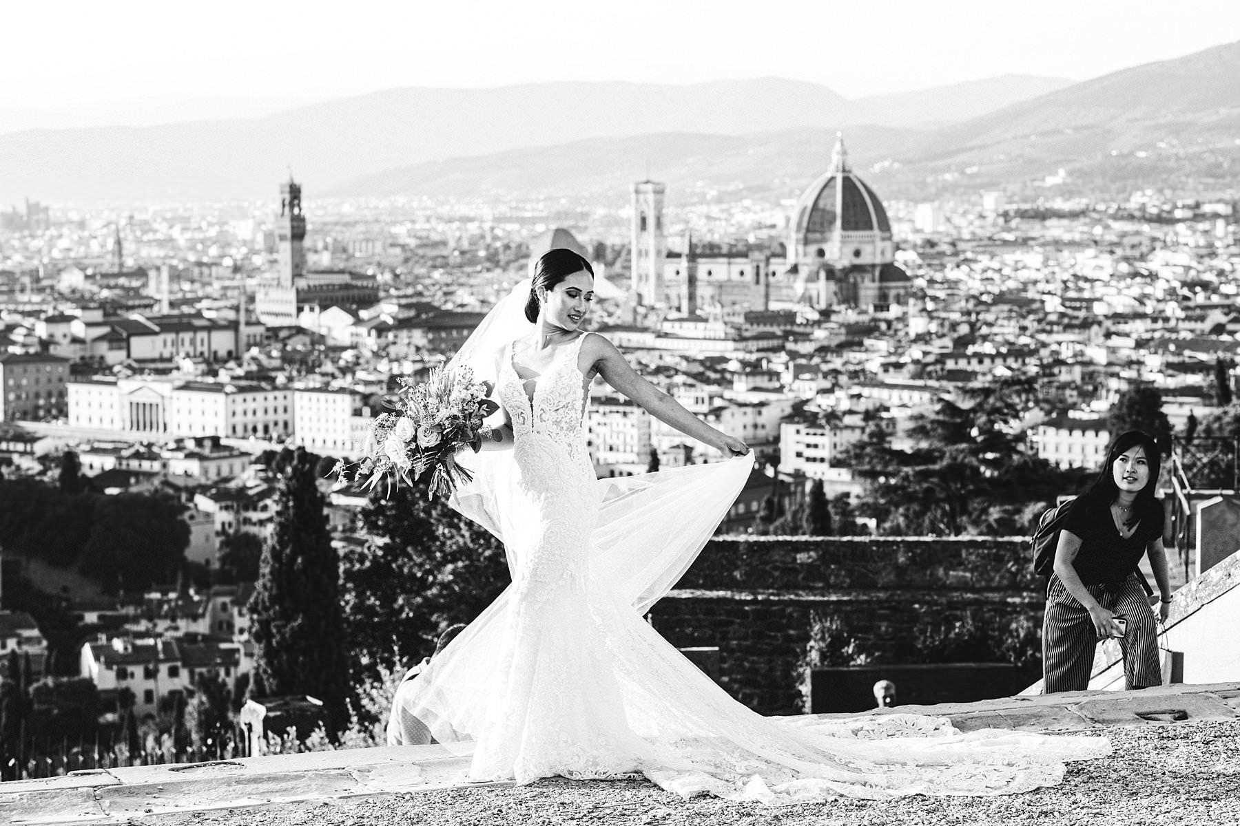 Lovely bride in her luxury Martina Liana wedding dress at the most breathtaking panoramic spot of Florence near Piazzale Michelangelo. Intimate destination wedding in Florence with reception at Belmond Villa San Michele. Photo by the Italian elegant creative and modern destination wedding photographer in Tuscany based Florence Gabriele Fani.