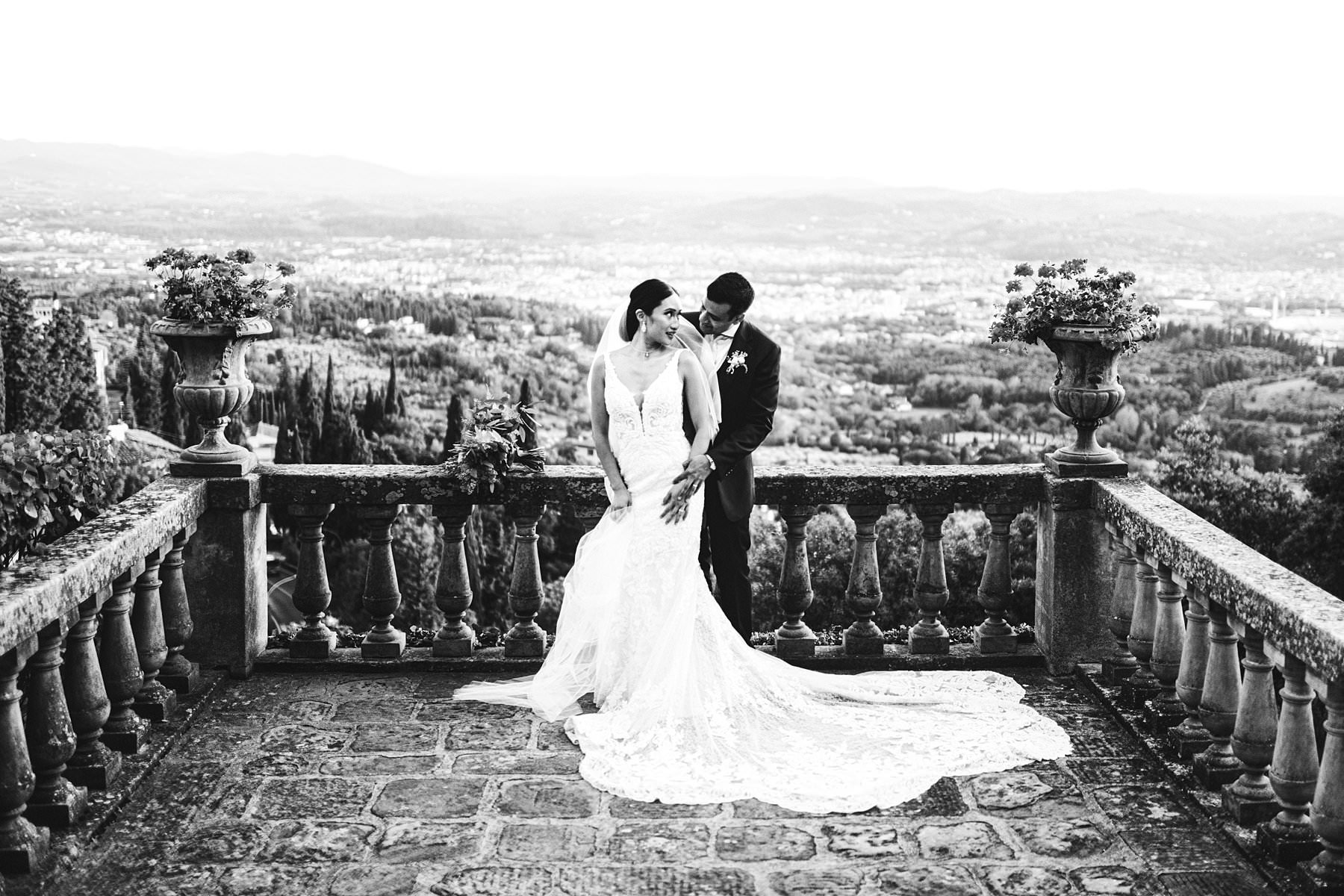 Bride and groom portrait in one of the most scenic spots of Florence at San Miniato al Monte very near to Piazzale Michelangelo. Photo by the Italian elegant creative and modern destination wedding photographer in Tuscany based Florence Gabriele Fani.