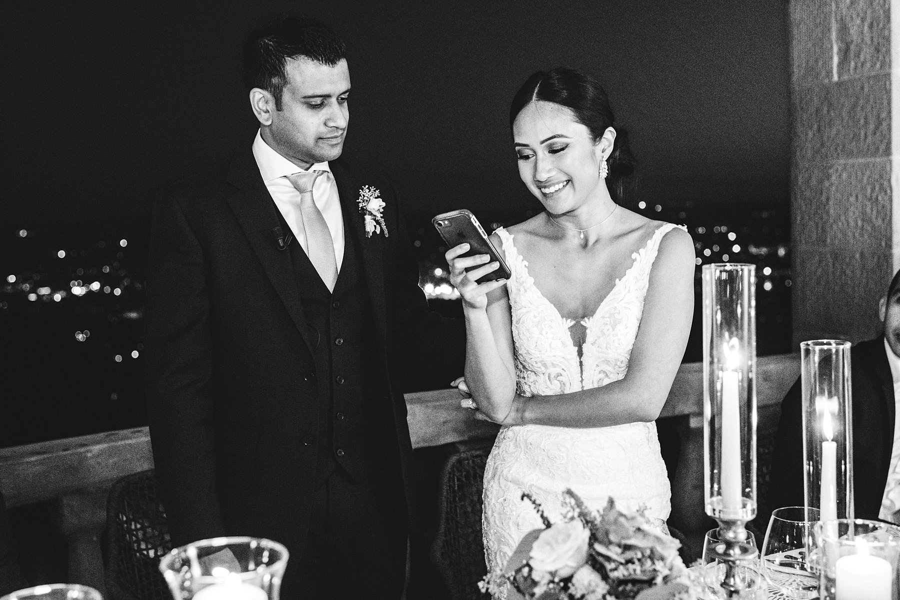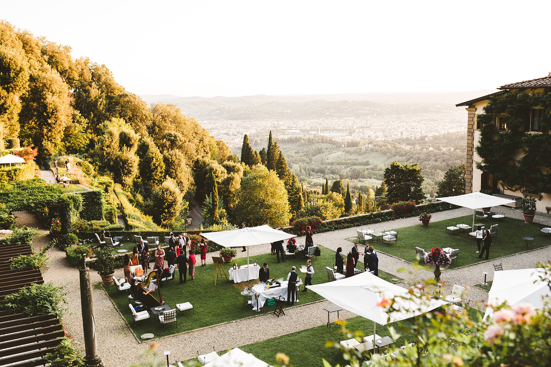 Intimate destination wedding reception and cocktail hour at the incredible and breathtaking venue Belmond Villa San Michele with the panoramic view of Florence from the terrace. Photo by the Italian elegant creative and modern destination wedding photographer in Tuscany based Florence Gabriele Fani.