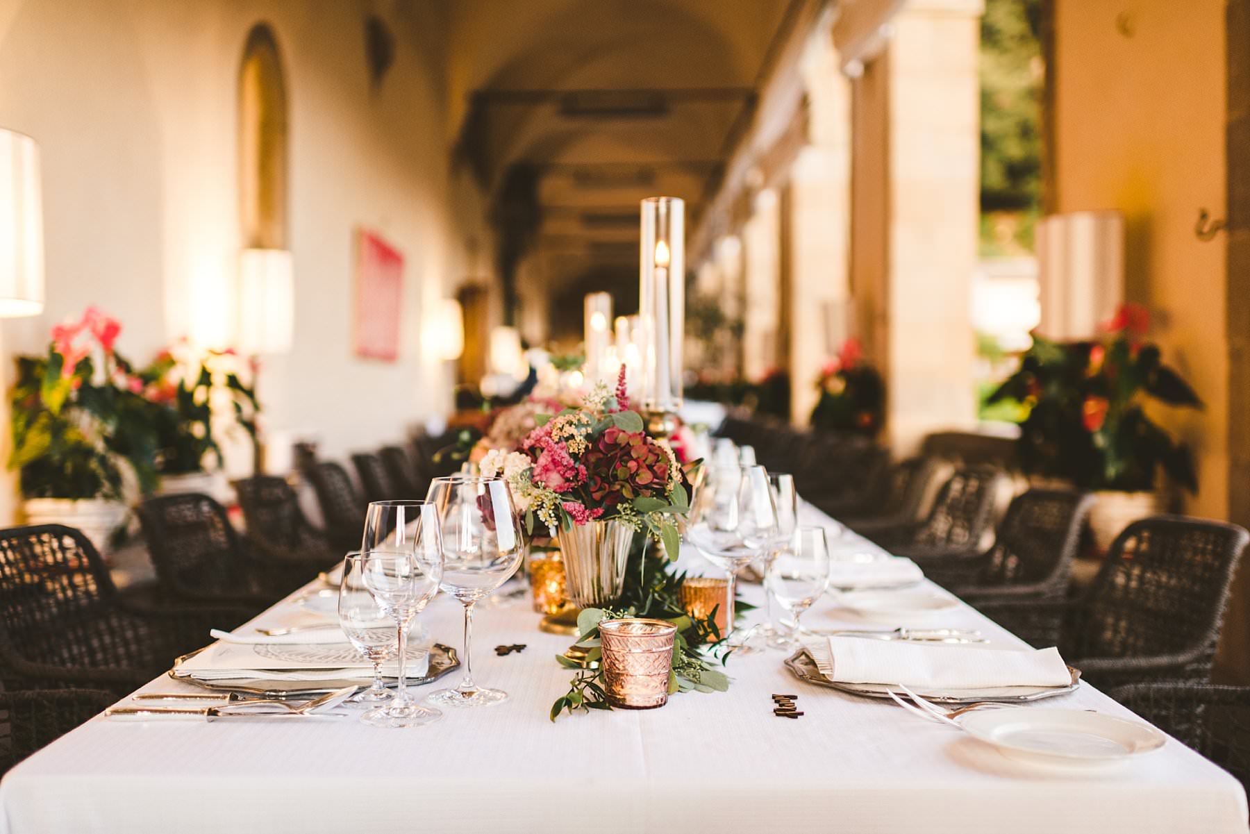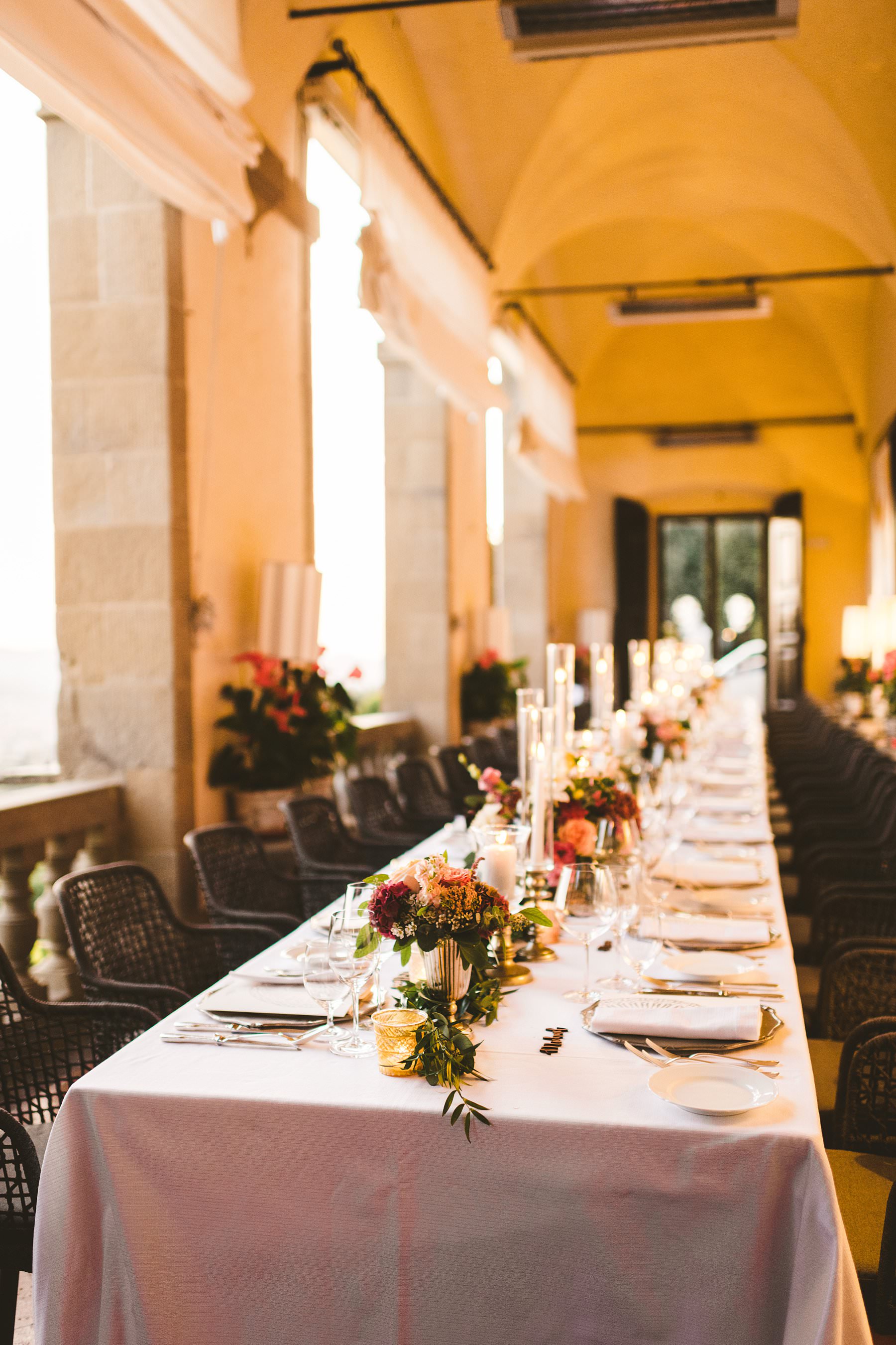 Gracefully decorated wedding dinner table by Garden Divers and Belmond Villa San Michele. Luxury intimate destination wedding in Florence. Photo by the Italian elegant creative and modern destination wedding photographer in Tuscany based Florence Gabriele Fani.