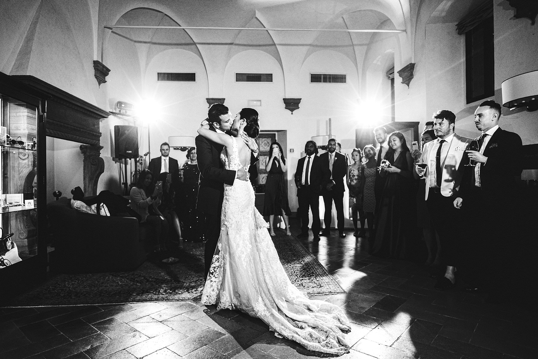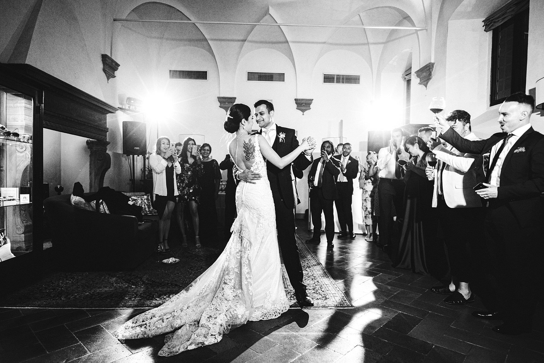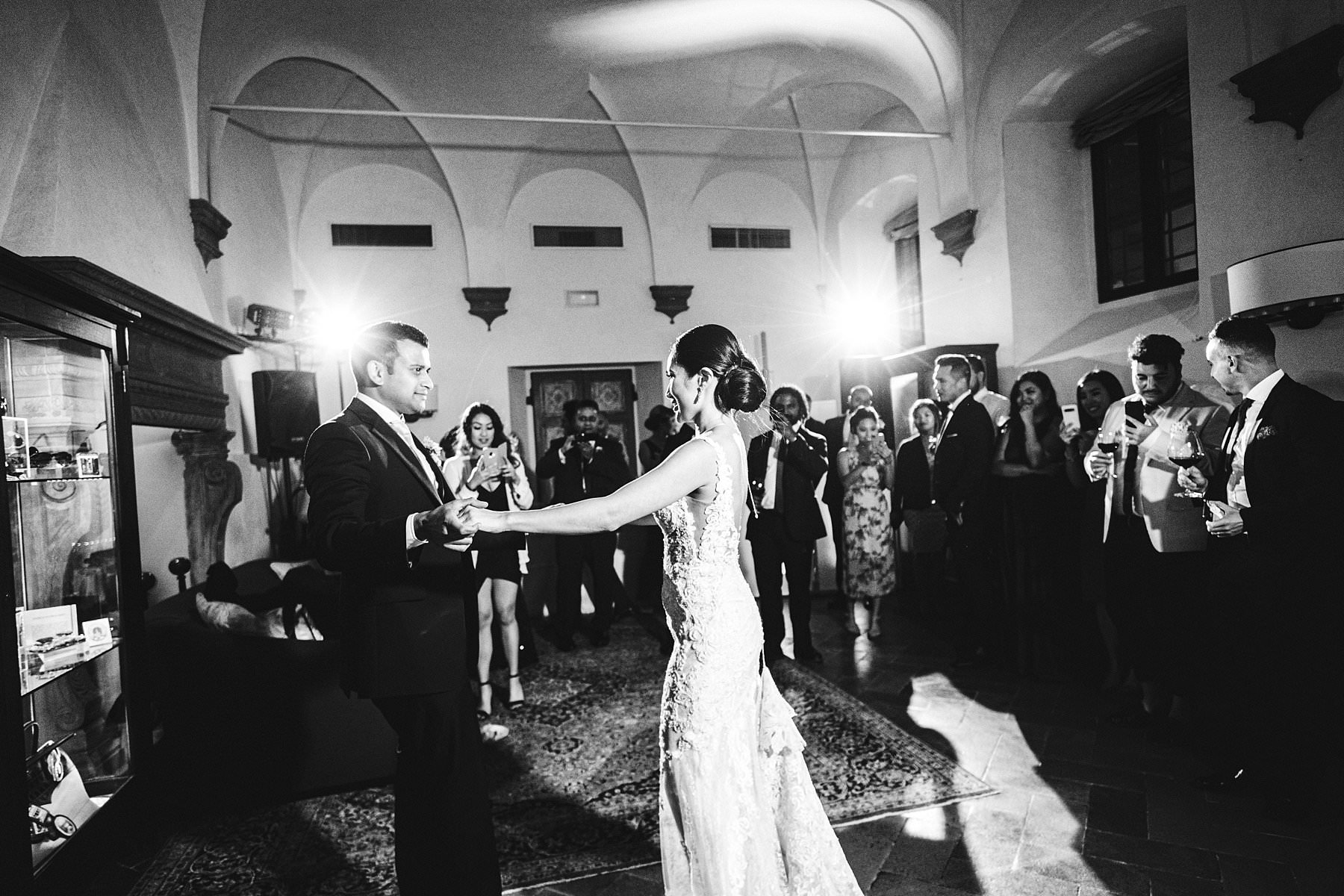 Lovely bride and groom wedding first dance at incredible luxury Belmond Villa San Michele. Intimate destination wedding in Florence. Photo by the Italian elegant creative and modern destination wedding photographer in Tuscany based Florence Gabriele Fani.