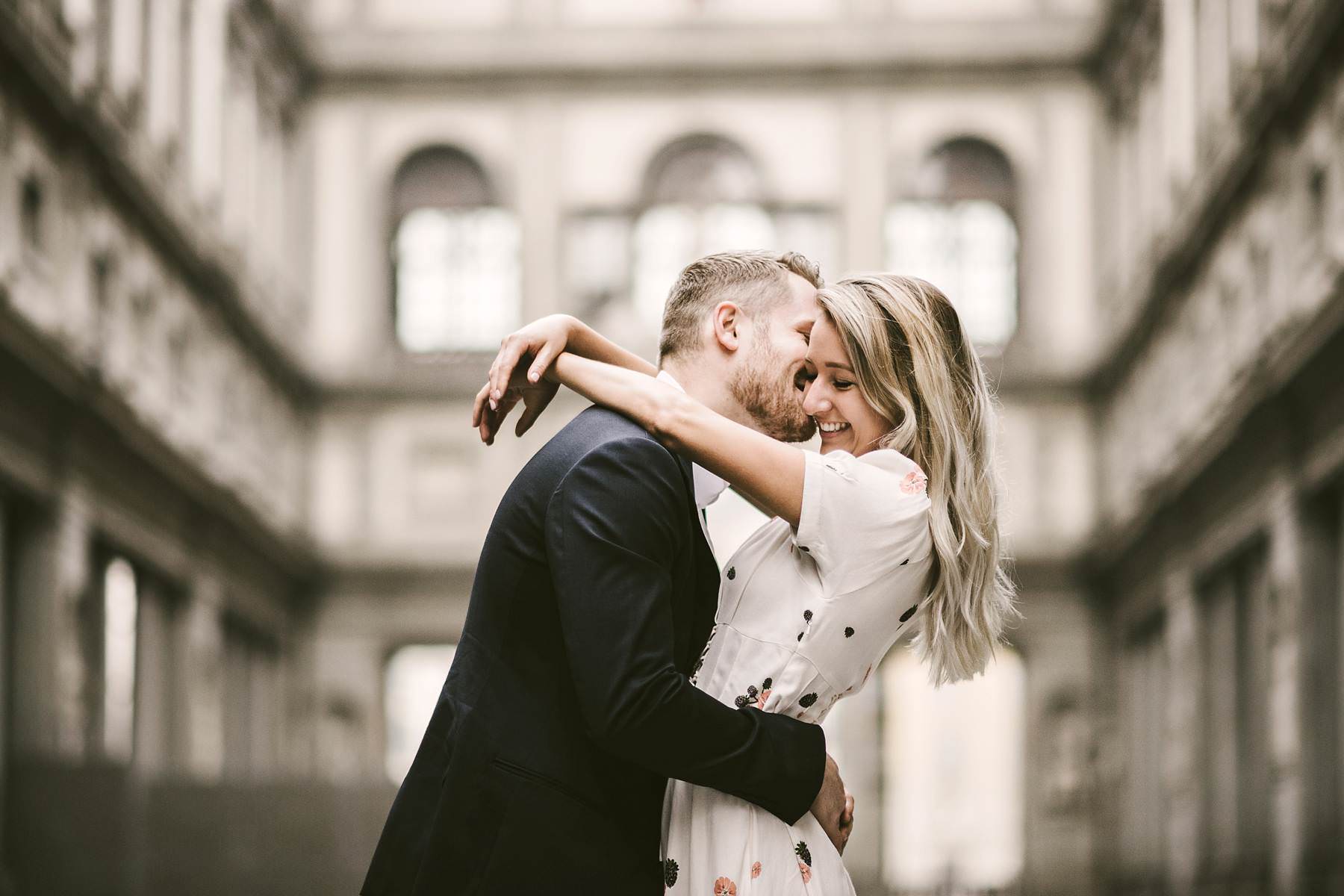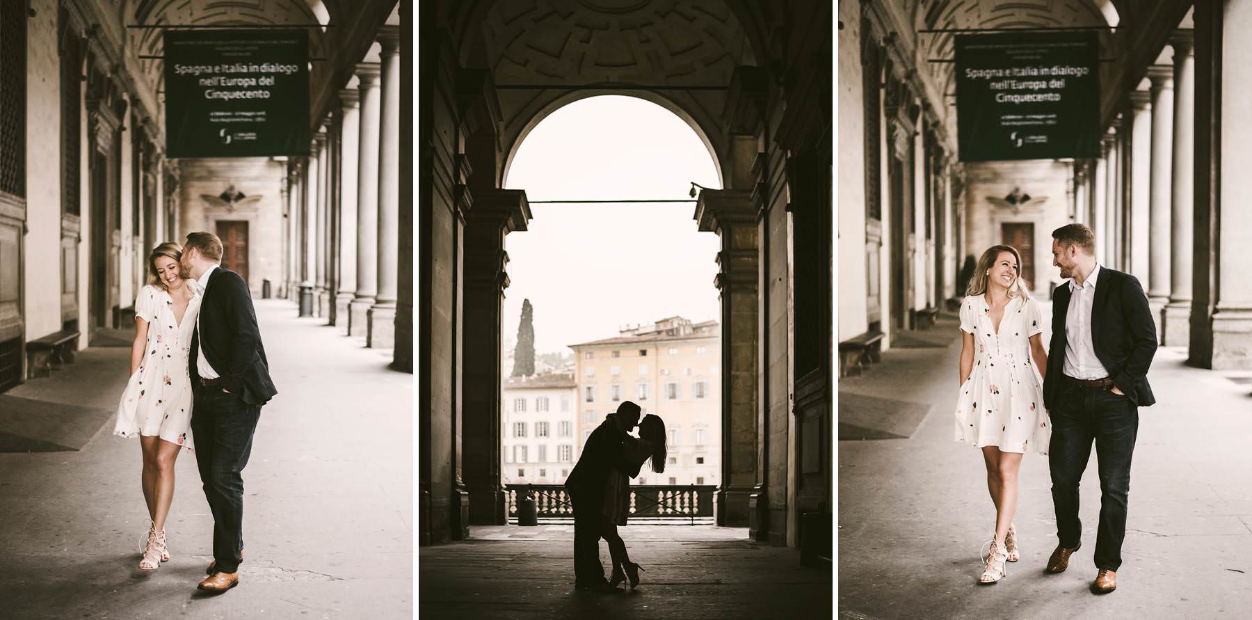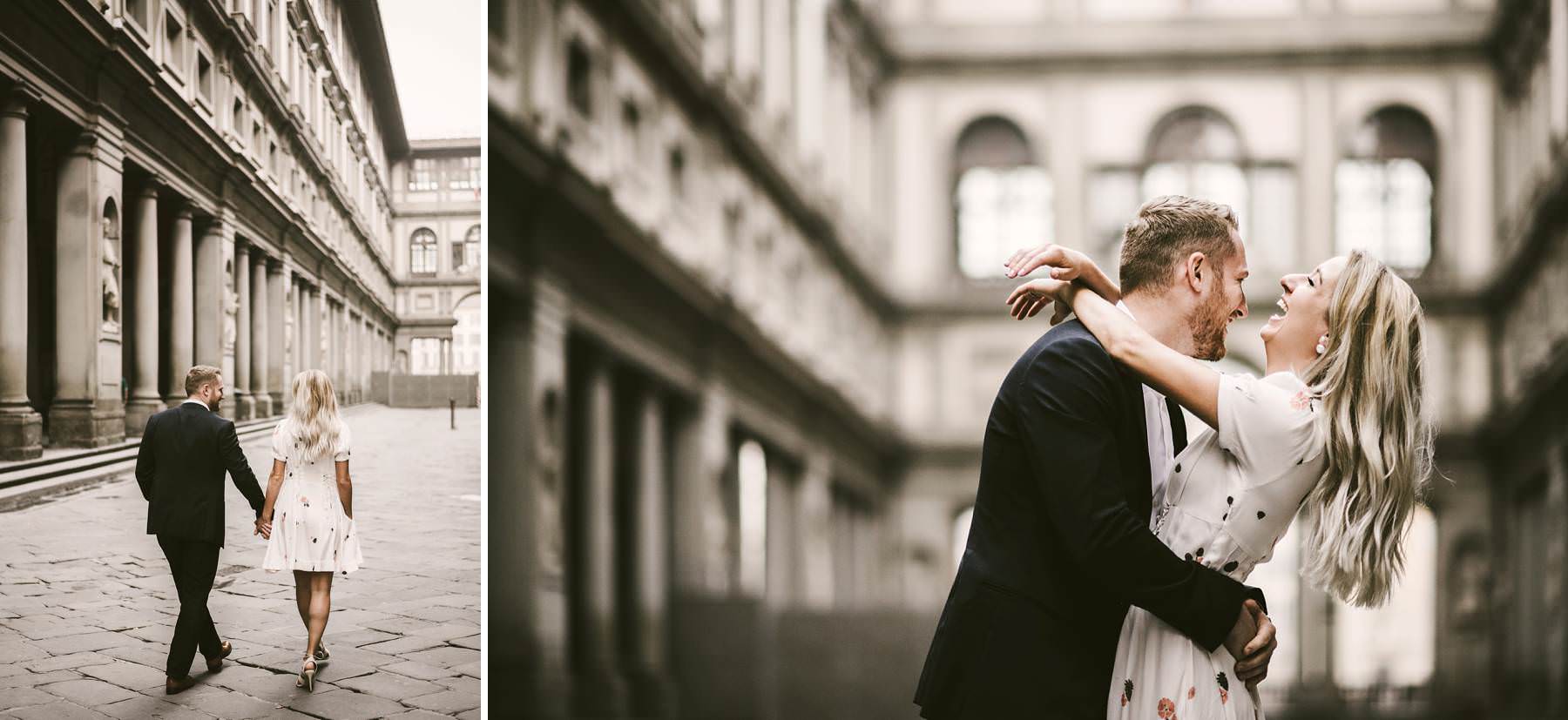 Lovely couple engaged in Florence. Pre wedding couple portrait photo shoot at Uffizi area near Palazzo Vecchio. Photo by the Italian engagement photographer in Tuscany based Florence Gabriele Fani