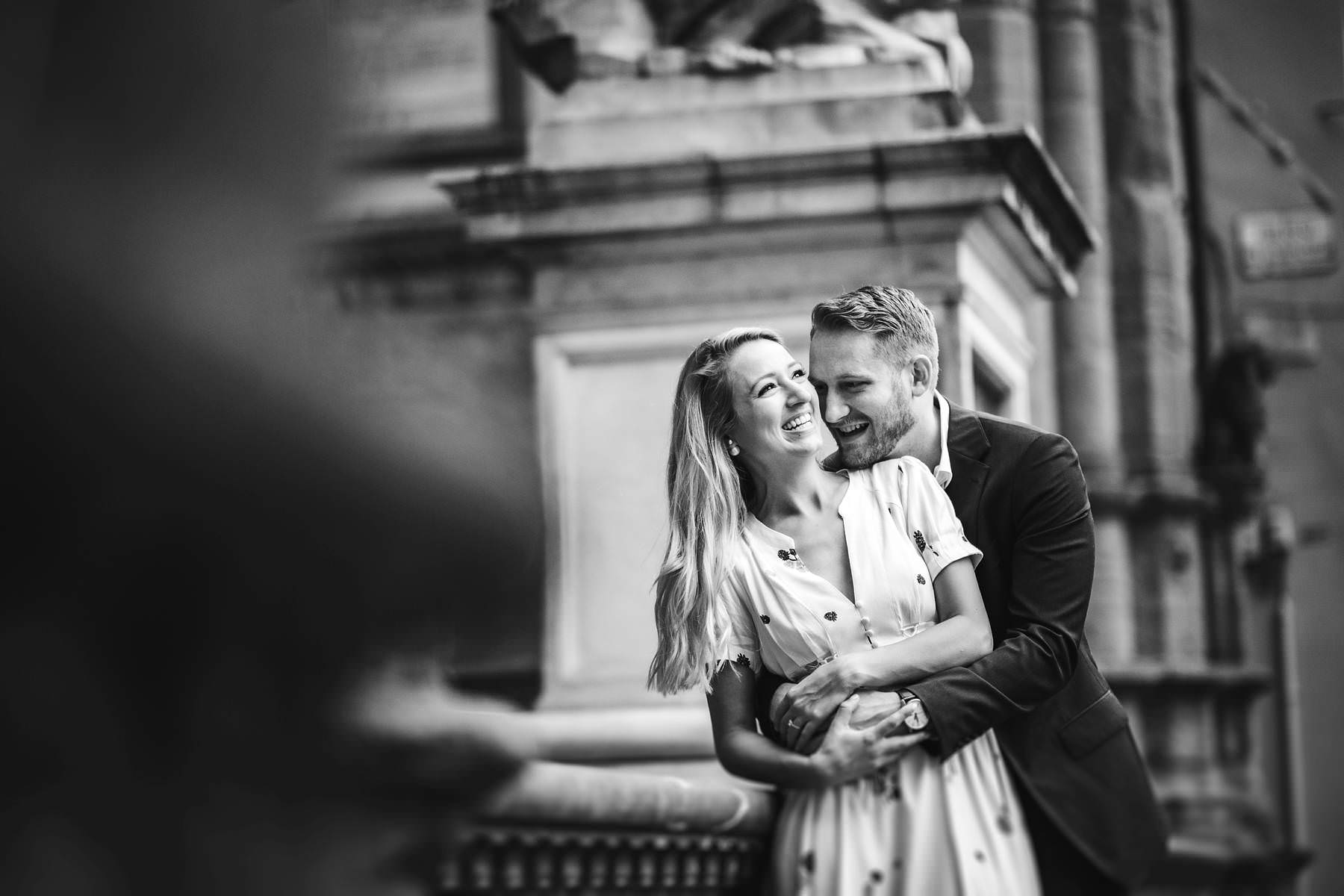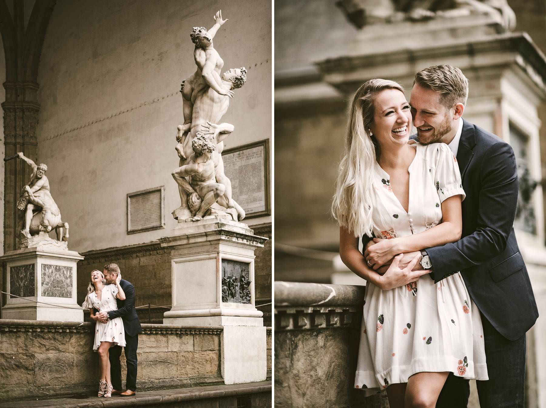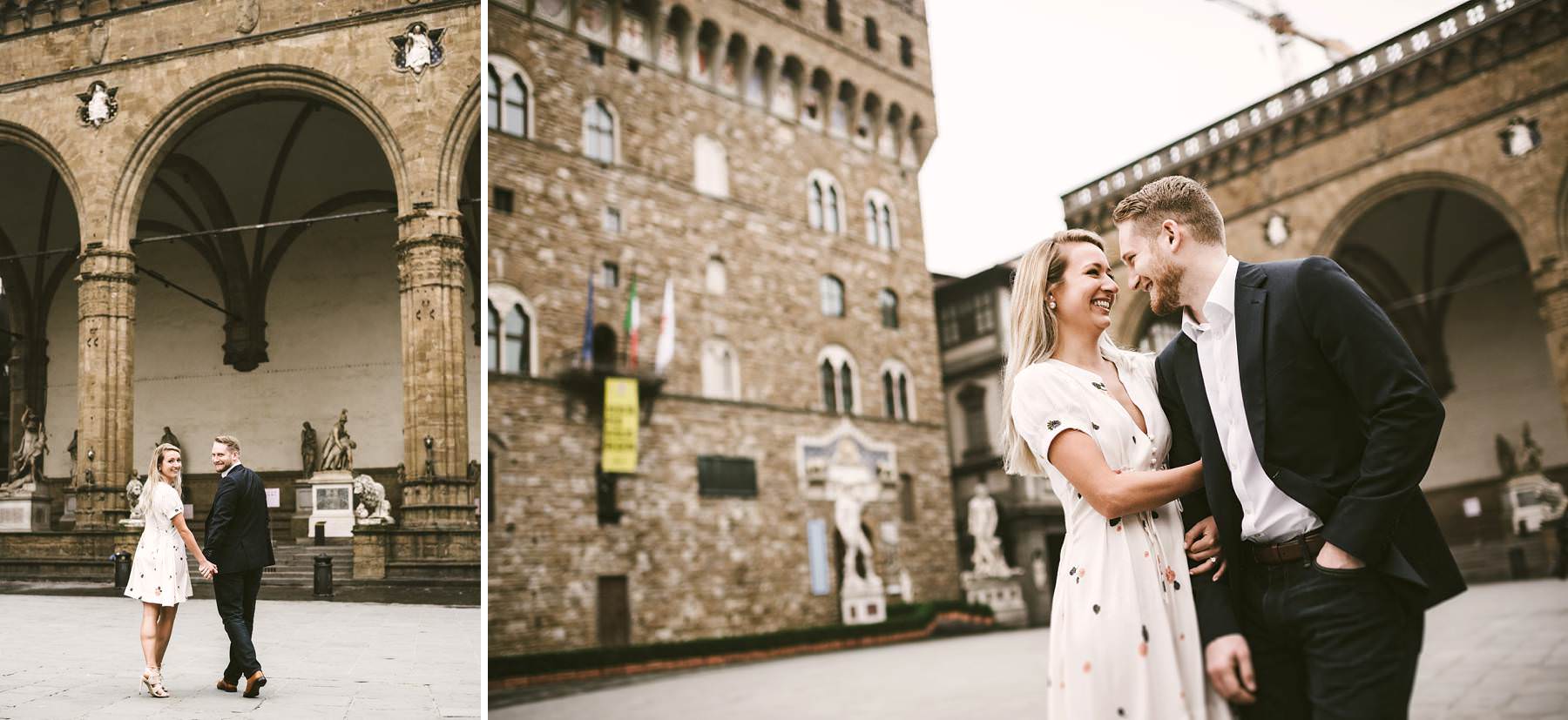 Lovely couple engaged in Florence. Pre wedding couple portrait photo shoot at Piazza della Signoria square near Palazzo Vecchio. Photo by the Italian engagement photographer in Tuscany based Florence Gabriele Fani