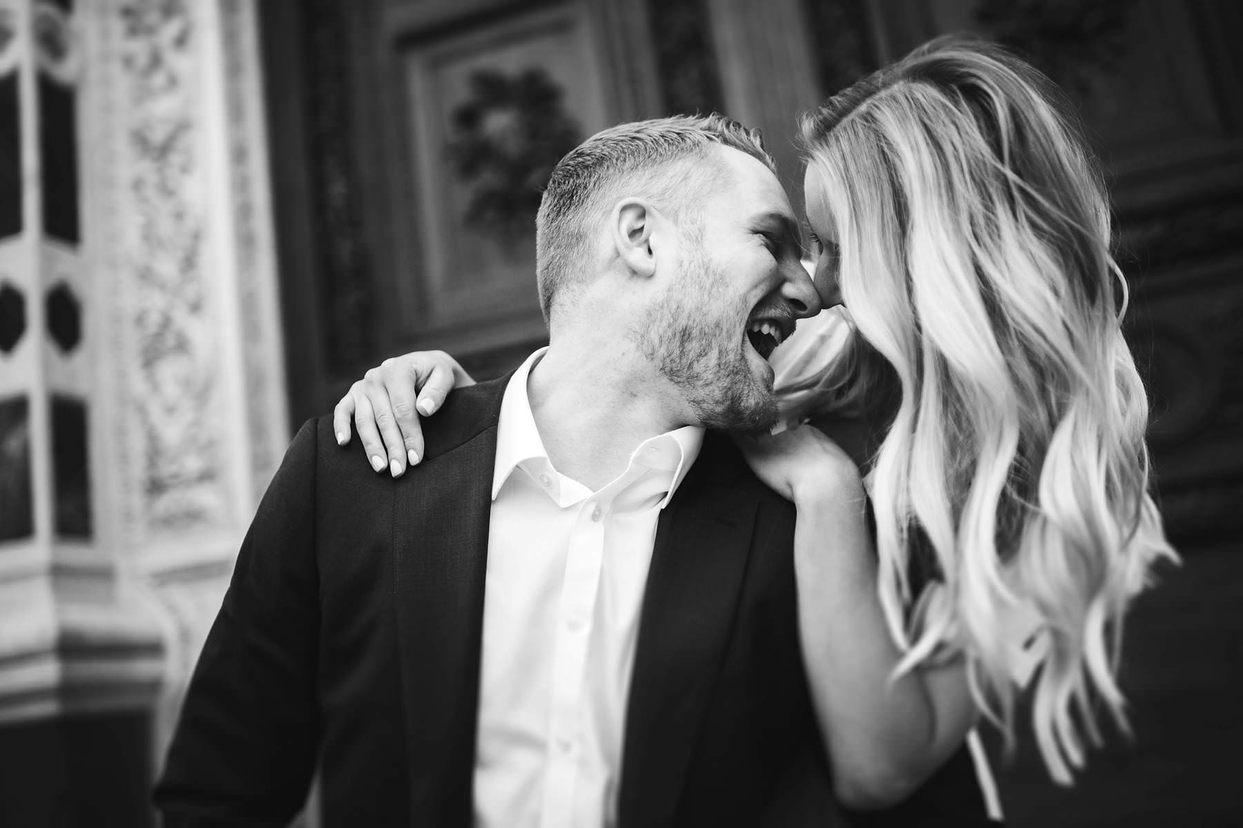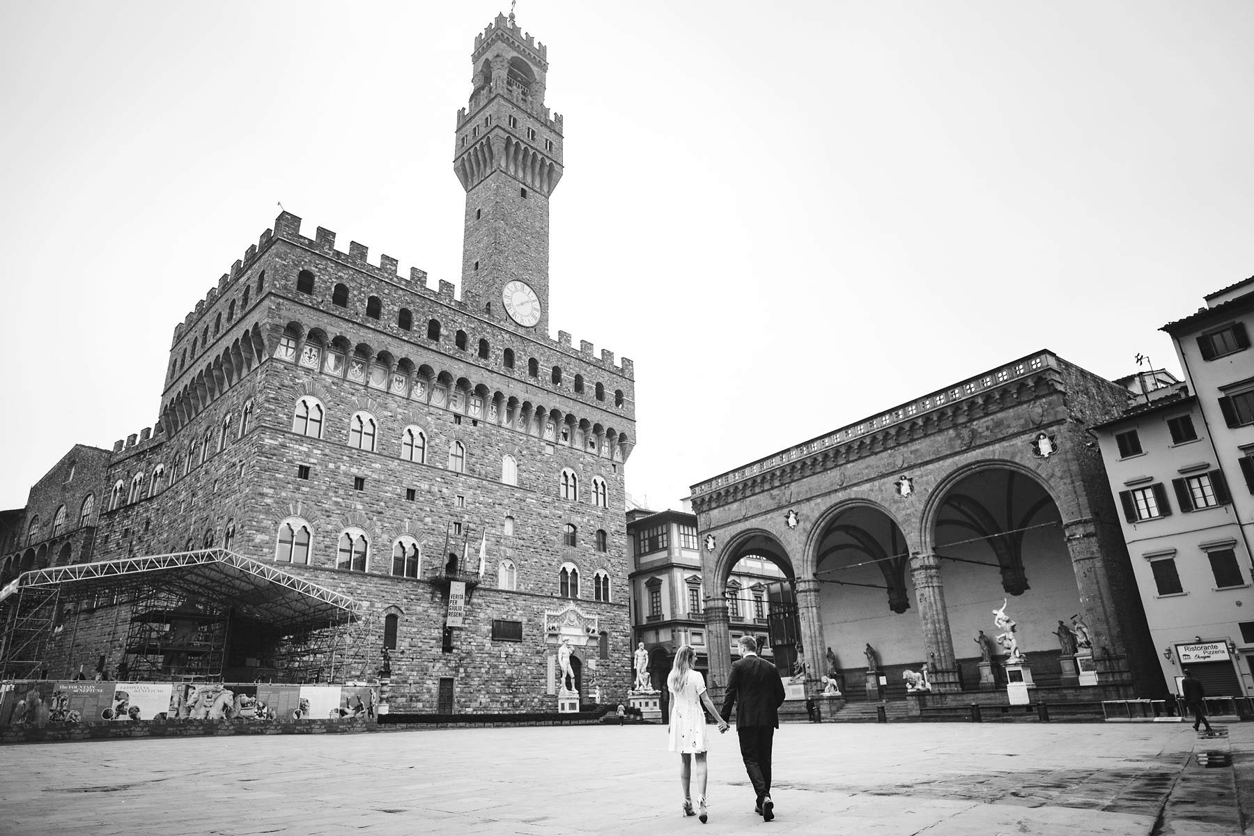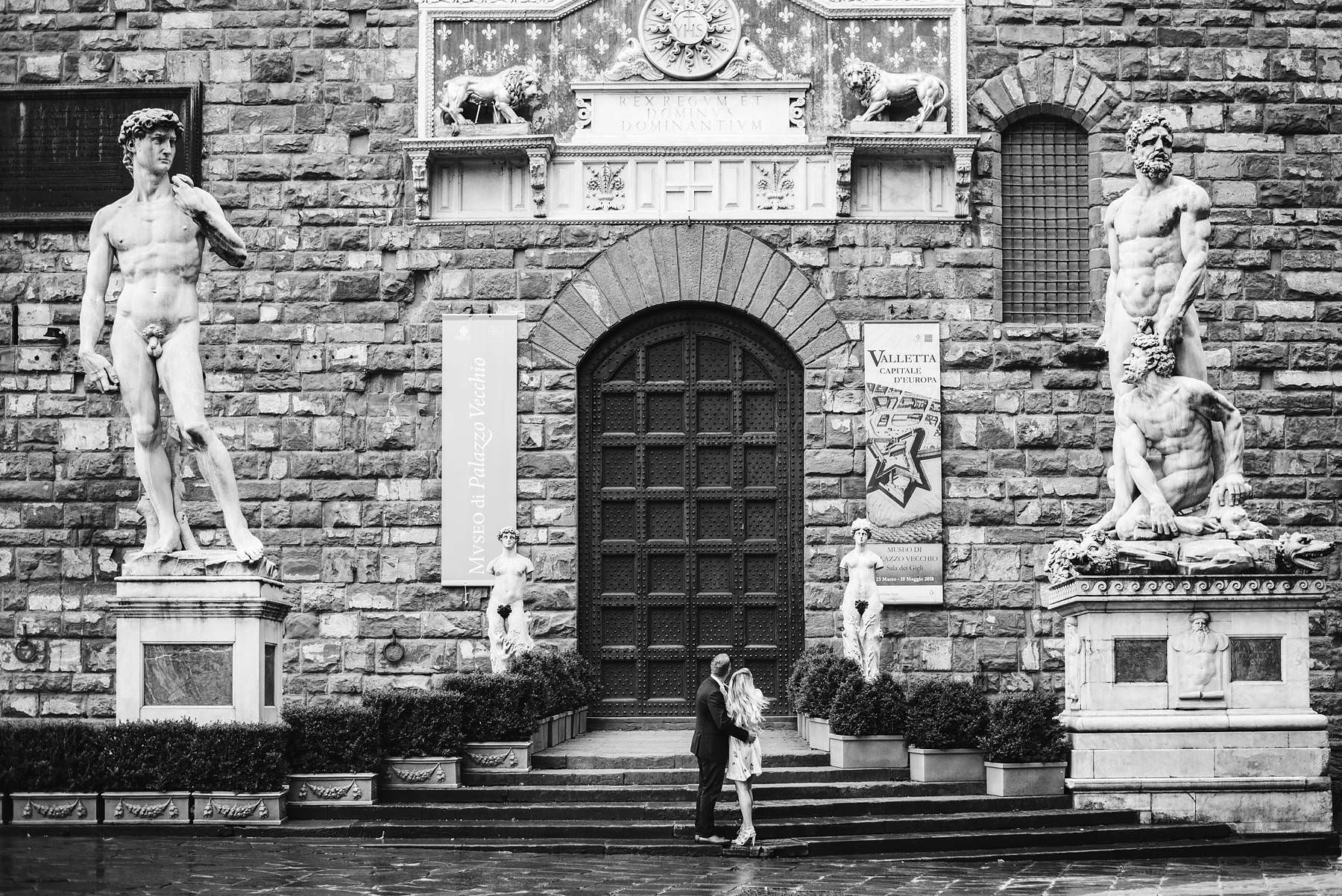 Lovely couple engaged in Florence. Pre wedding couple portrait photo shoot at Piazza della Signoria square near Palazzo Vecchio. Photo by the Italian engagement photographer in Tuscany based Florence Gabriele Fani