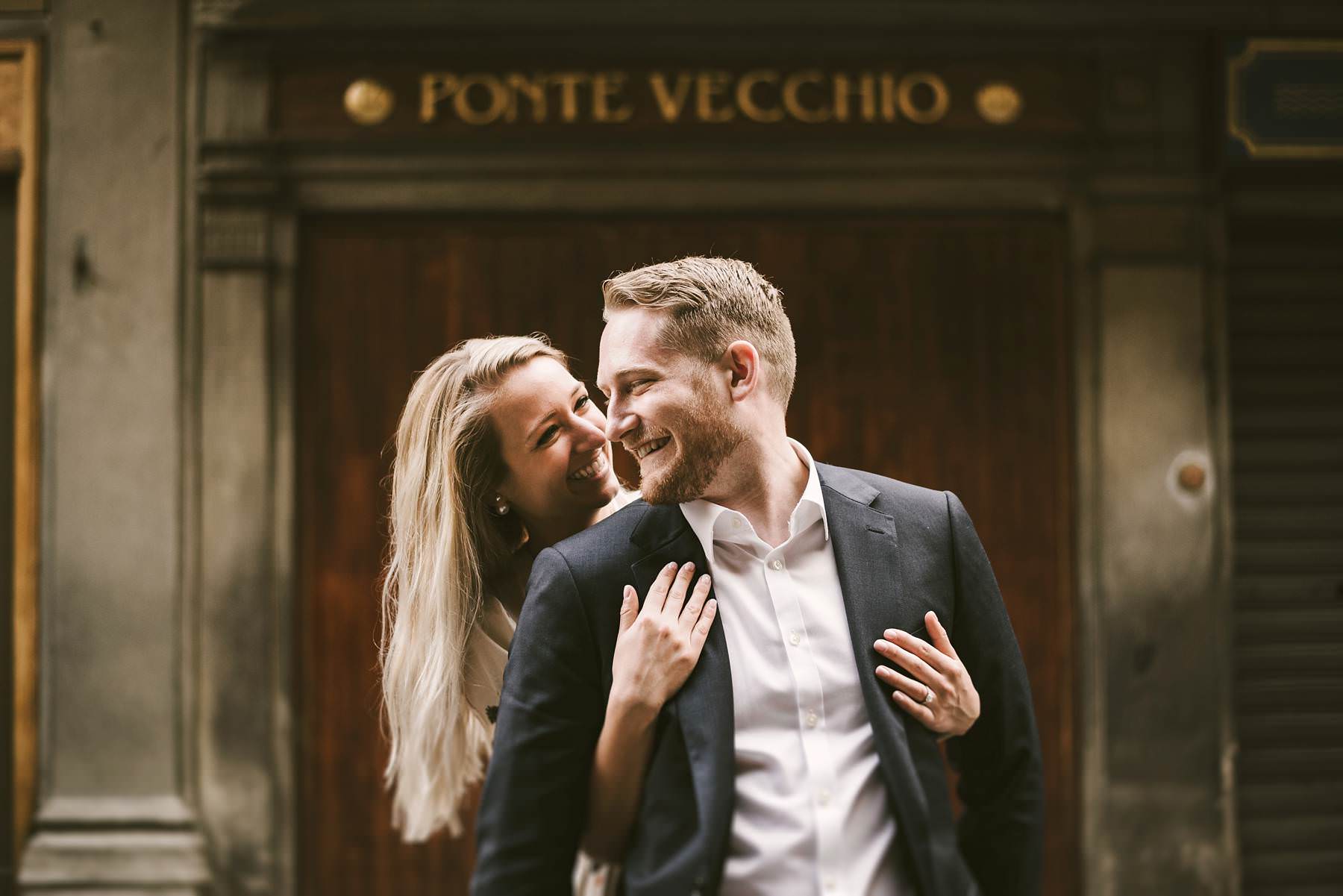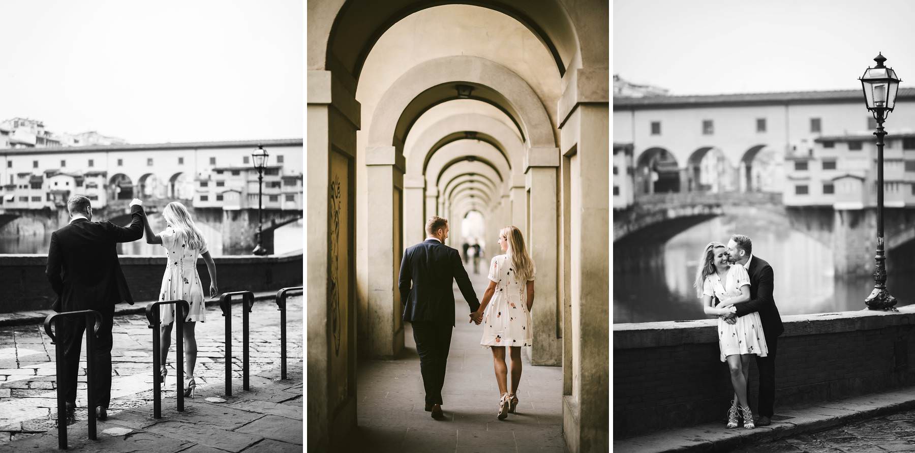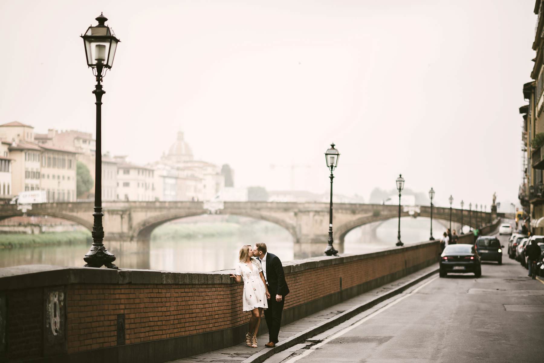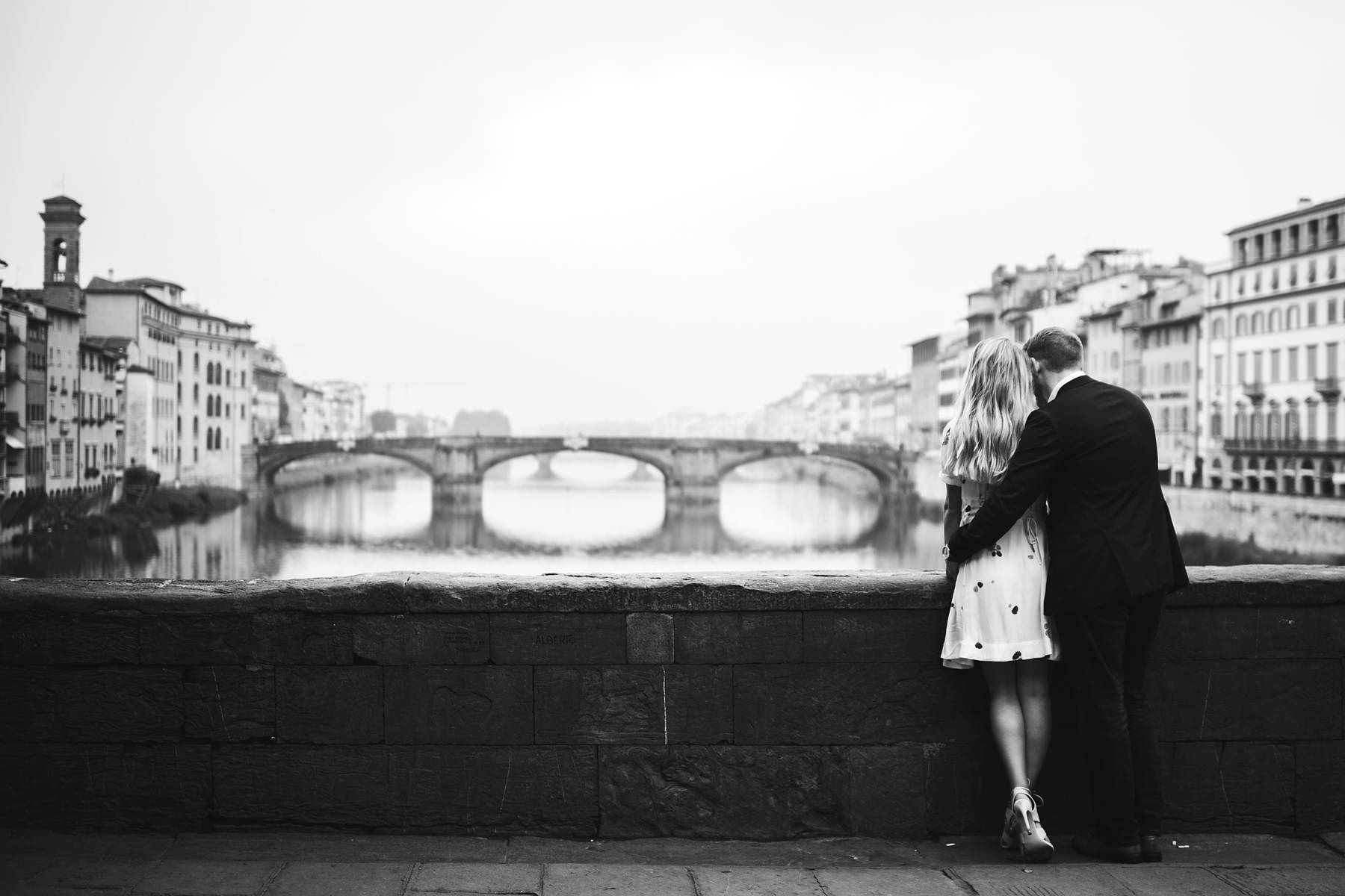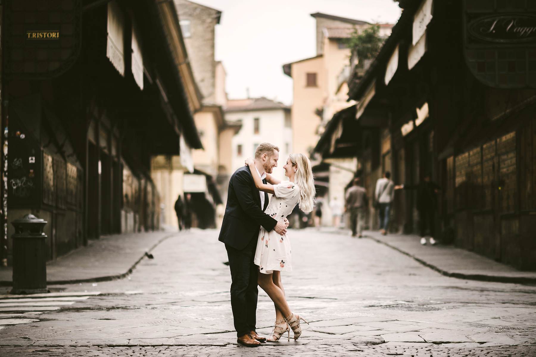 Creative engagement couple portrait in Florence at Ponte Vecchio. Sunrise engagement photo shoot in Florence by the Italian creative and modern photographer Gabriele Fani
