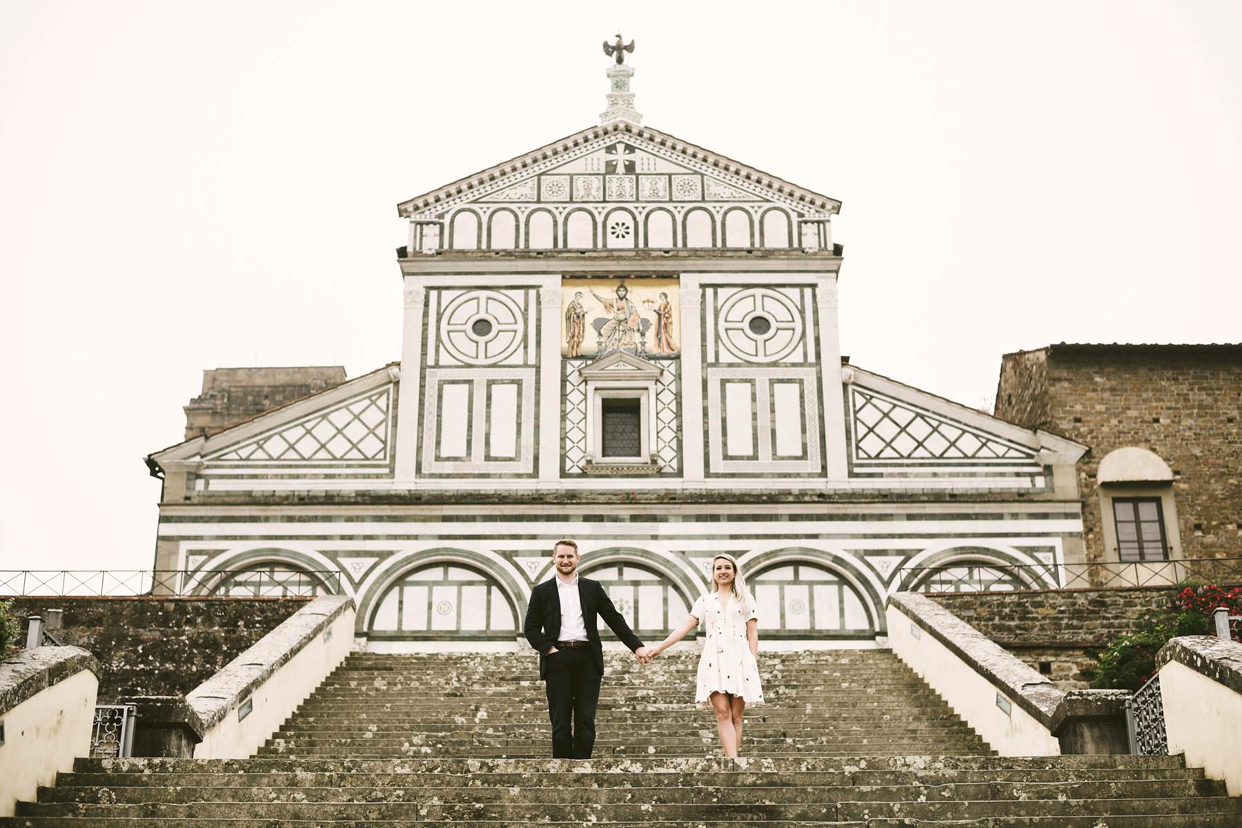 We broke the ice with a few photographs in Piazza Santa Croce, playing with the geometrical shapes of the church in a light pink and rarefied atmosphere. Then we shot some engagement photos in the completely desert Piazza della Signoria and Loggia dei Lanzi: a miracle that can only happen at sunrise and makes them even more magical. The following stop was the fascinating Galleria degli Uffizi, then we took a romantic glimpse over Ponte Vecchio and finally we ended the sunrise shooting tour at San Miniato al Monte, where the view over a misty Florence was simply breathtaking.