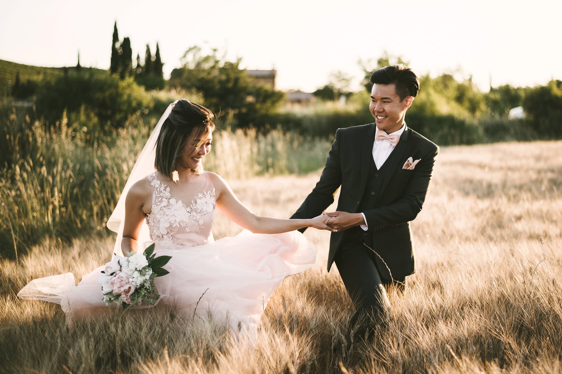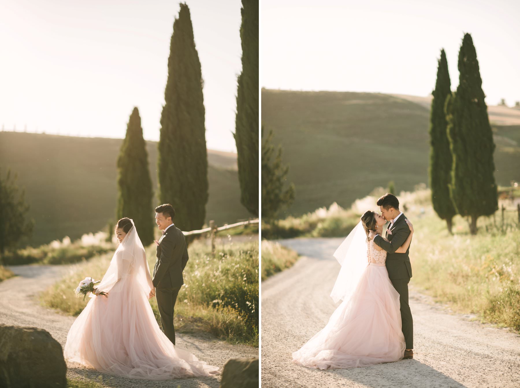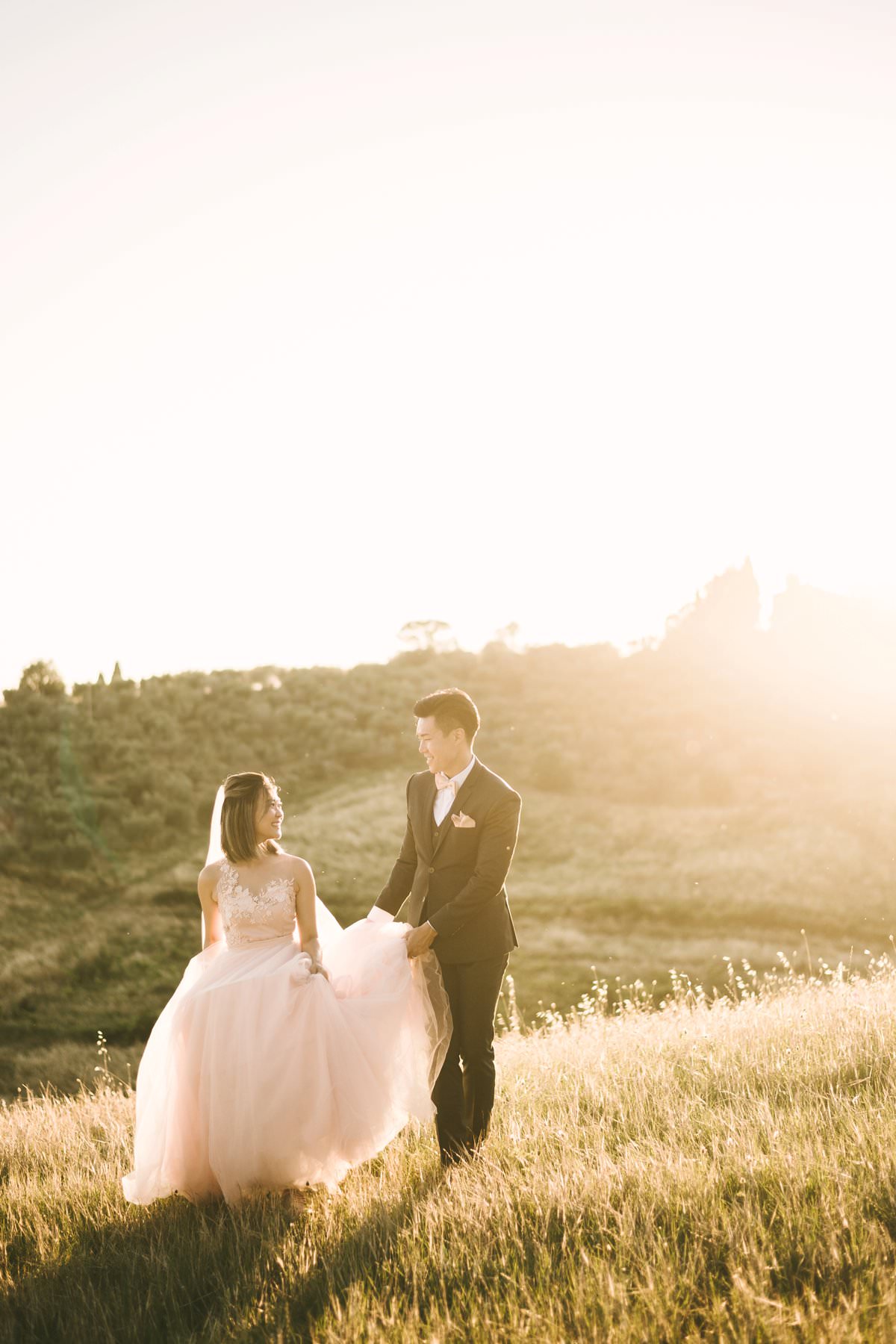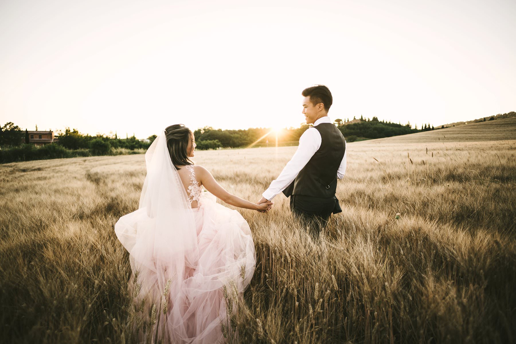 This lovely couple from Singapore chose Italy as their honeymoon destination. They couldn’t go anywhere more romantic! Inspired by the prewedding photo shoot I realized for their friends Melissa and Ray, they decided to have their honeymoon photos taken during their stay in beautiful Tuscany. They even brought their wedding dresses all the way from their home country in order for the pictures to be even more dreamy and charming! The main location of the shooting was Pienza, a small and enchanting hamlet near Siena. It’s known as an ideal Renaissance town and it was the perfect set for chic and elegant honeymoon photos, with its marble churches, brick houses and wooden portals. This delightful place is surrounded by the glorious hills of Val d’Orcia, where we shot some more photos in the warm sunset light. Daphne and Brendon set their love free among the green and golden wheat fields and they will treasure their honeymoon photos forever.