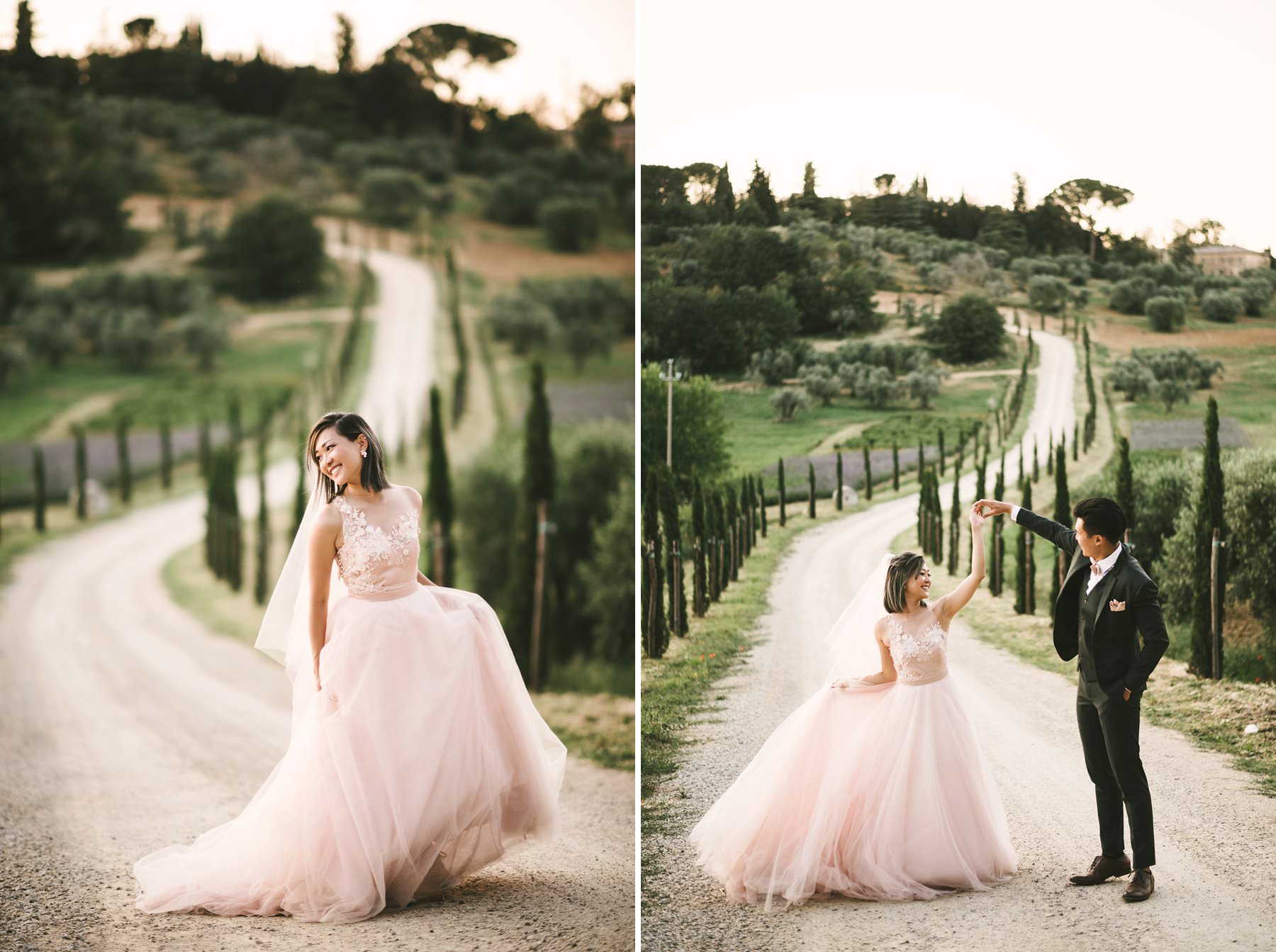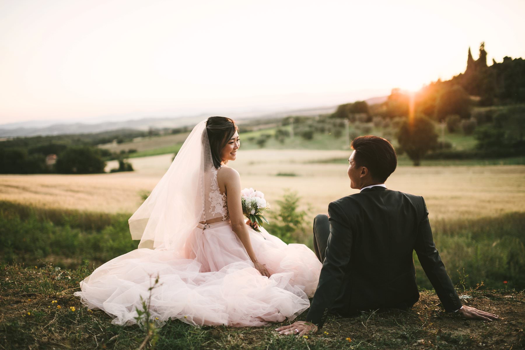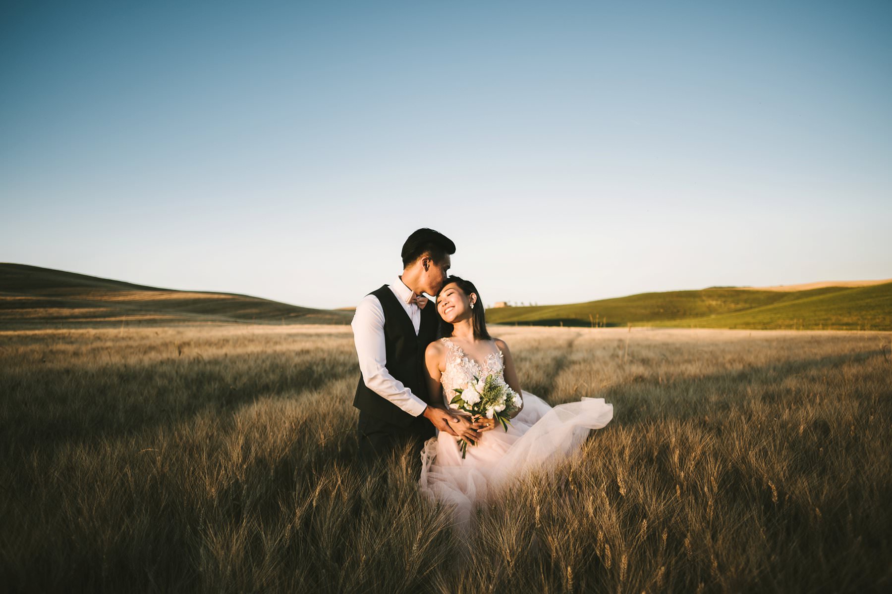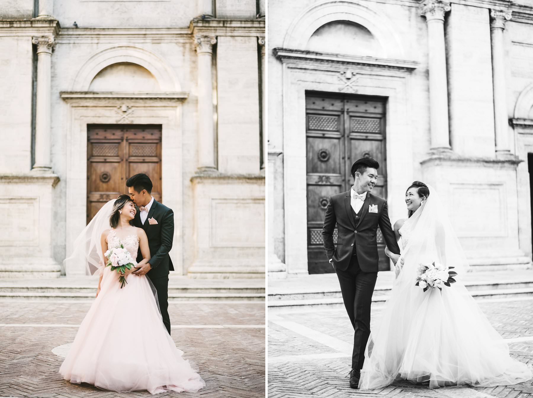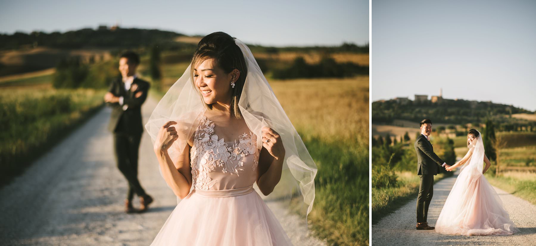This lovely couple from Singapore chose Italy as their honeymoon destination. They couldn’t go anywhere more romantic! Inspired by the prewedding photo shoot I realized for their friends Melissa and Ray, they decided to have their honeymoon photos taken during their stay in beautiful Tuscany. They even brought their wedding dresses all the way from their home country in order for the pictures to be even more dreamy and charming! The main location of the shooting was Pienza, a small and enchanting hamlet near Siena. It’s known as an ideal Renaissance town and it was the perfect set for chic and elegant honeymoon photos, with its marble churches, brick houses and wooden portals. This delightful place is surrounded by the glorious hills of Val d’Orcia, where we shot some more photos in the warm sunset light. Daphne and Brendon set their love free among the green and golden wheat fields and they will treasure their honeymoon photos forever.