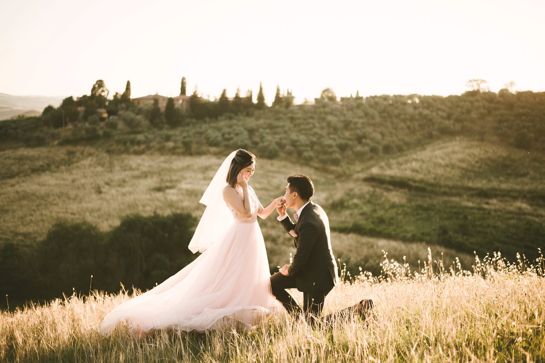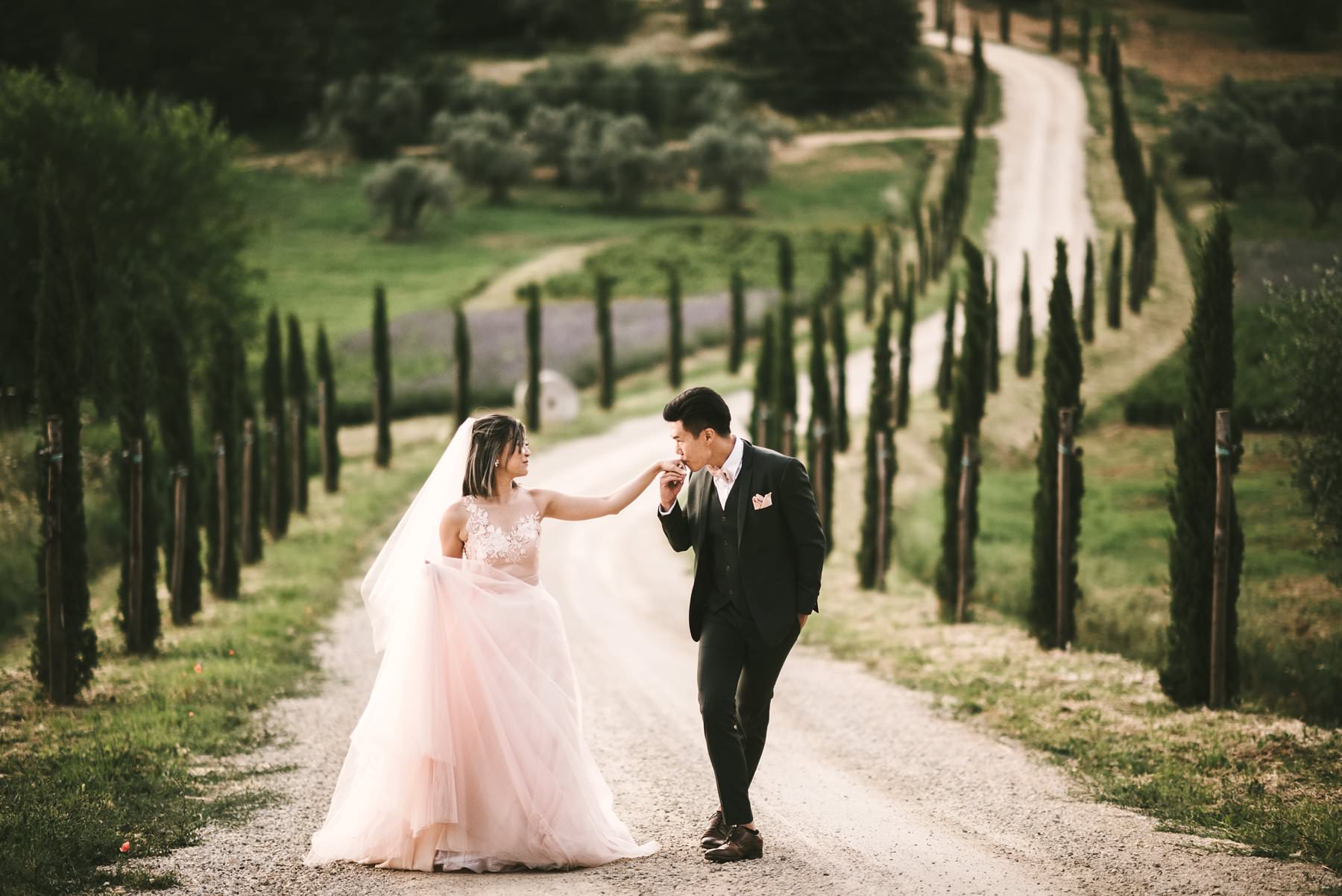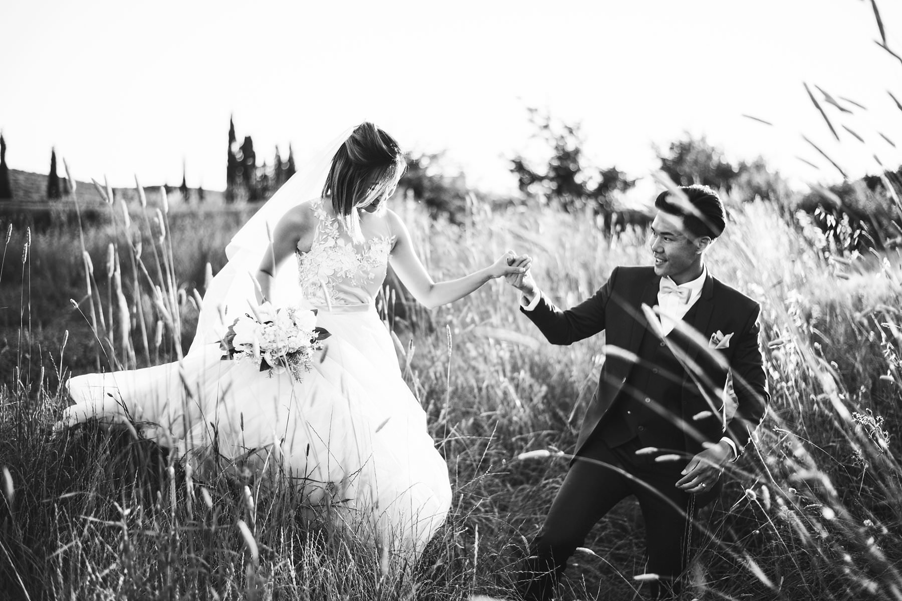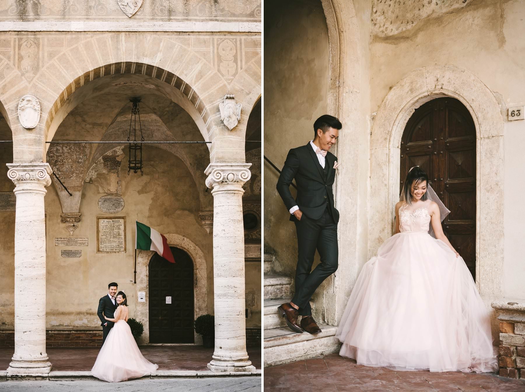 This lovely couple from Singapore chose Italy as their honeymoon destination. They couldn’t go anywhere more romantic! Inspired by the prewedding photo shoot I realized for their friends Melissa and Ray, they decided to have their honeymoon photos taken during their stay in beautiful Tuscany. They even brought their wedding dresses all the way from their home country in order for the pictures to be even more dreamy and charming! The main location of the shooting was Pienza, a small and enchanting hamlet near Siena. It’s known as an ideal Renaissance town and it was the perfect set for chic and elegant honeymoon photos, with its marble churches, brick houses and wooden portals. This delightful place is surrounded by the glorious hills of Val d’Orcia, where we shot some more photos in the warm sunset light. Daphne and Brendon set their love free among the green and golden wheat fields and they will treasure their honeymoon photos forever.