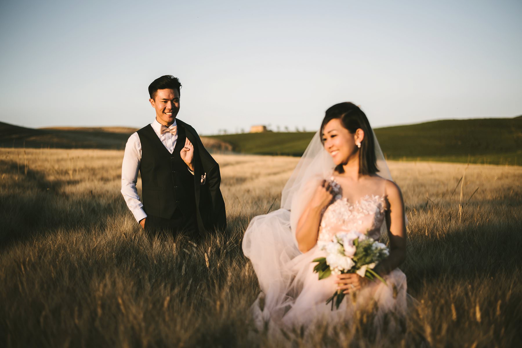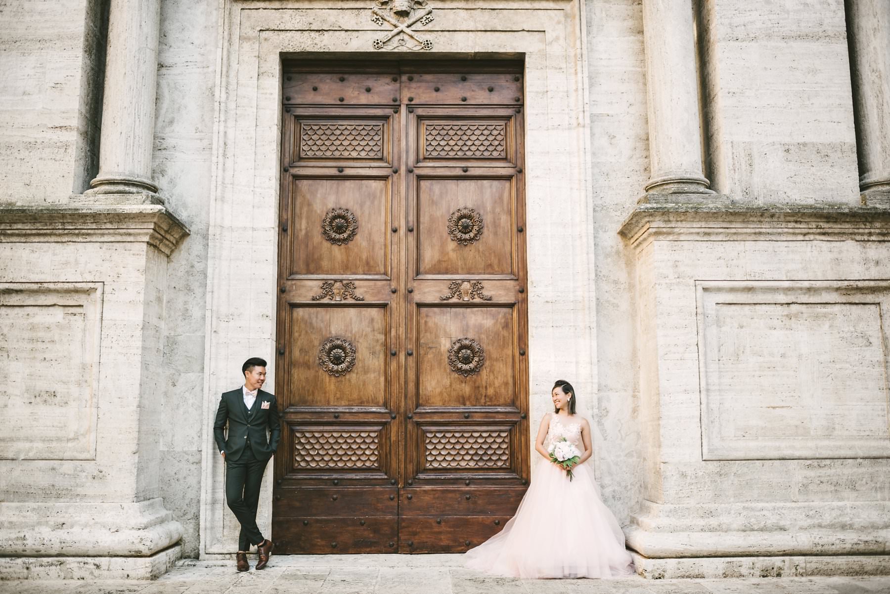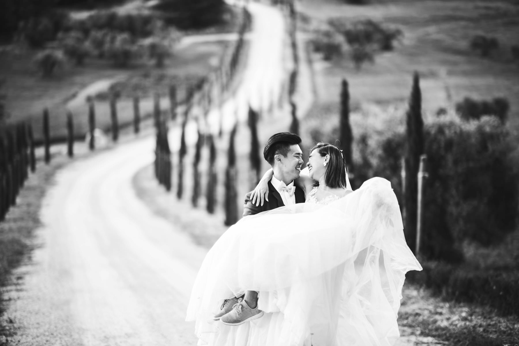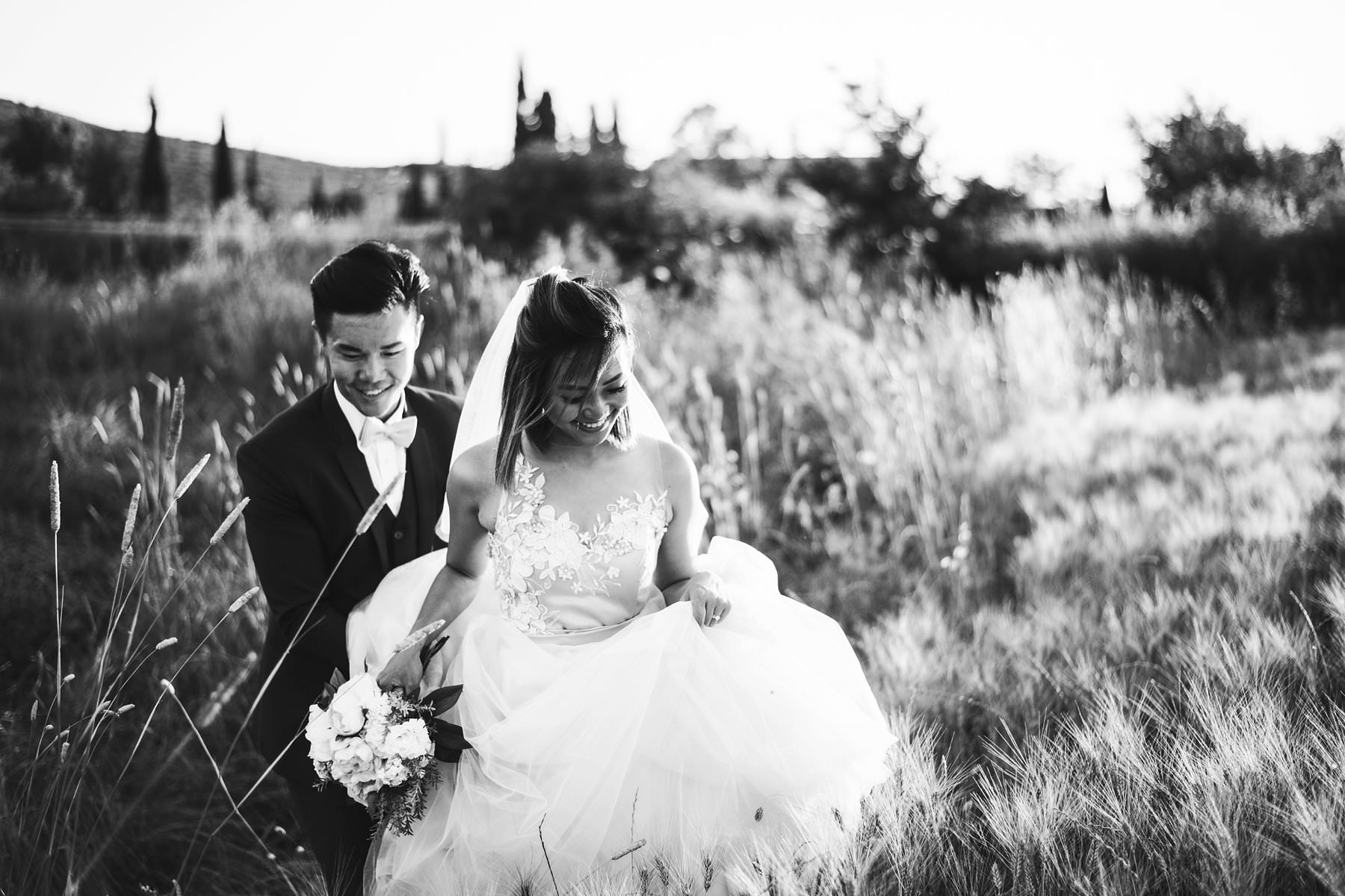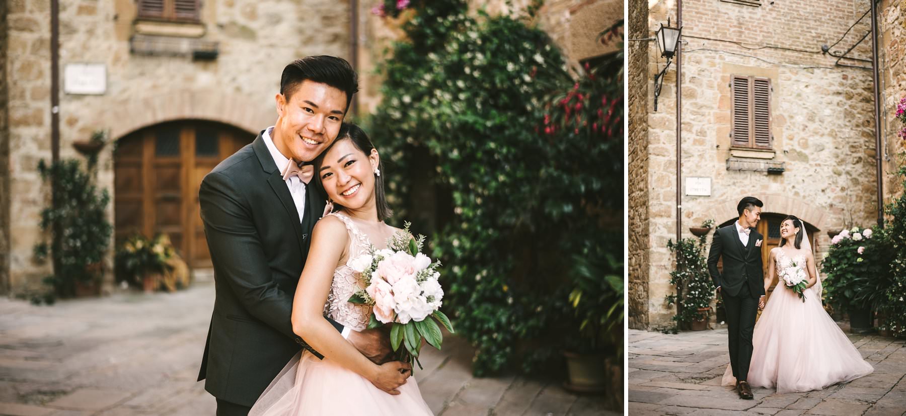 This lovely couple from Singapore chose Italy as their honeymoon destination. They couldn’t go anywhere more romantic! Inspired by the prewedding photo shoot I realized for their friends Melissa and Ray, they decided to have their honeymoon photos taken during their stay in beautiful Tuscany. They even brought their wedding dresses all the way from their home country in order for the pictures to be even more dreamy and charming! The main location of the shooting was Pienza, a small and enchanting hamlet near Siena. It’s known as an ideal Renaissance town and it was the perfect set for chic and elegant honeymoon photos, with its marble churches, brick houses and wooden portals. This delightful place is surrounded by the glorious hills of Val d’Orcia, where we shot some more photos in the warm sunset light. Daphne and Brendon set their love free among the green and golden wheat fields and they will treasure their honeymoon photos forever.