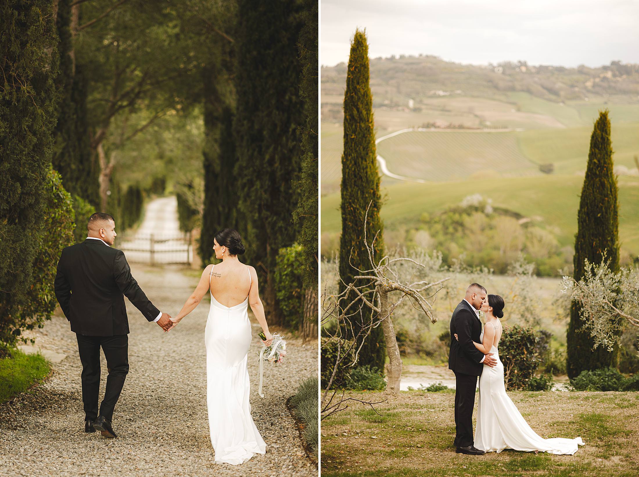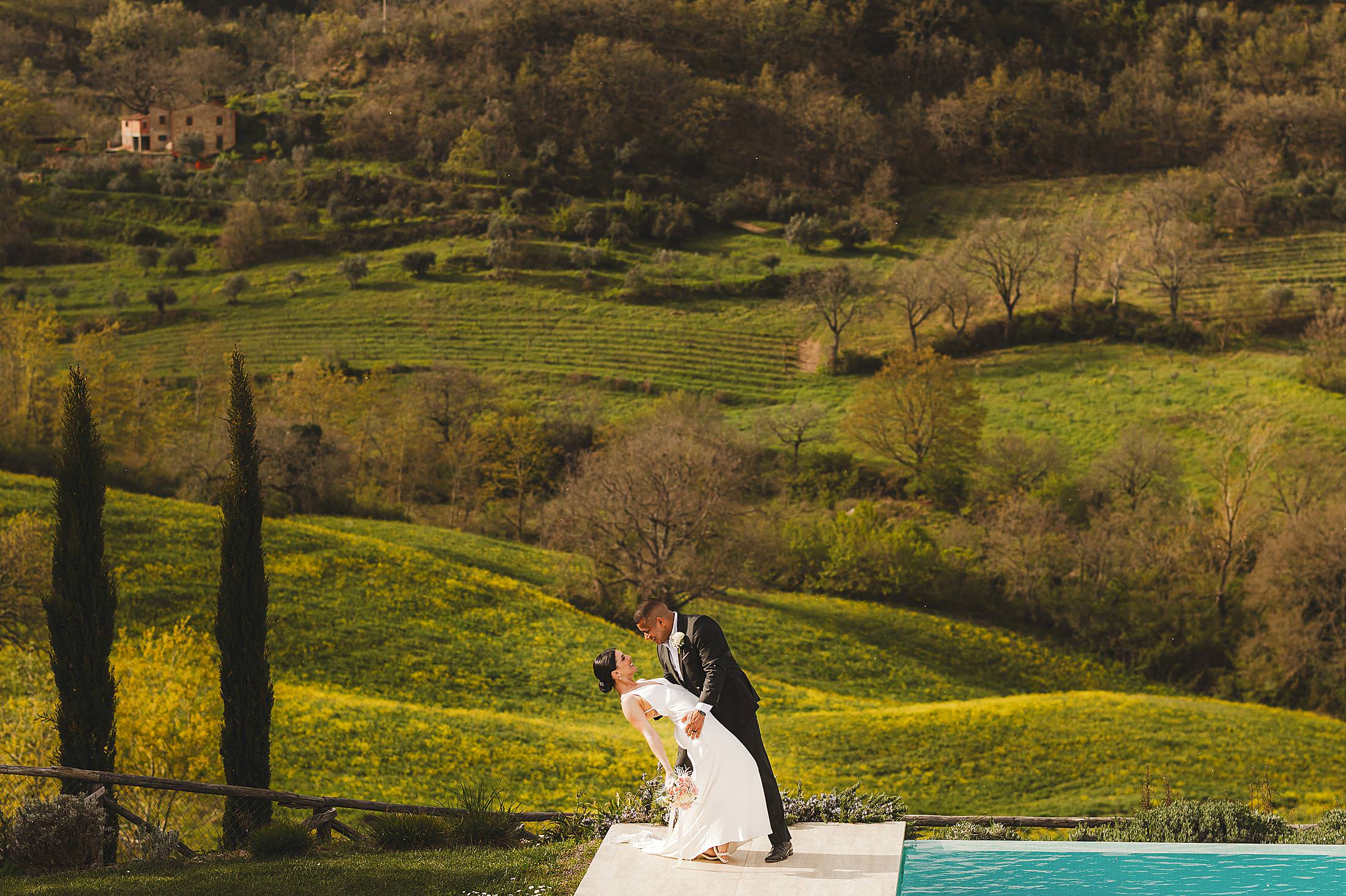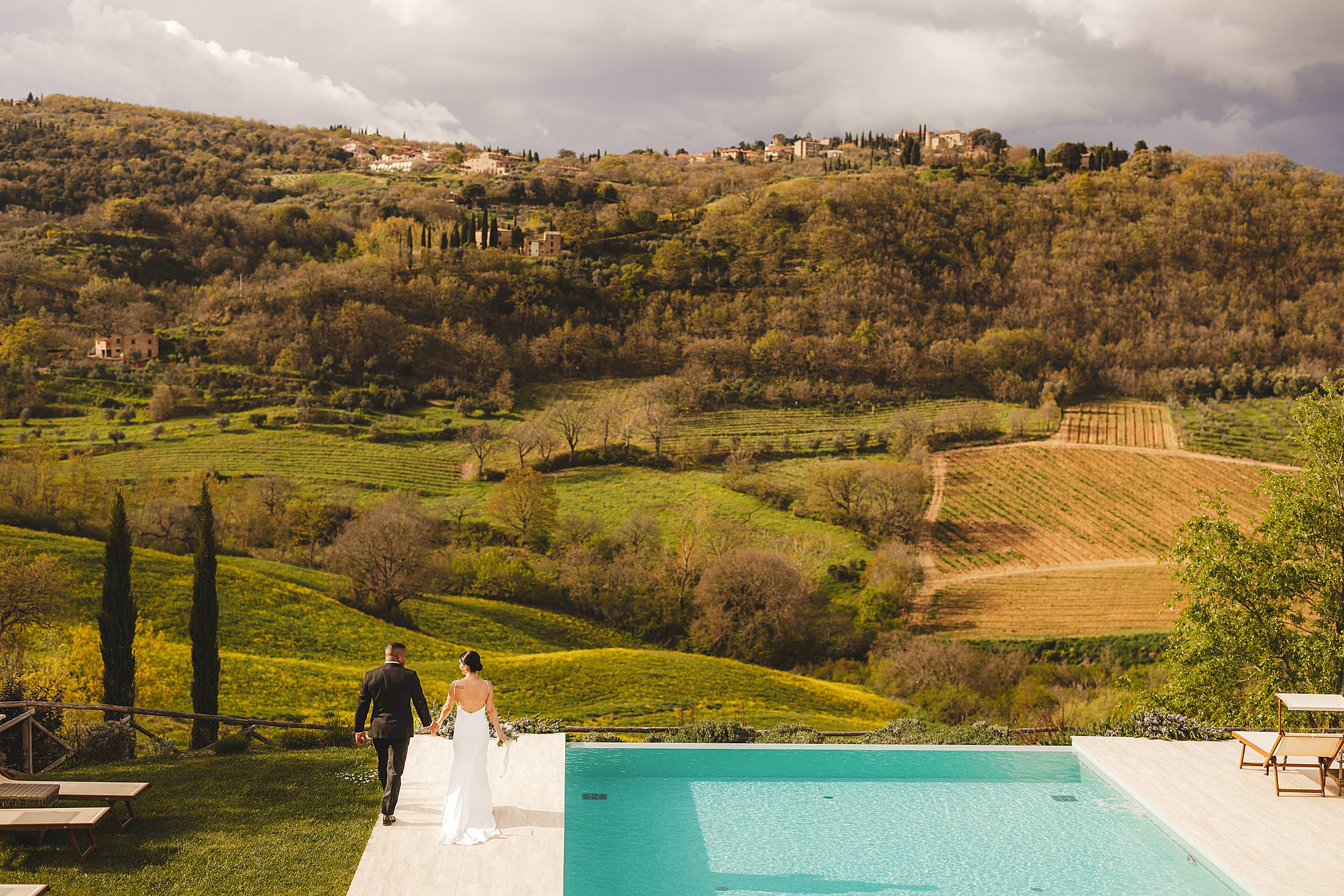 Elopement portraits with a view, at the Lupaia Boutique Hotel in the Val d’Orcia. Photo by the Italian elegant and creative elopement photographer in Tuscany based Florence Gabriele Fani