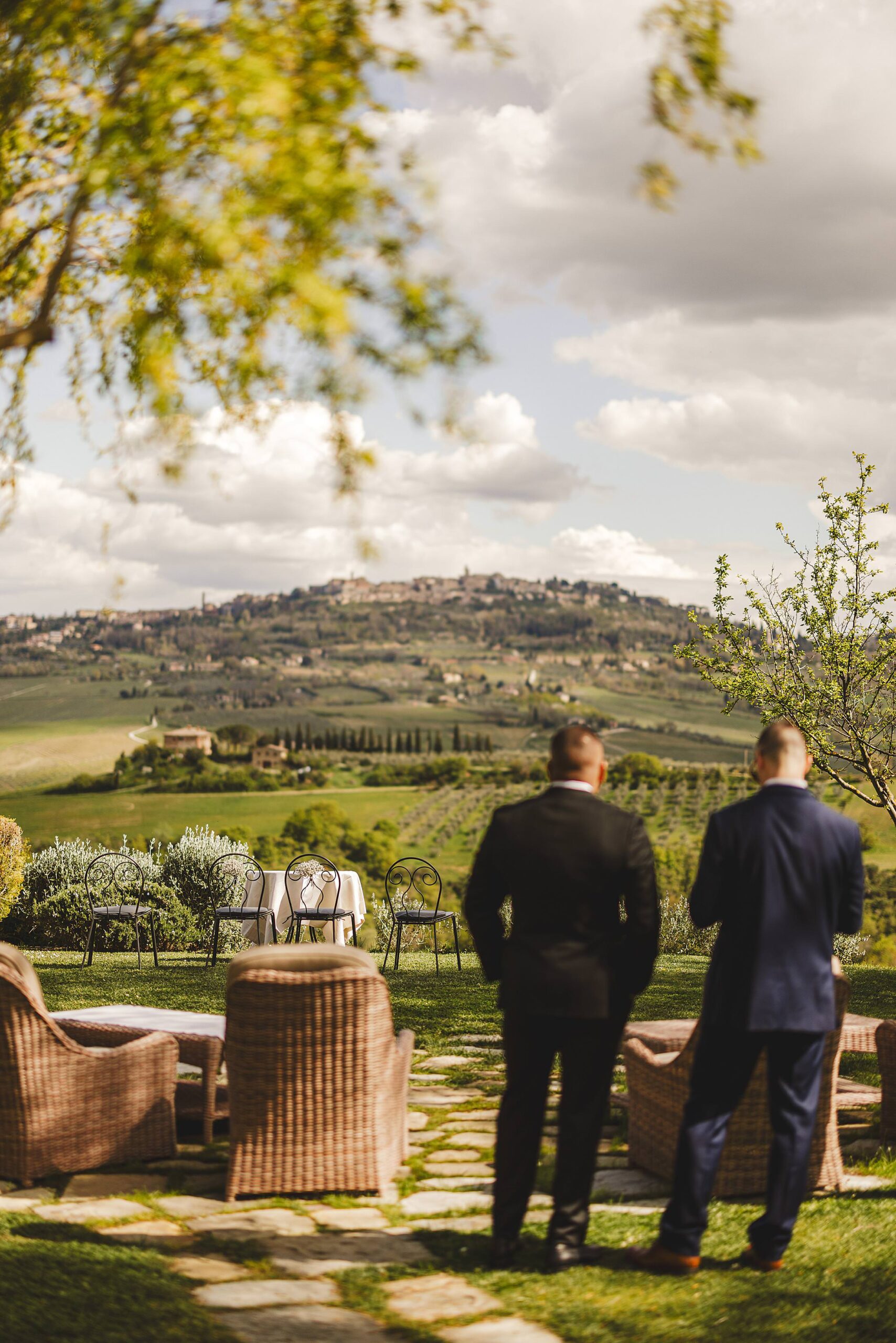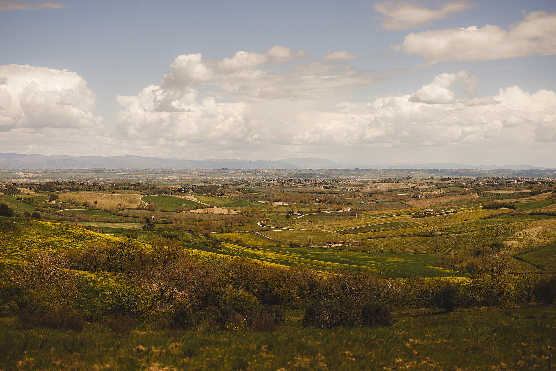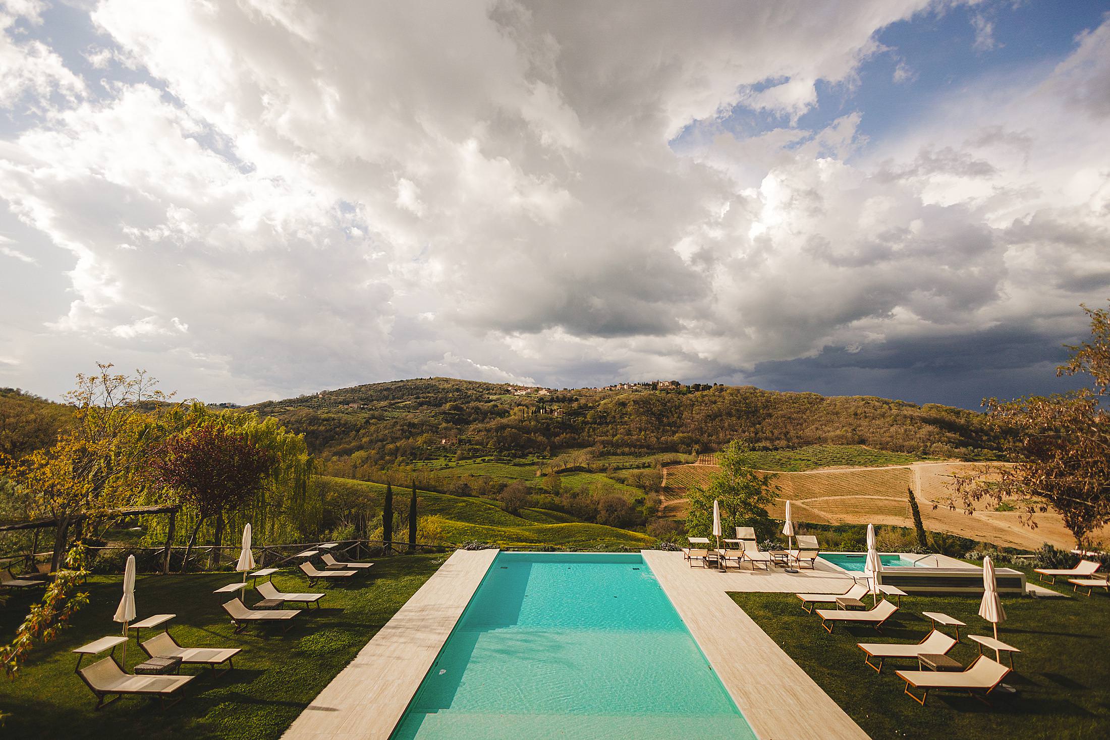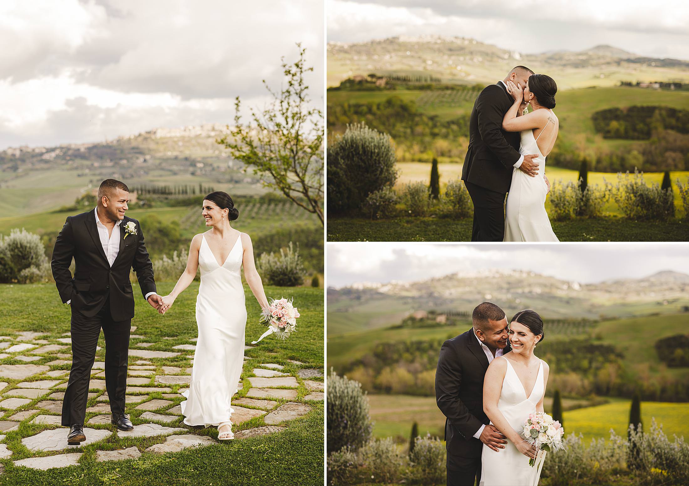 Elopement portraits with a view, at the Lupaia Boutique Hotel in the Val d’Orcia. Photo by the Italian elegant and creative elopement photographer in Tuscany based Florence Gabriele Fani