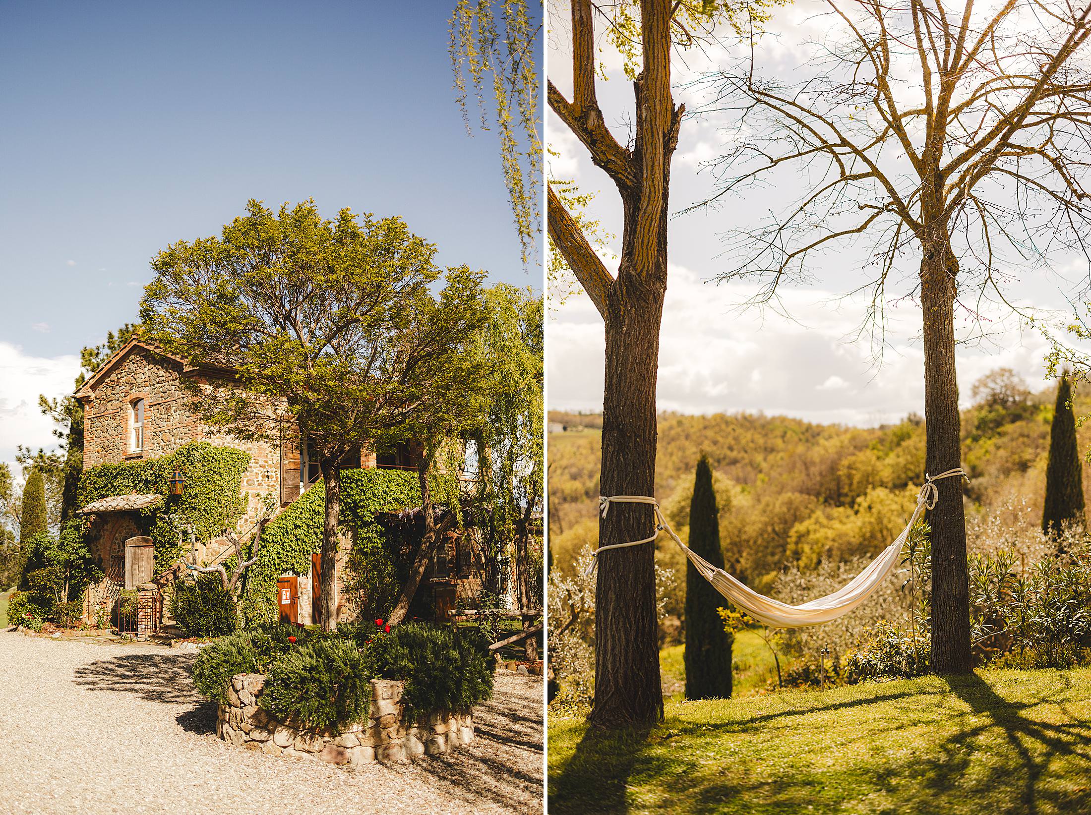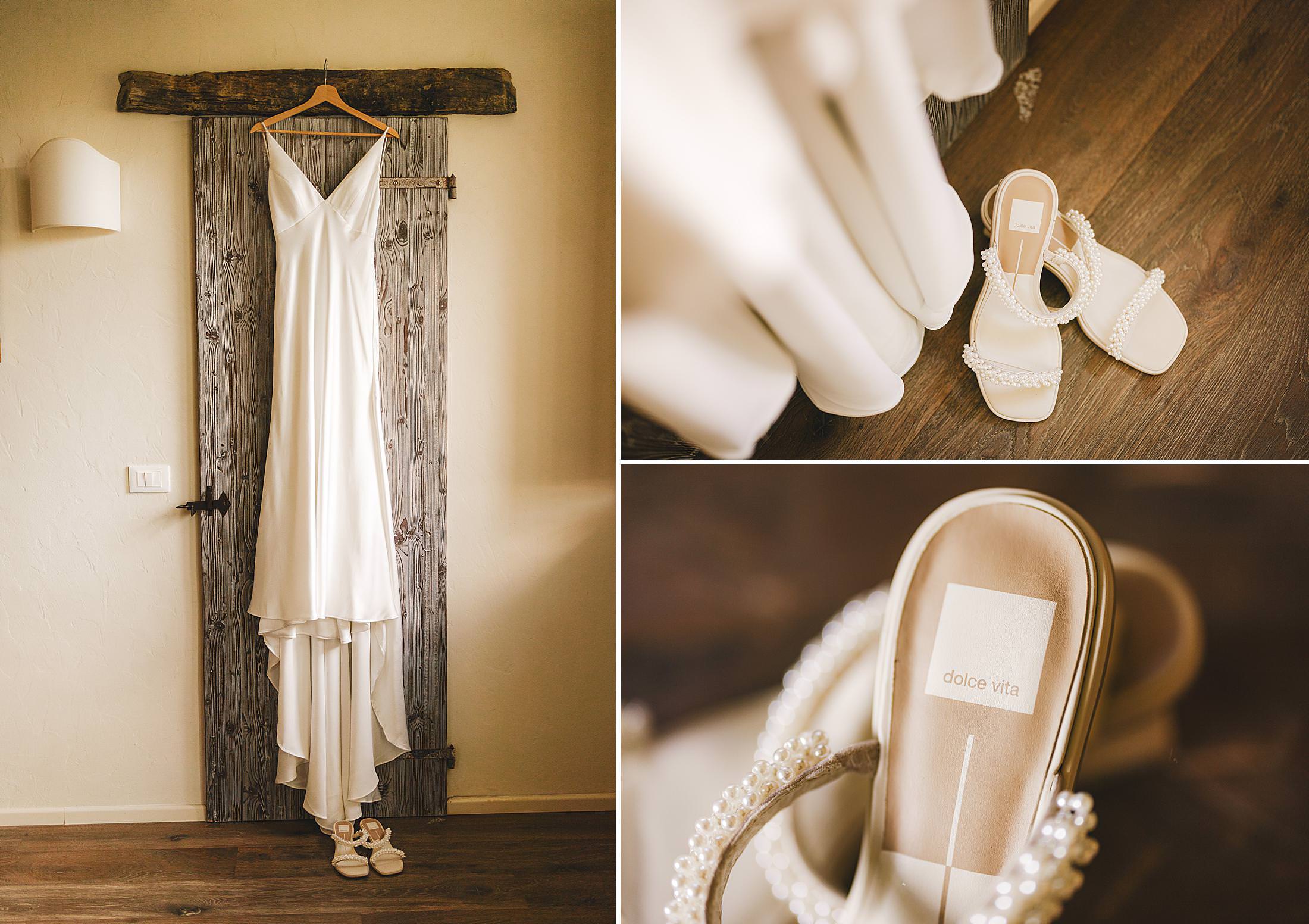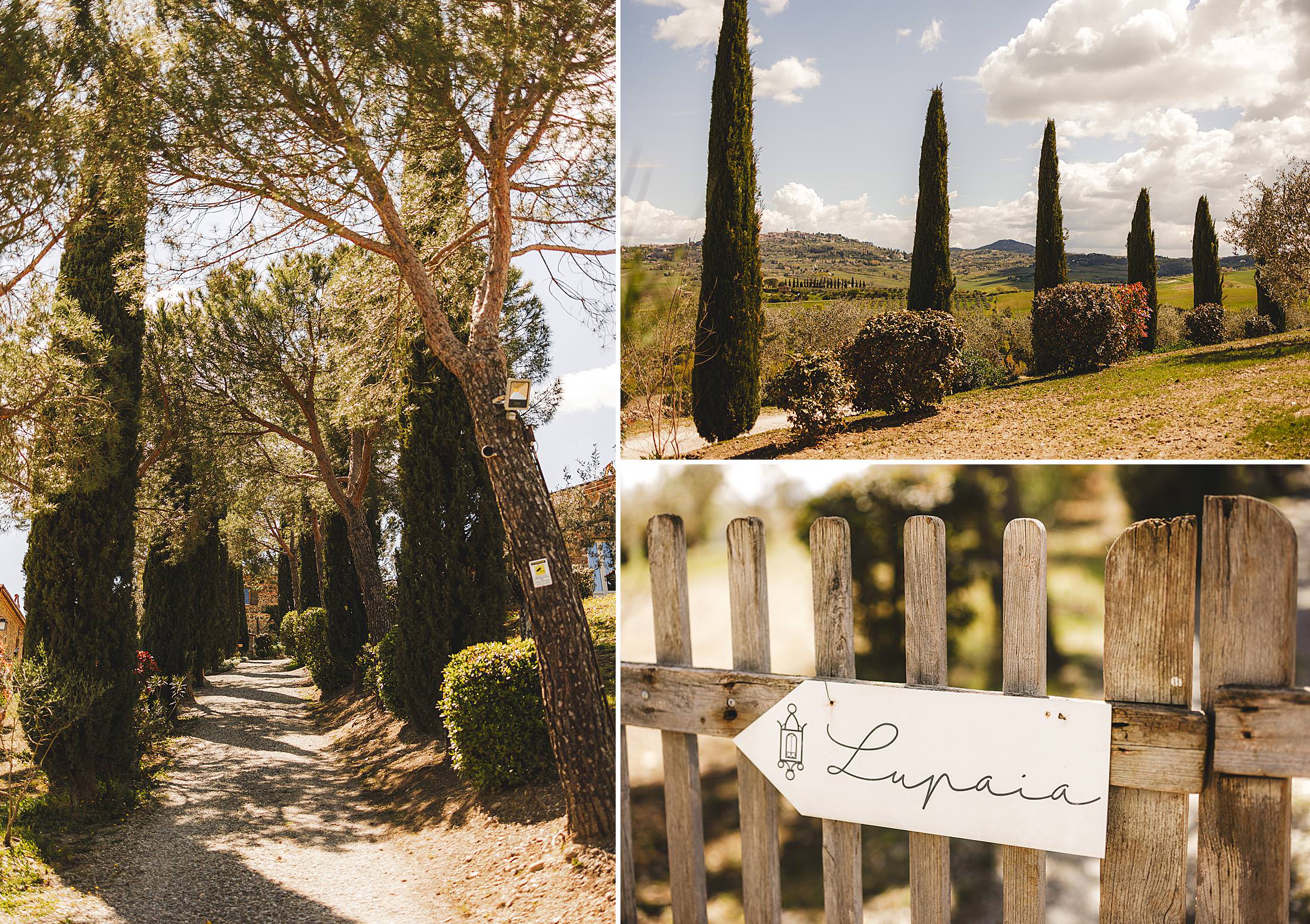 On the day of Meaghan and Hector’s elopement photoshoot, late April graced us with the most idyllic weather: warm, sunlit and with that soft glow that Tuscany does so well. The event began with quiet anticipation as Meaghan got ready in one of Lupaia’s charming suites. The soft, rustic interiors added to the romance of the moment and, as her photographer, I focused on capturing the delicate details: her dress hanging by the window, the graceful bouquet of fresh flowers and the final touches before stepping outside.