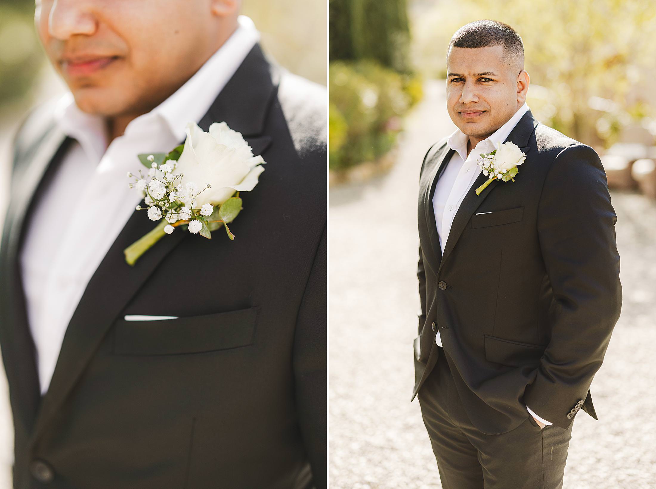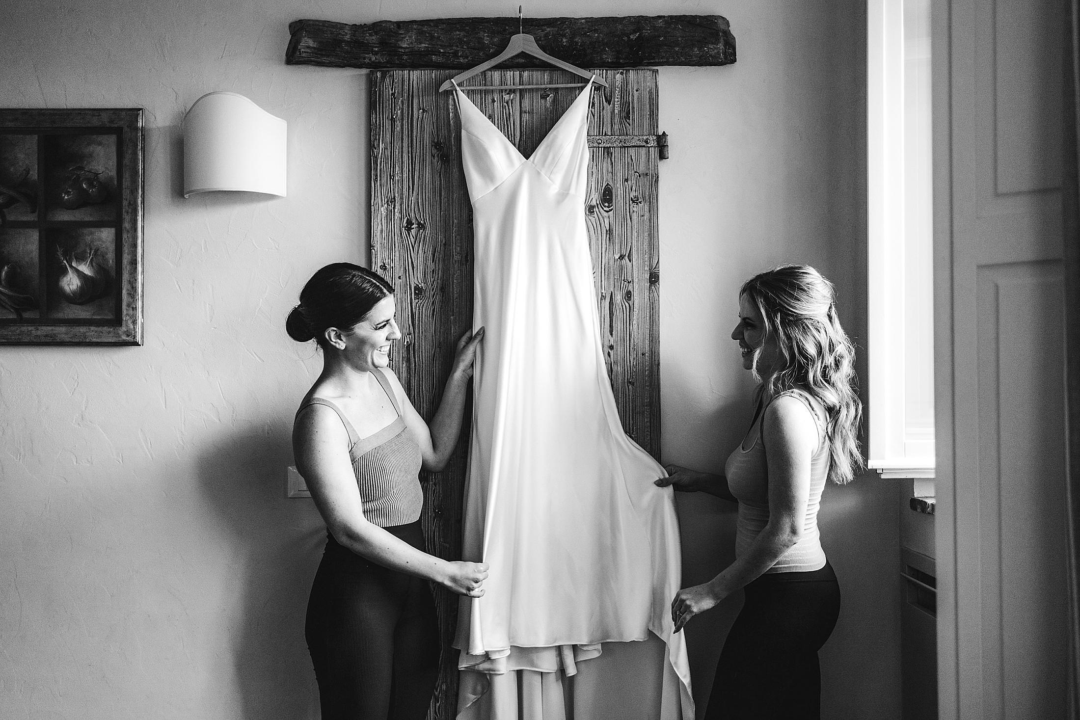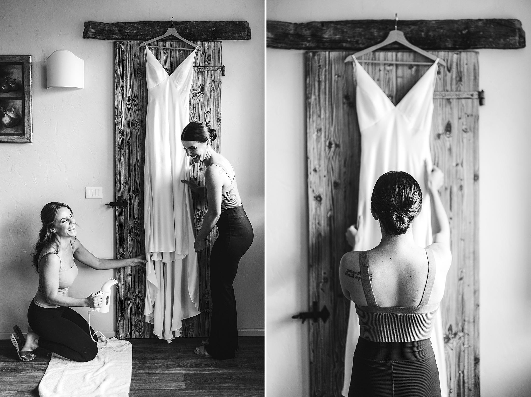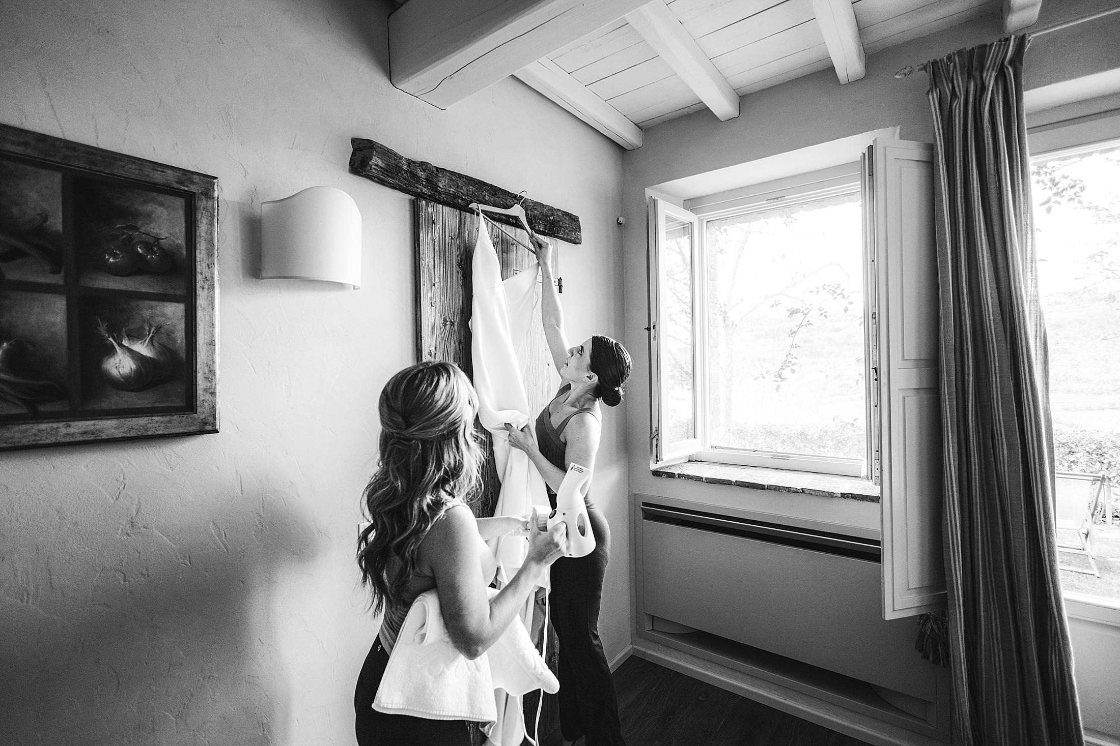 On the day of Meaghan and Hector’s elopement photoshoot, late April graced us with the most idyllic weather: warm, sunlit and with that soft glow that Tuscany does so well. The event began with quiet anticipation as Meaghan got ready in one of Lupaia’s charming suites. The soft, rustic interiors added to the romance of the moment and, as her photographer, I focused on capturing the delicate details: her dress hanging by the window, the graceful bouquet of fresh flowers and the final touches before stepping outside.