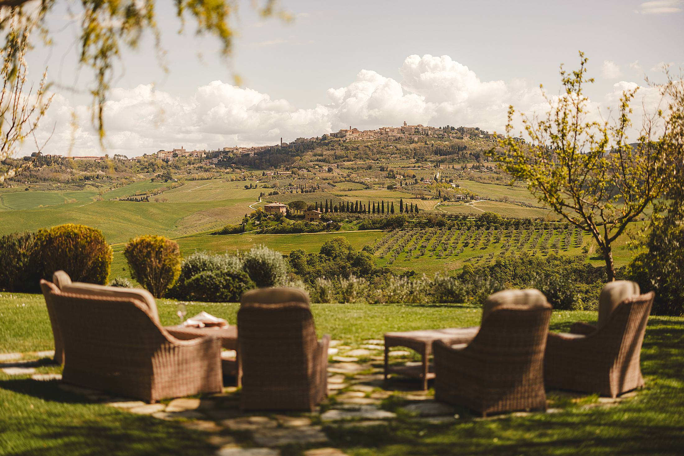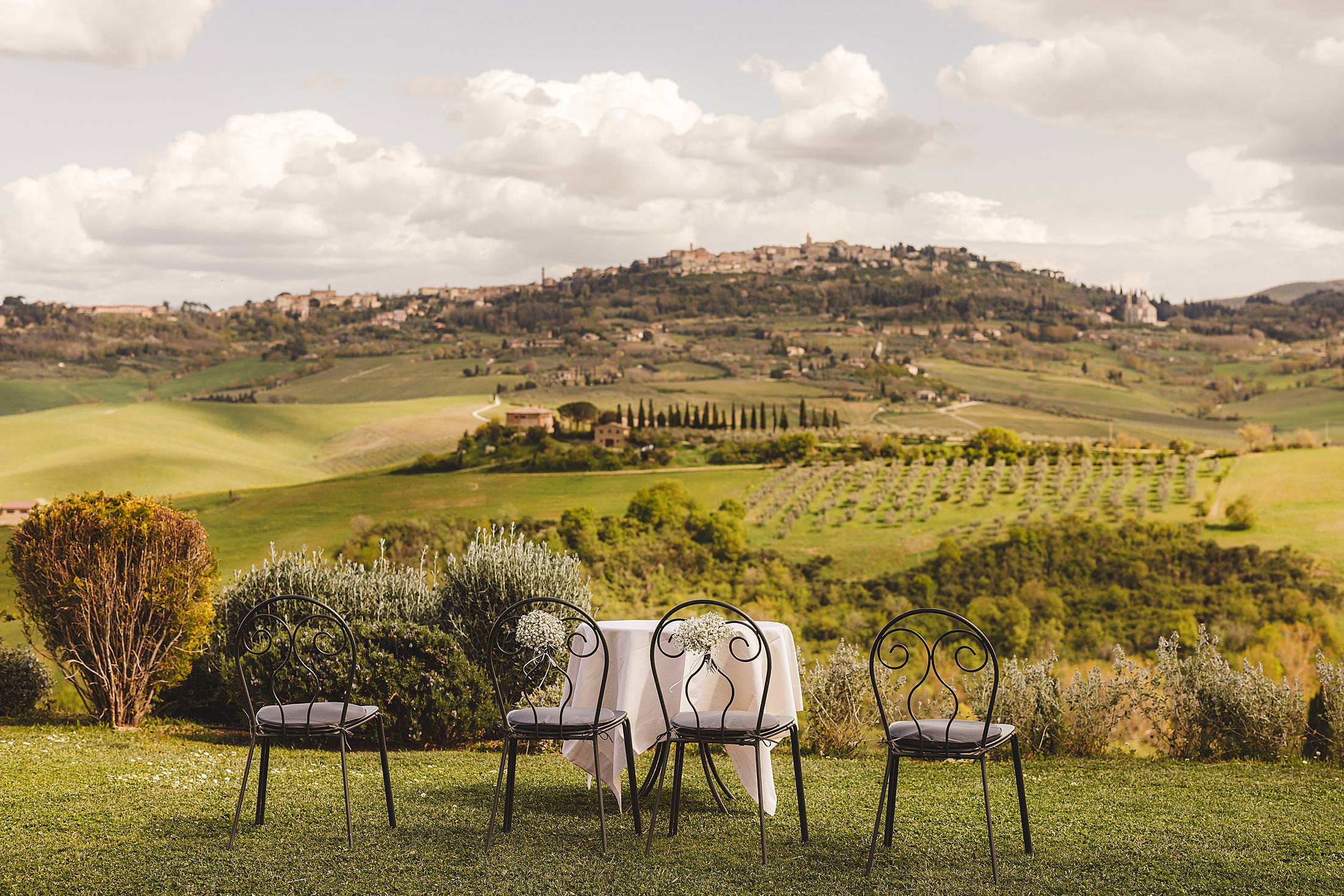 Lovely elopement wedding ceremony setup with the view of the Tuscany countryside at Lupaia Boutique hotel. Photo by the Italian elegant and creative elopement photographer in Tuscany based Florence Gabriele Fani