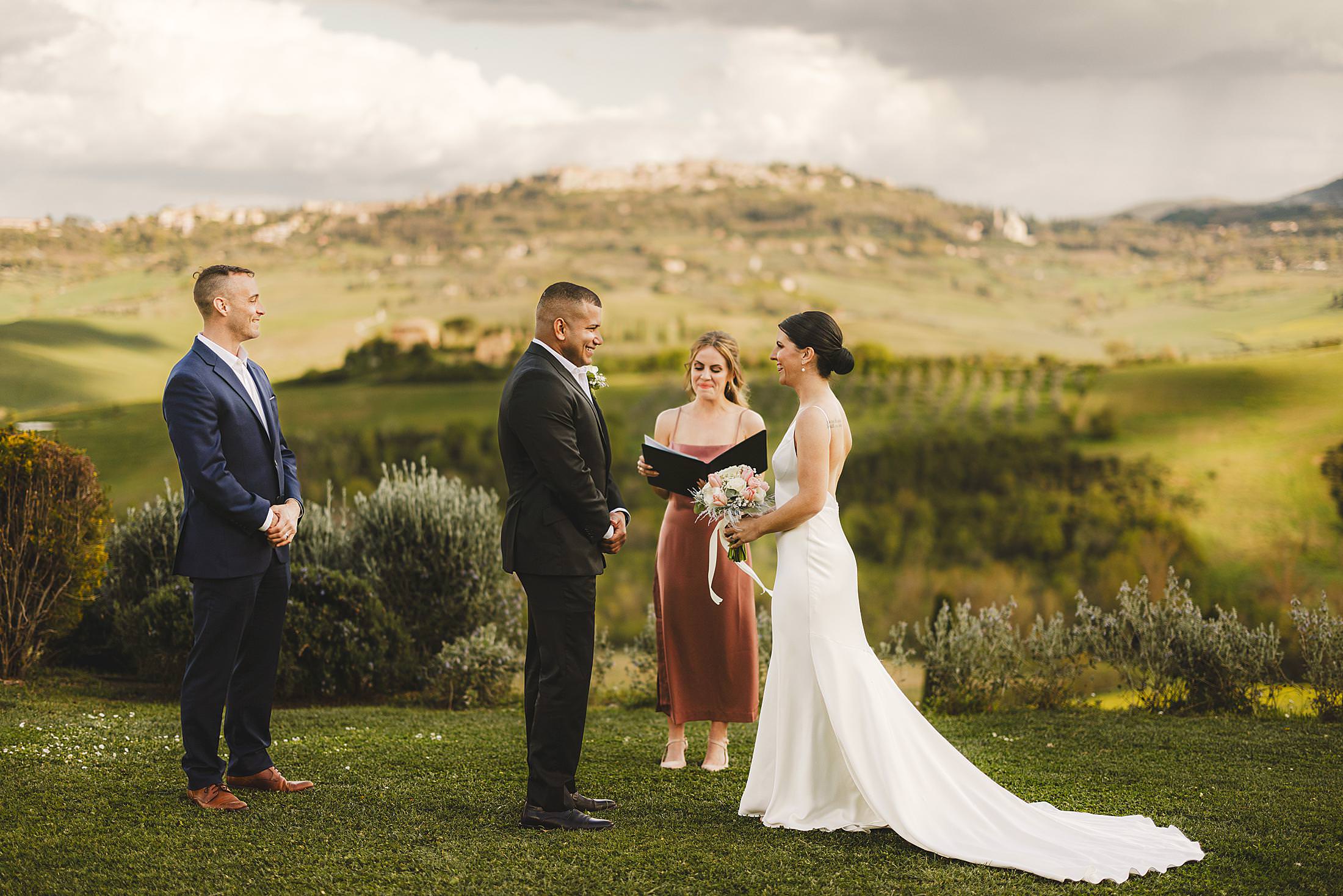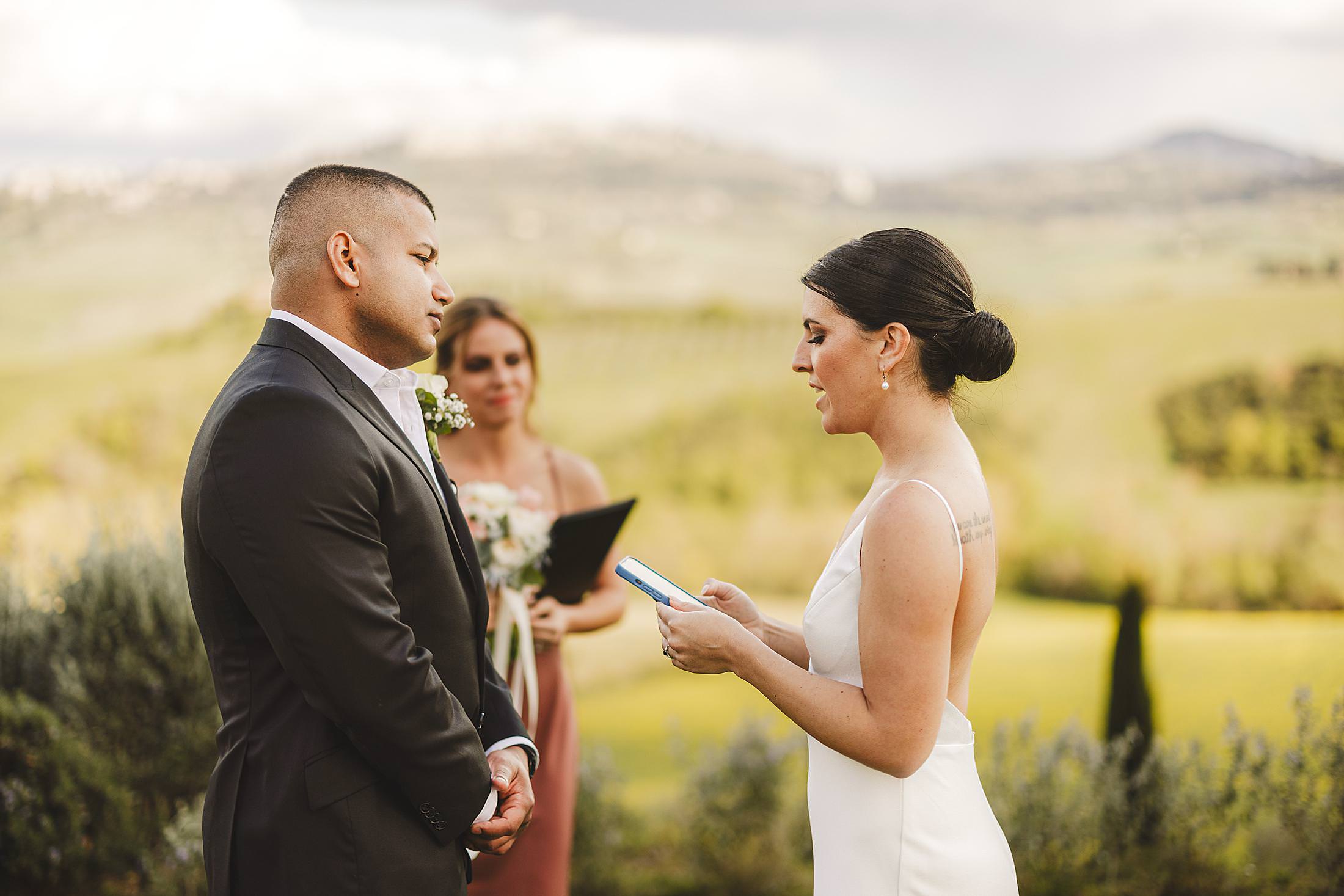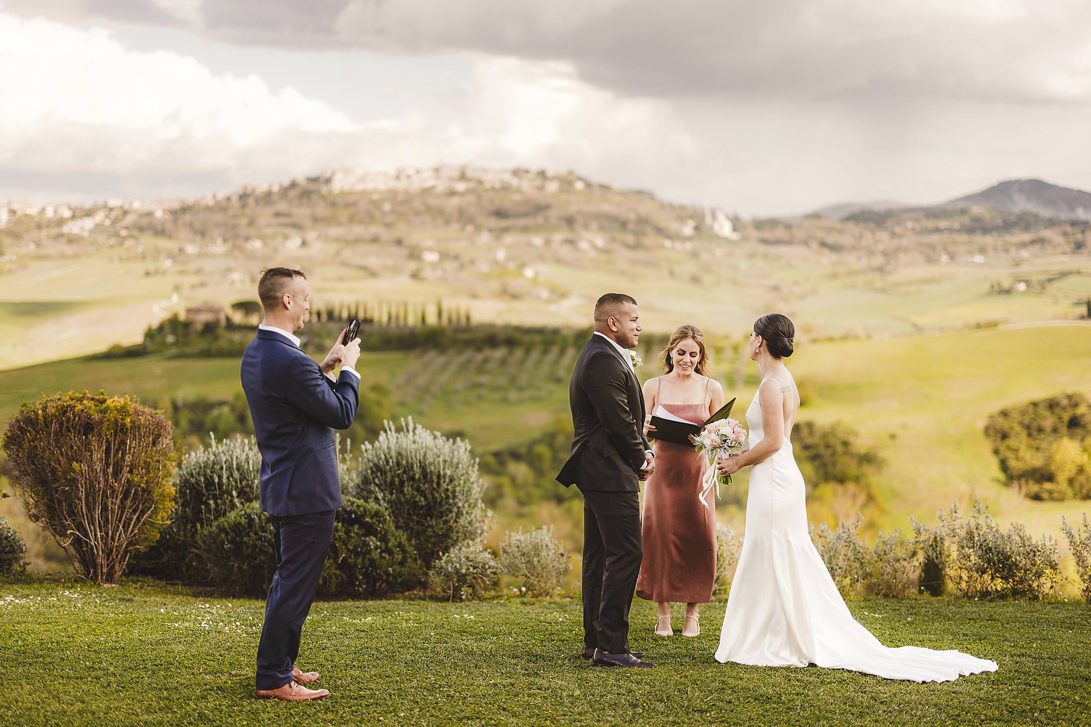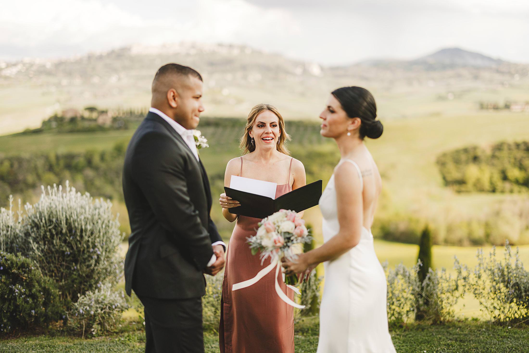 Unforgettable and unique elopement symbolic ceremony with panoramic views of the Tuscan hills at Lupaia hotel. Photo by the Italian elegant and creative elopement photographer in Tuscany based Florence Gabriele Fani