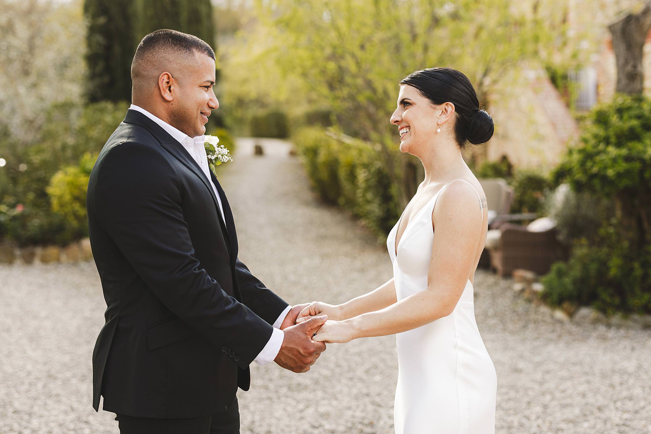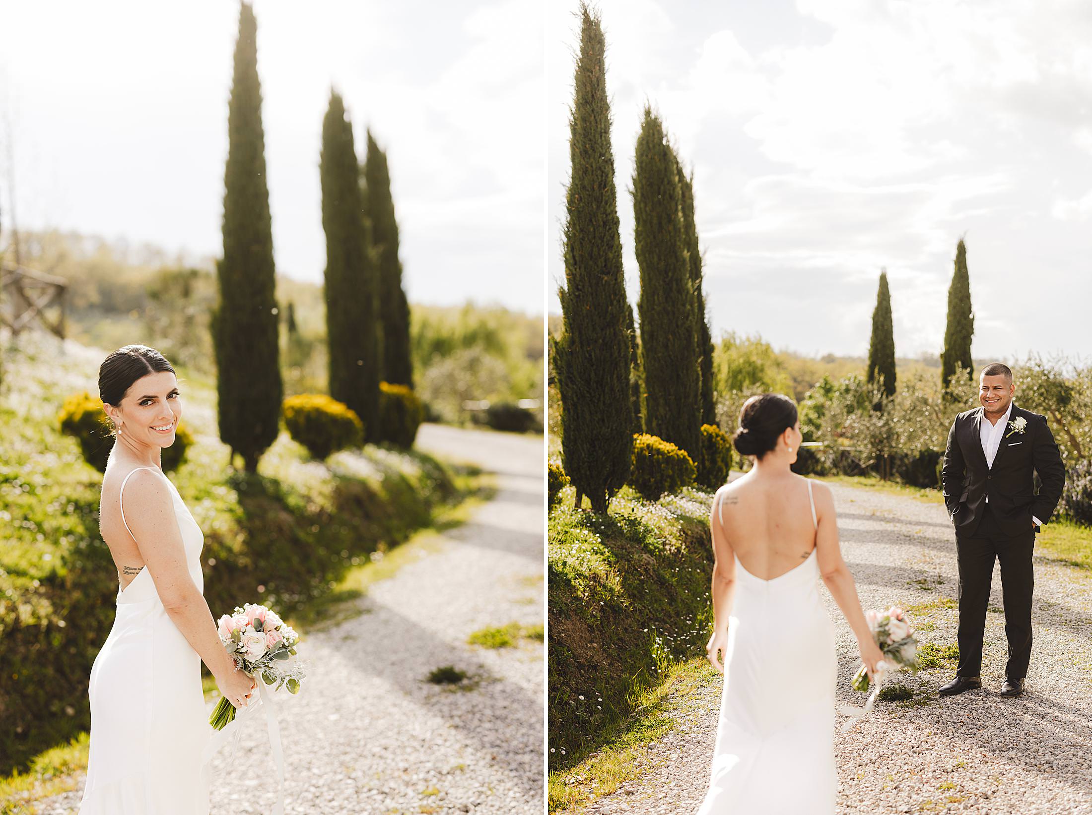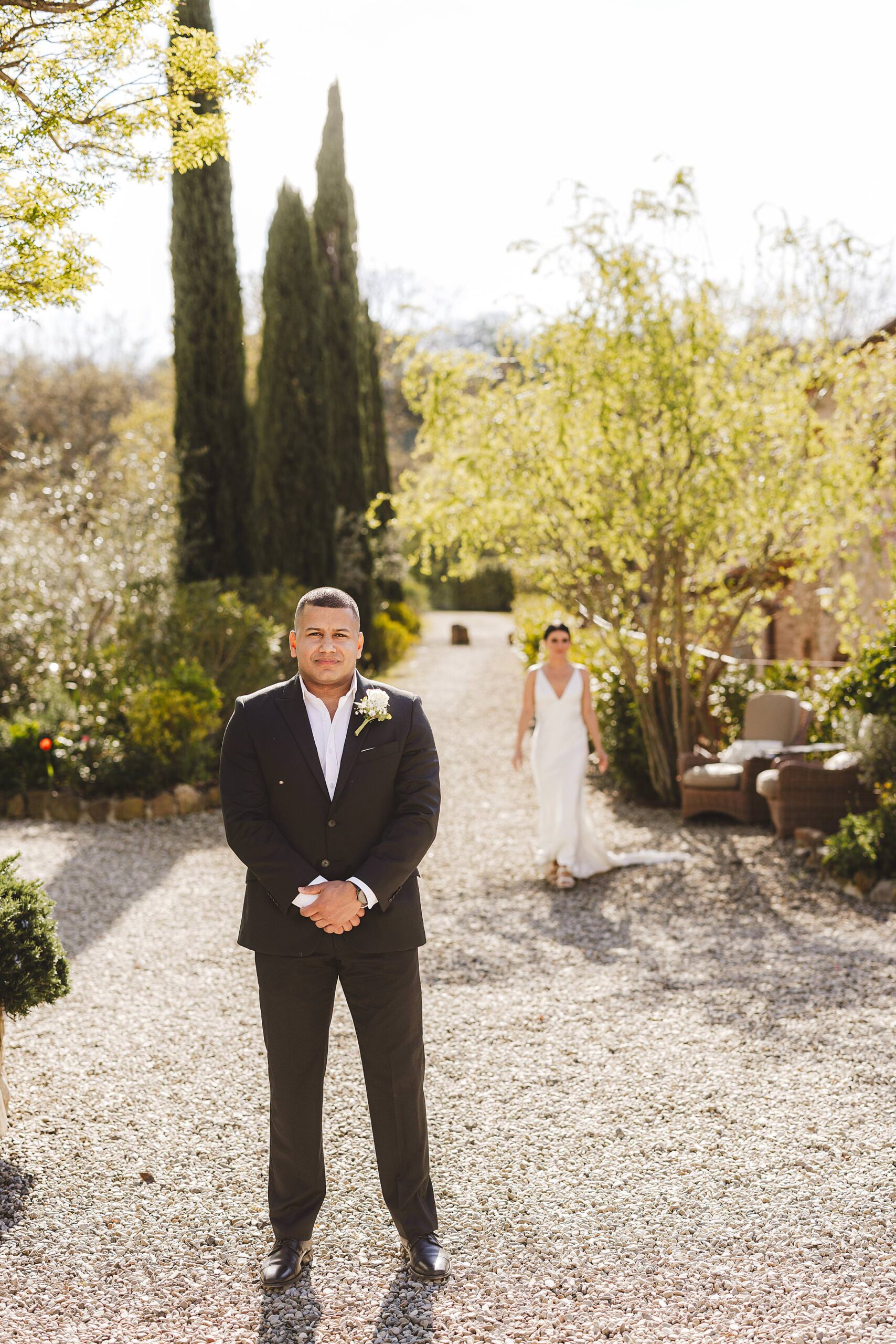 Bride and groom elopement wedding first look at Lupaia hotel in the Val d’Orcia heart of Tuscany countryside. Photo by the Italian elegant and creative elopement photographer in Tuscany based Florence Gabriele Fani