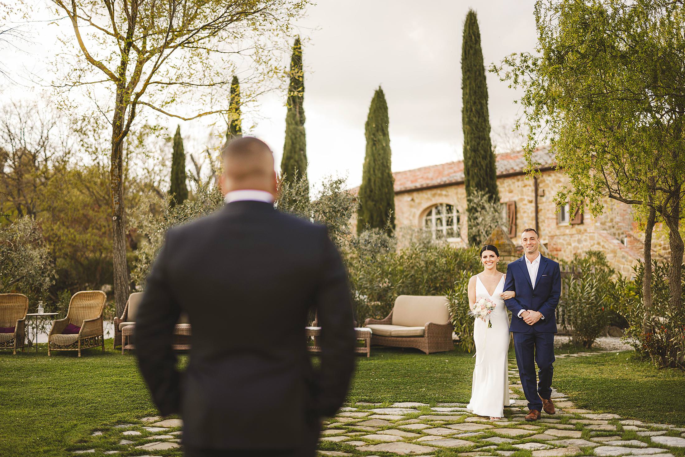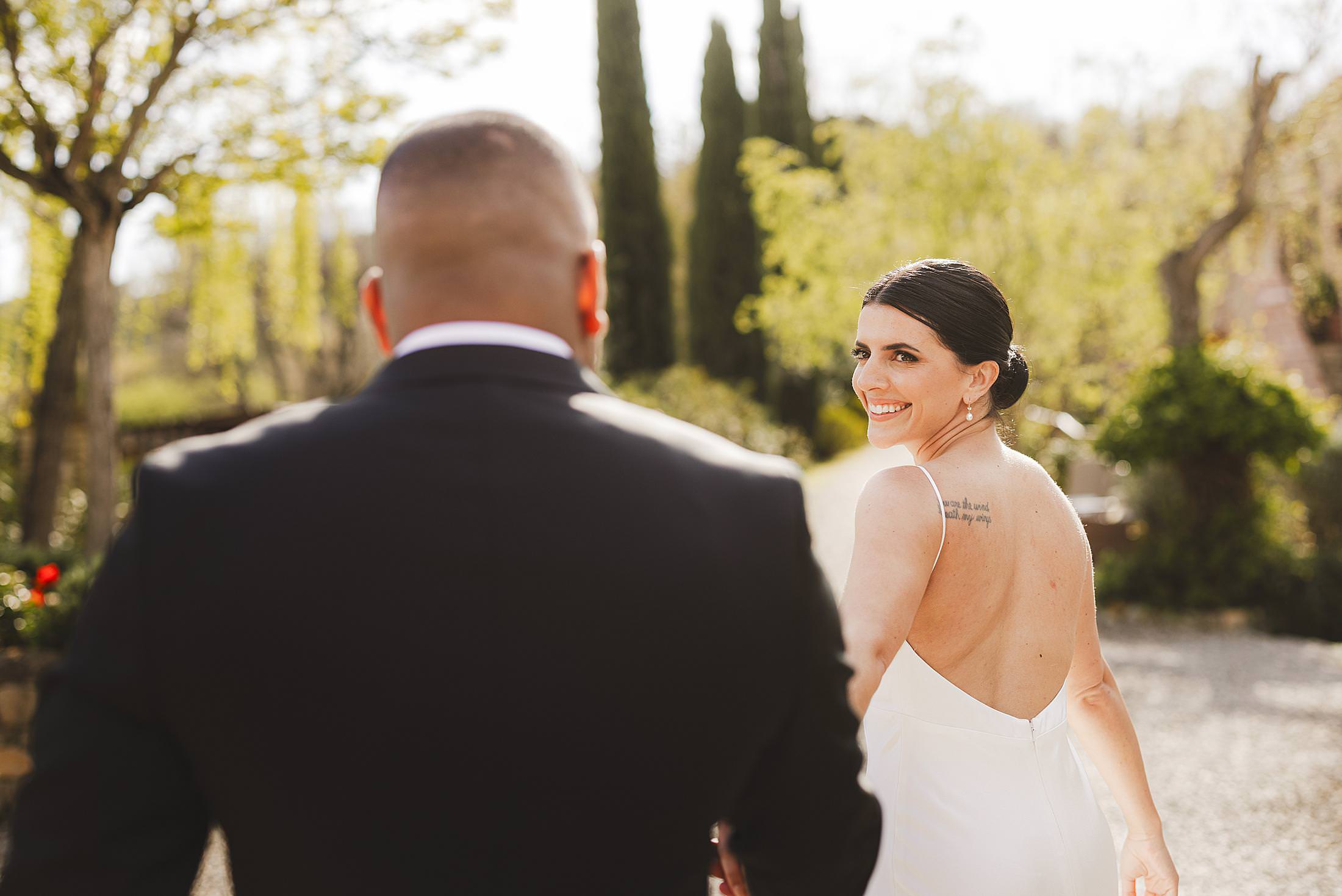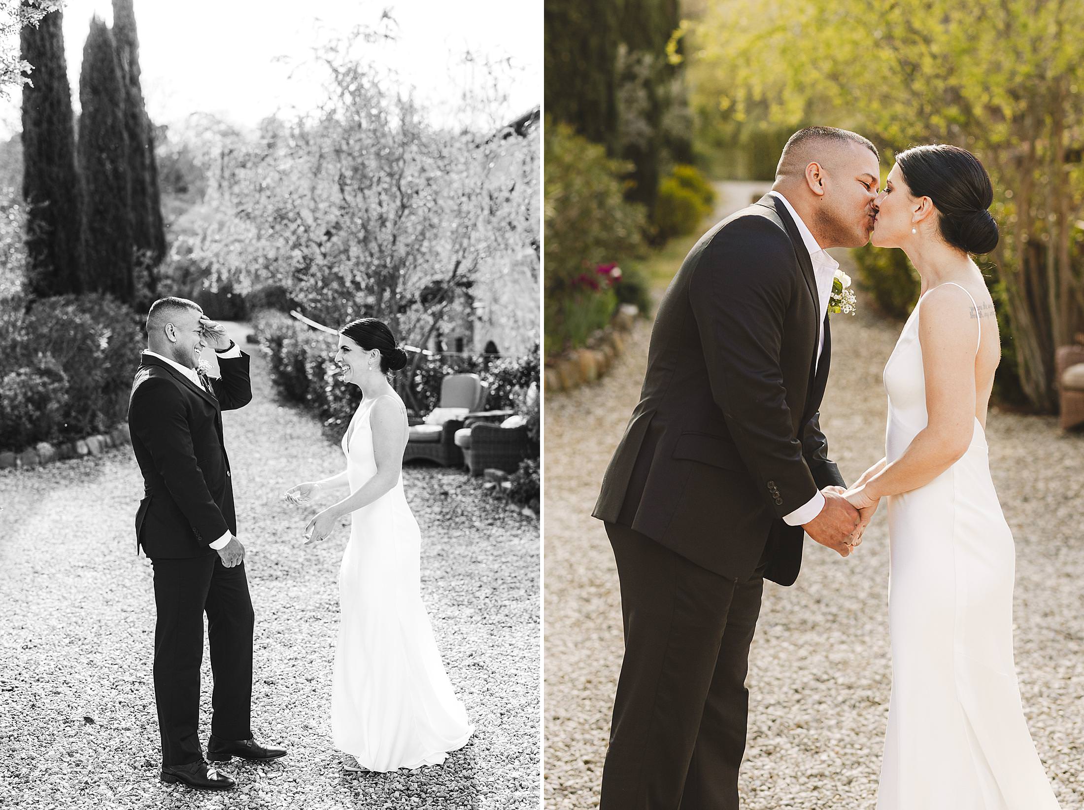 Bride and groom elopement wedding first look at Lupaia hotel in the Val d’Orcia heart of Tuscany countryside. Photo by the Italian elegant and creative elopement photographer in Tuscany based Florence Gabriele Fani