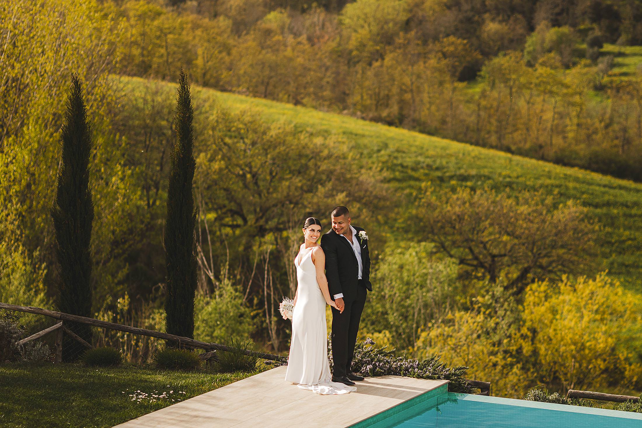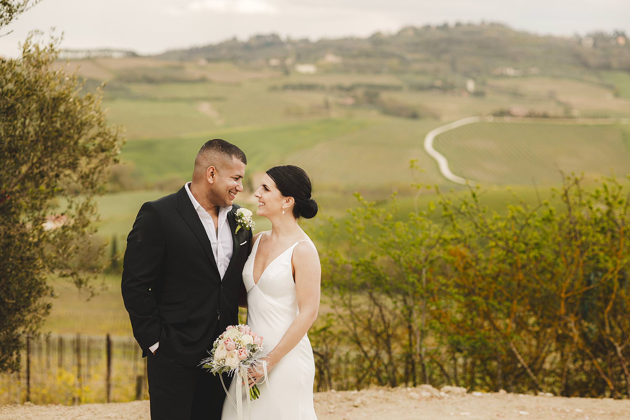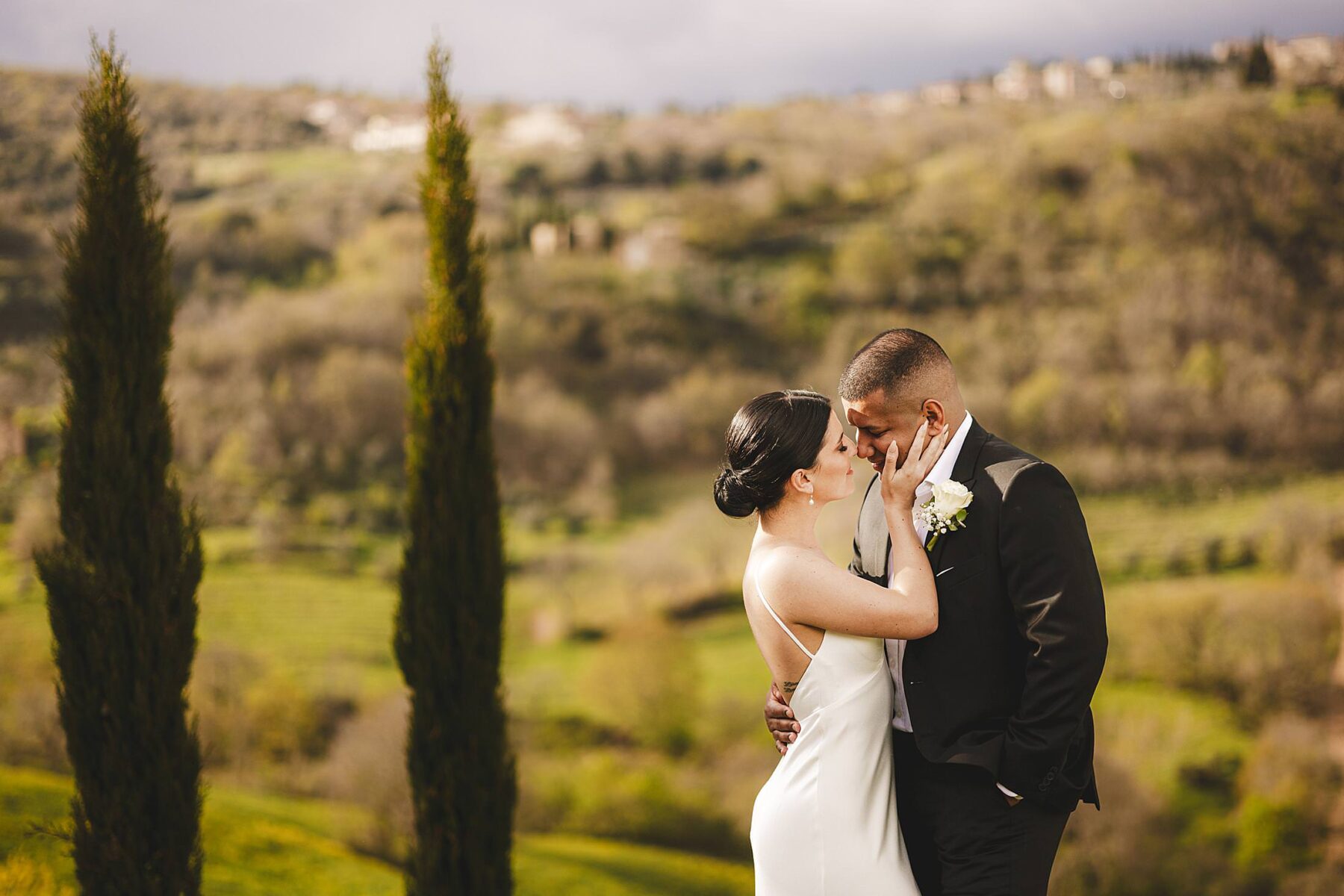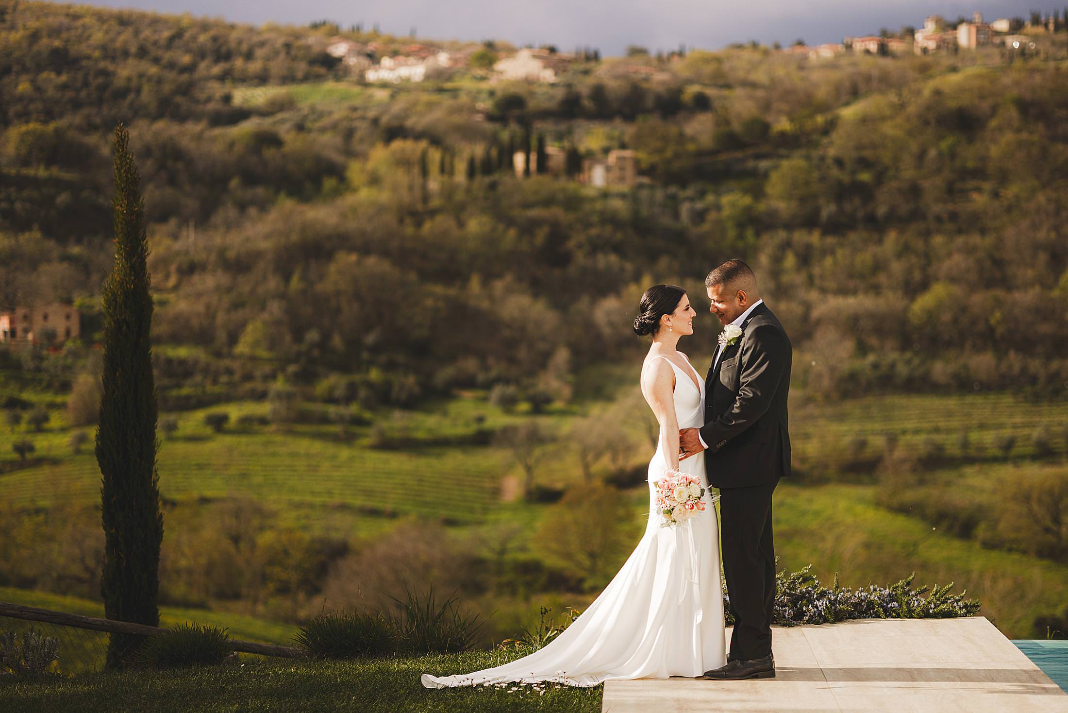 Portraits with a view, at the Lupaia Boutique Hotel. Bride and groom just eloped in Tuscany. Photo by the Italian elegant and creative elopement photographer in Tuscany based Florence Gabriele Fani