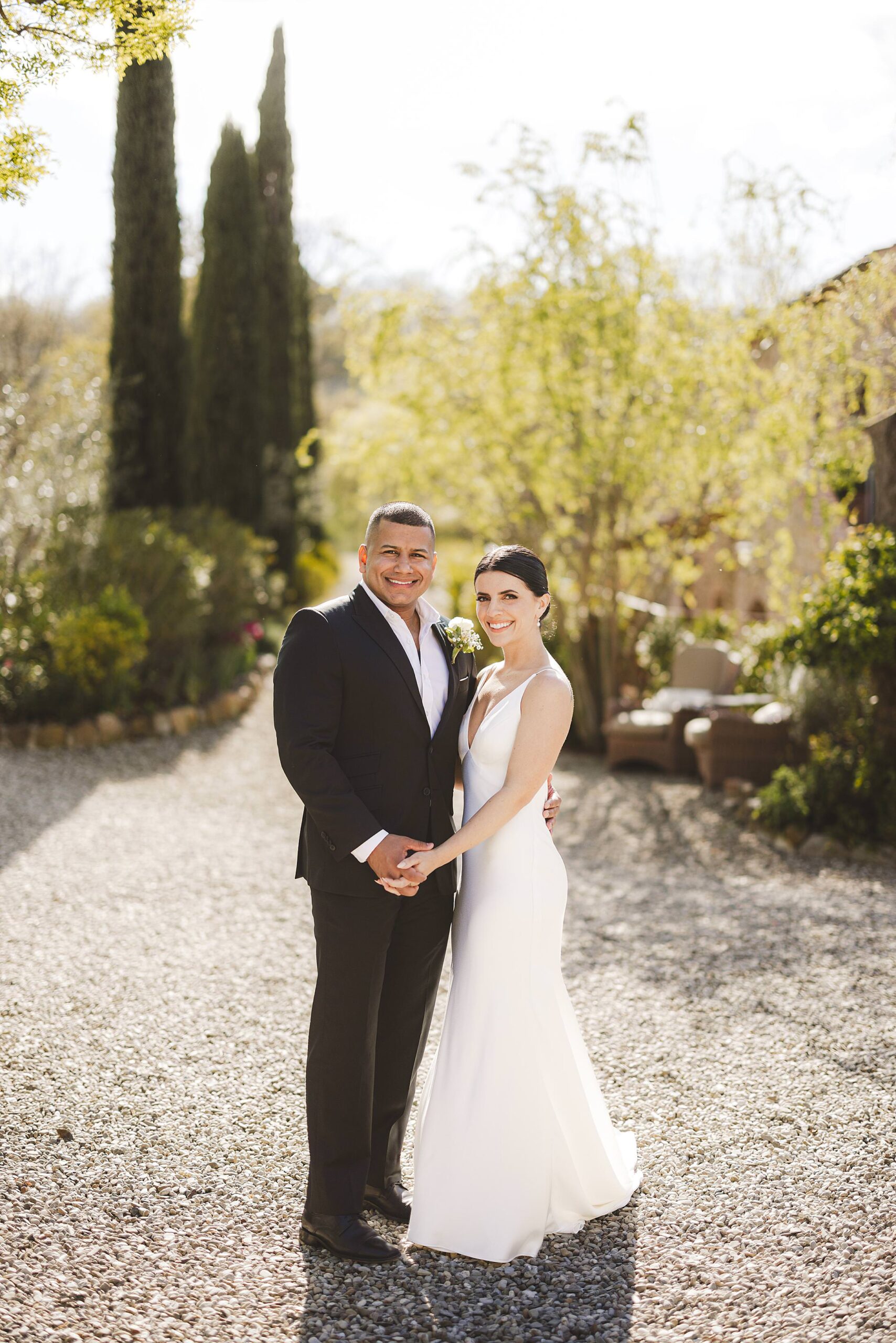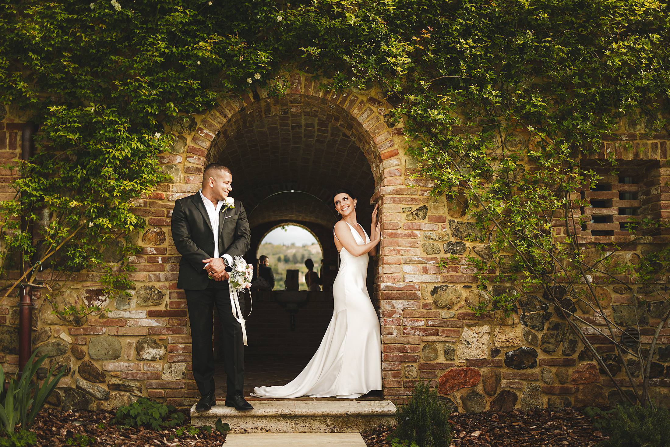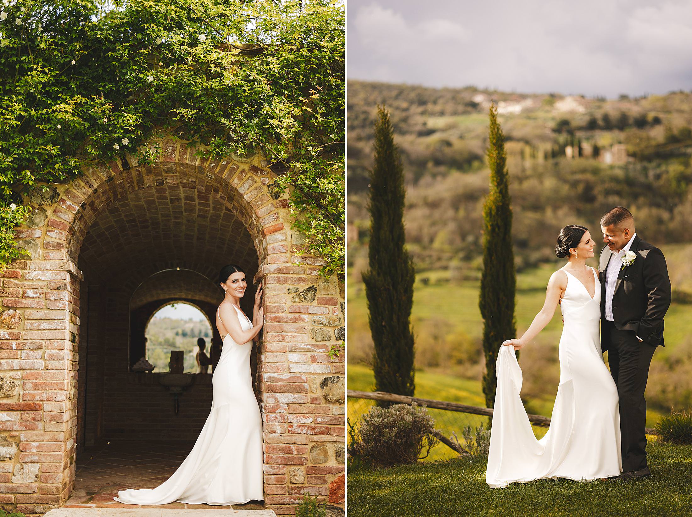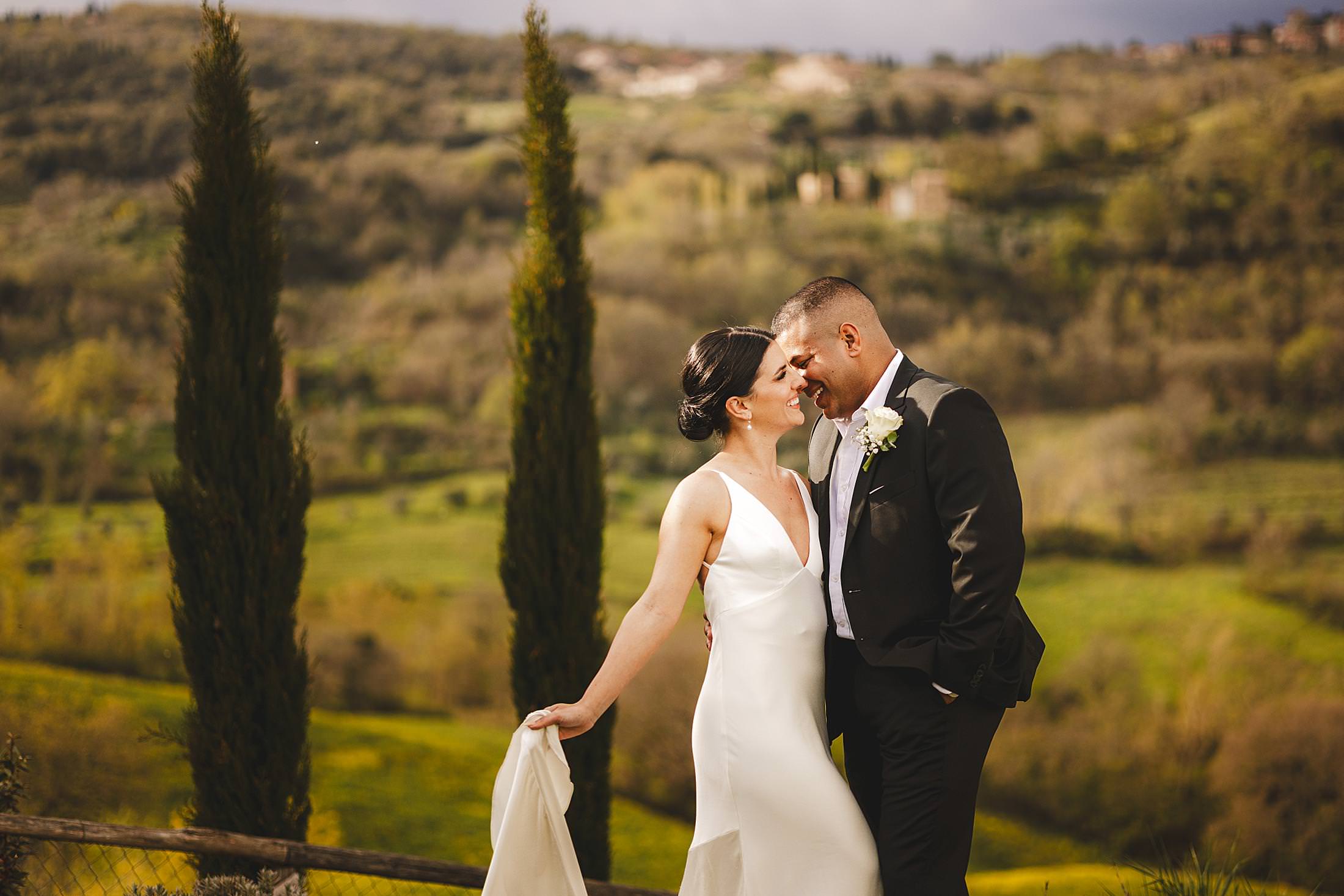 Portraits with a view, at the Lupaia Boutique Hotel. Bride and groom just eloped in Tuscany. Photo by the Italian elegant and creative elopement photographer in Tuscany based Florence Gabriele Fani