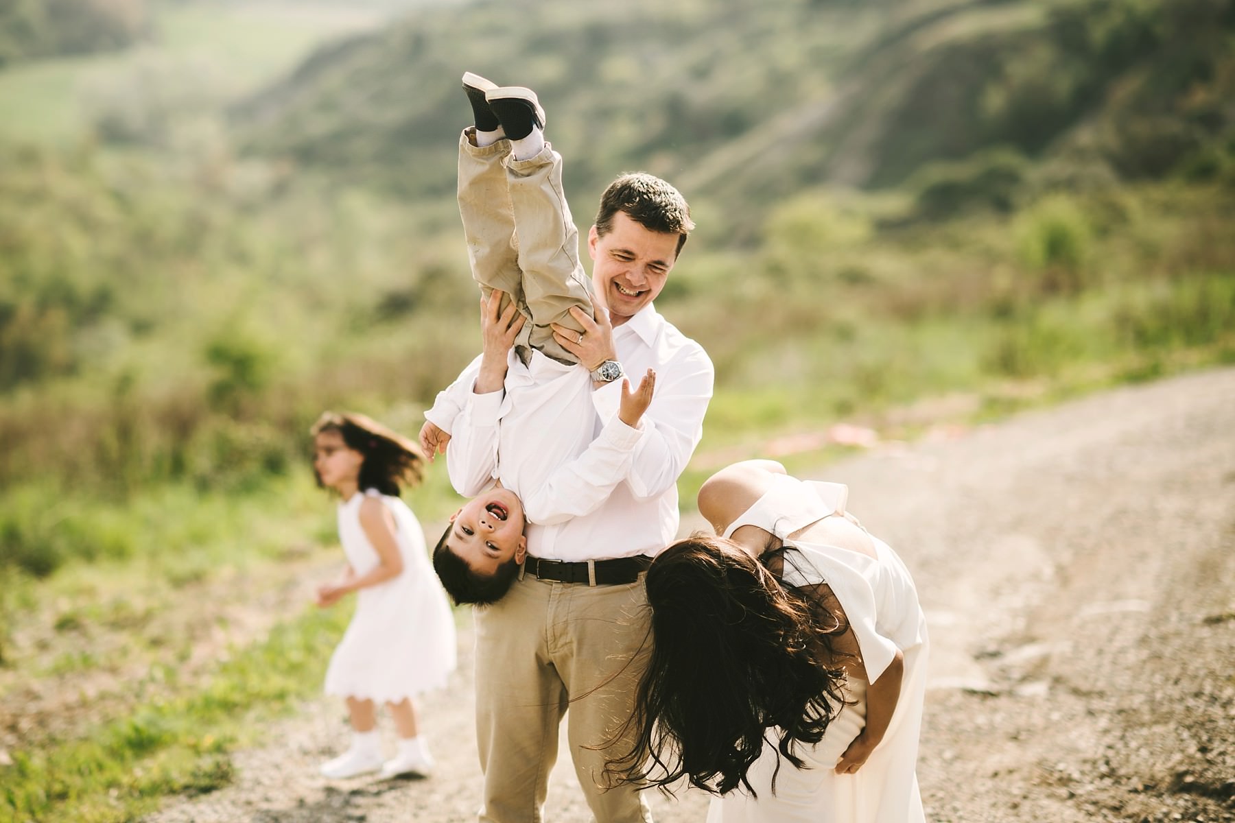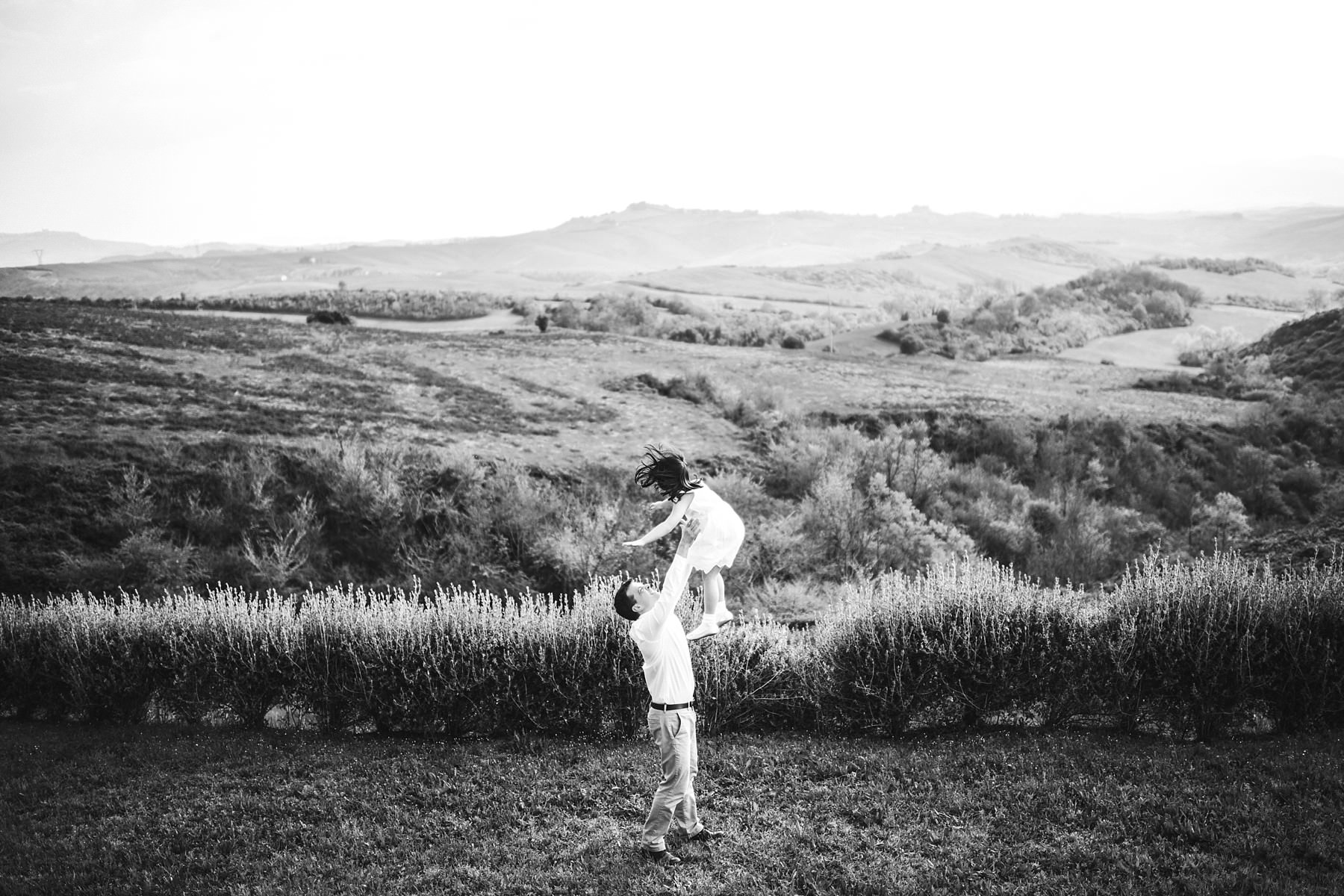 Dad and daughter are playing during a family photo session took place in a summer day in Tuscany countryside. Photo by the Italian Family photographer in Tuscany based Florence Gabriele Fani.
