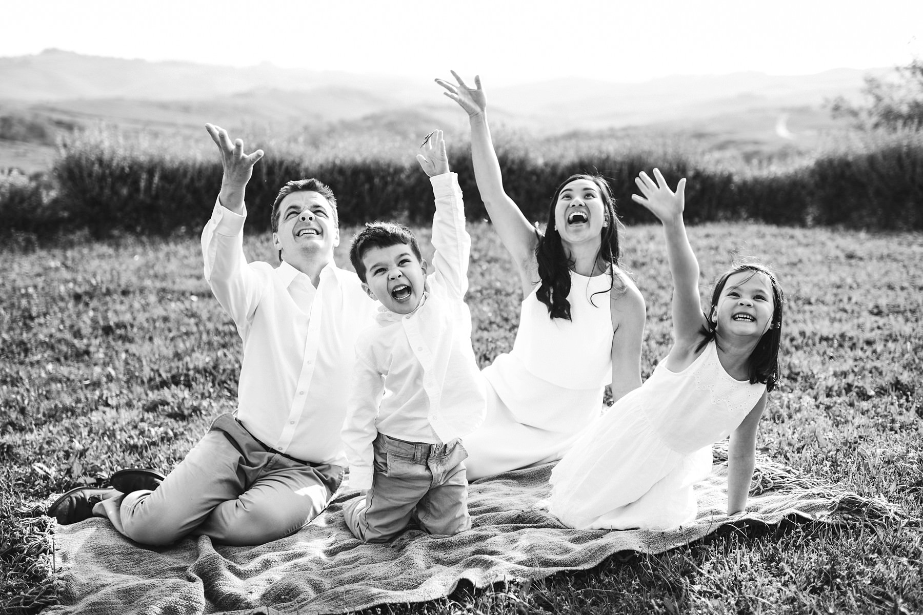 Exciting and fun summer family vacation photo shoot in Tuscany countryside. Mom, dad and kids are enjoying some time during the photo session. Photo by the Italian elegant and creative vacation family photographer in Tuscany based Florence Gabriele Fani.