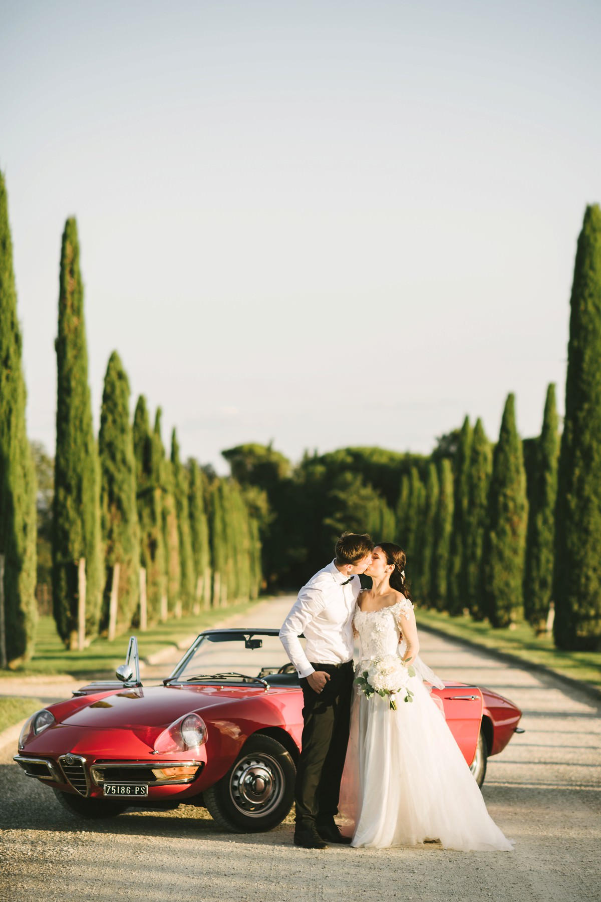 Bride and groom special kiss on Alfa Romeo spider vintage car in cypress road near Montelucci Country Resort