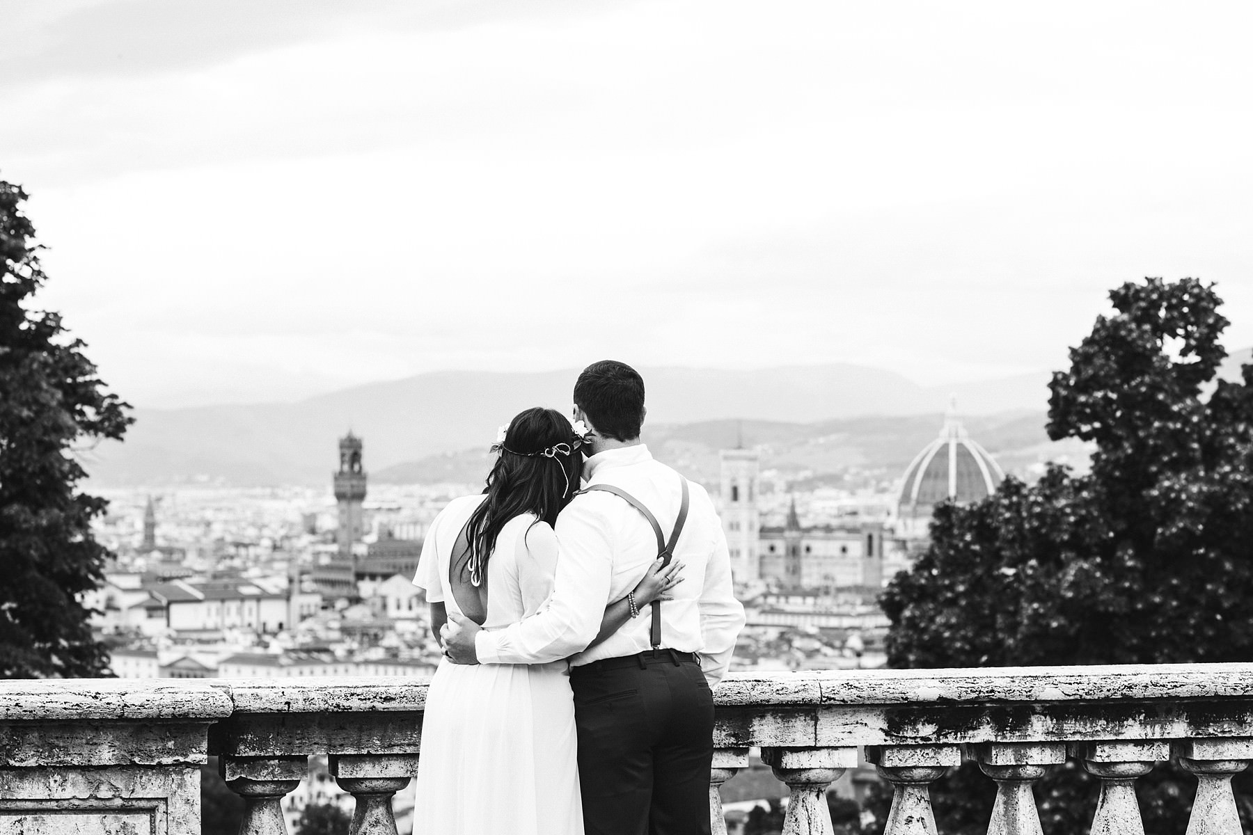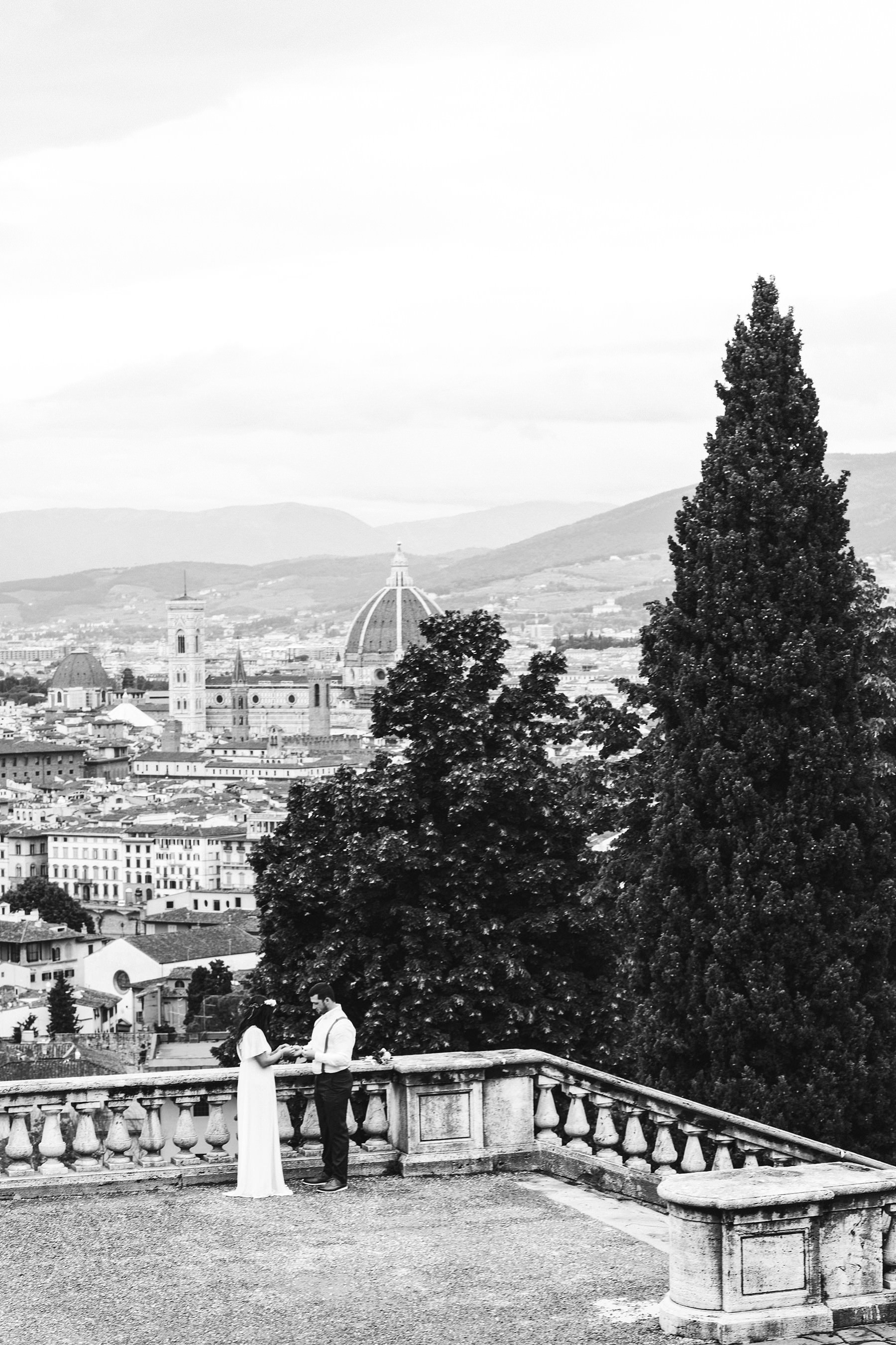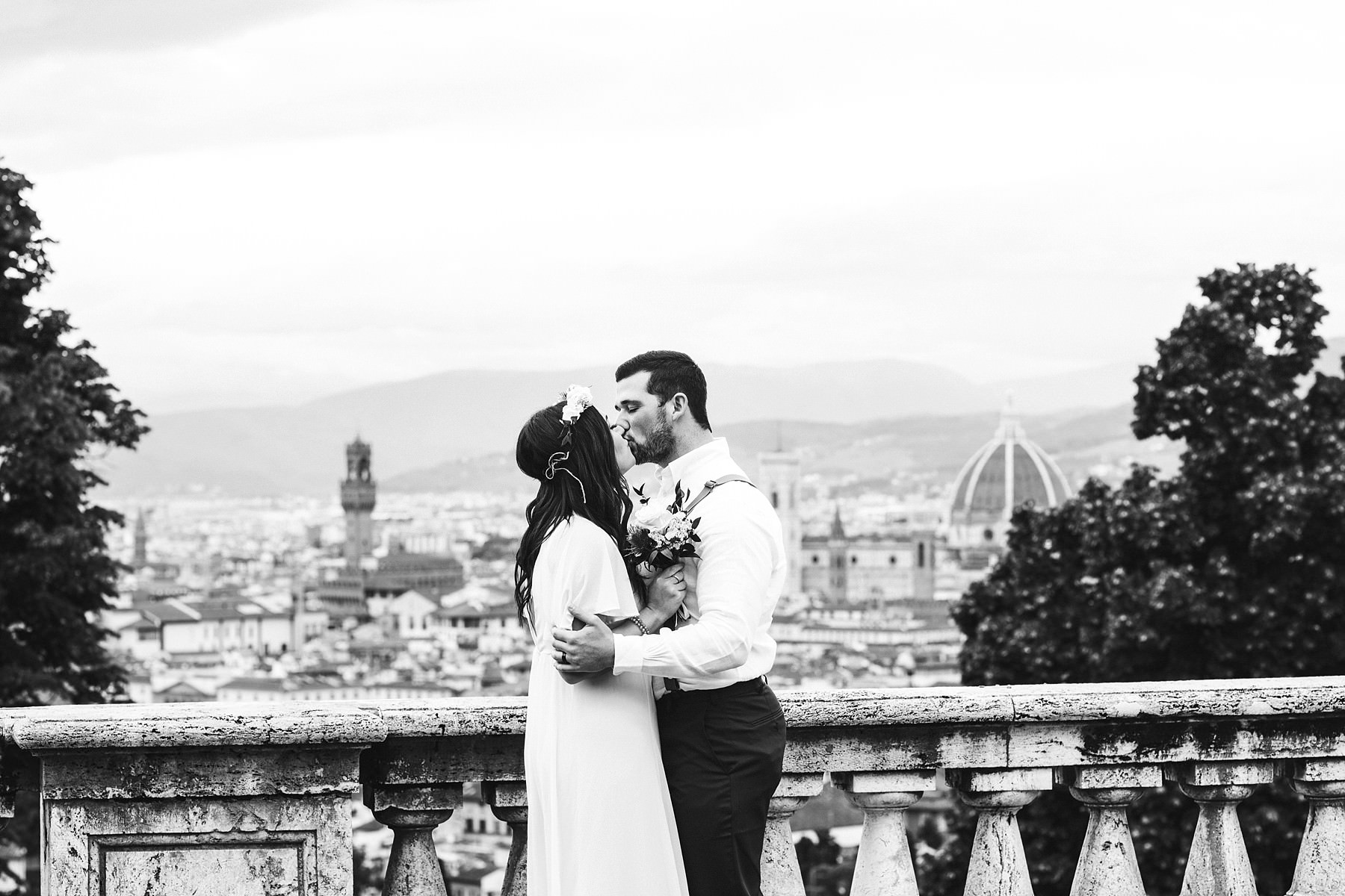 Elegant and romantic elopement wedding photo session at Piazzale Michelangelo in Florence. Photo by the creative, elegant and modern elopement wedding photographer in Tuscany based Florence Gabriele Fani
