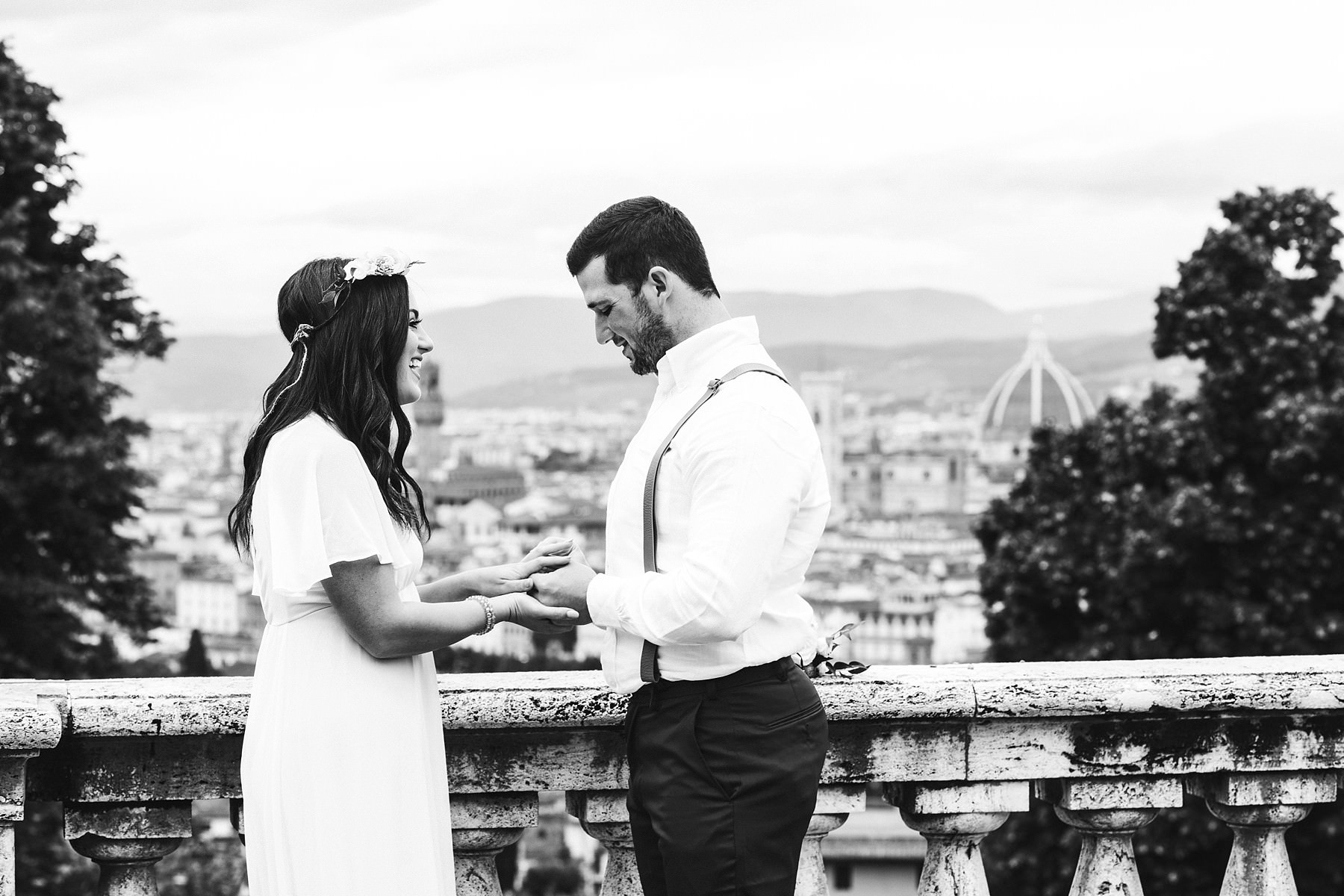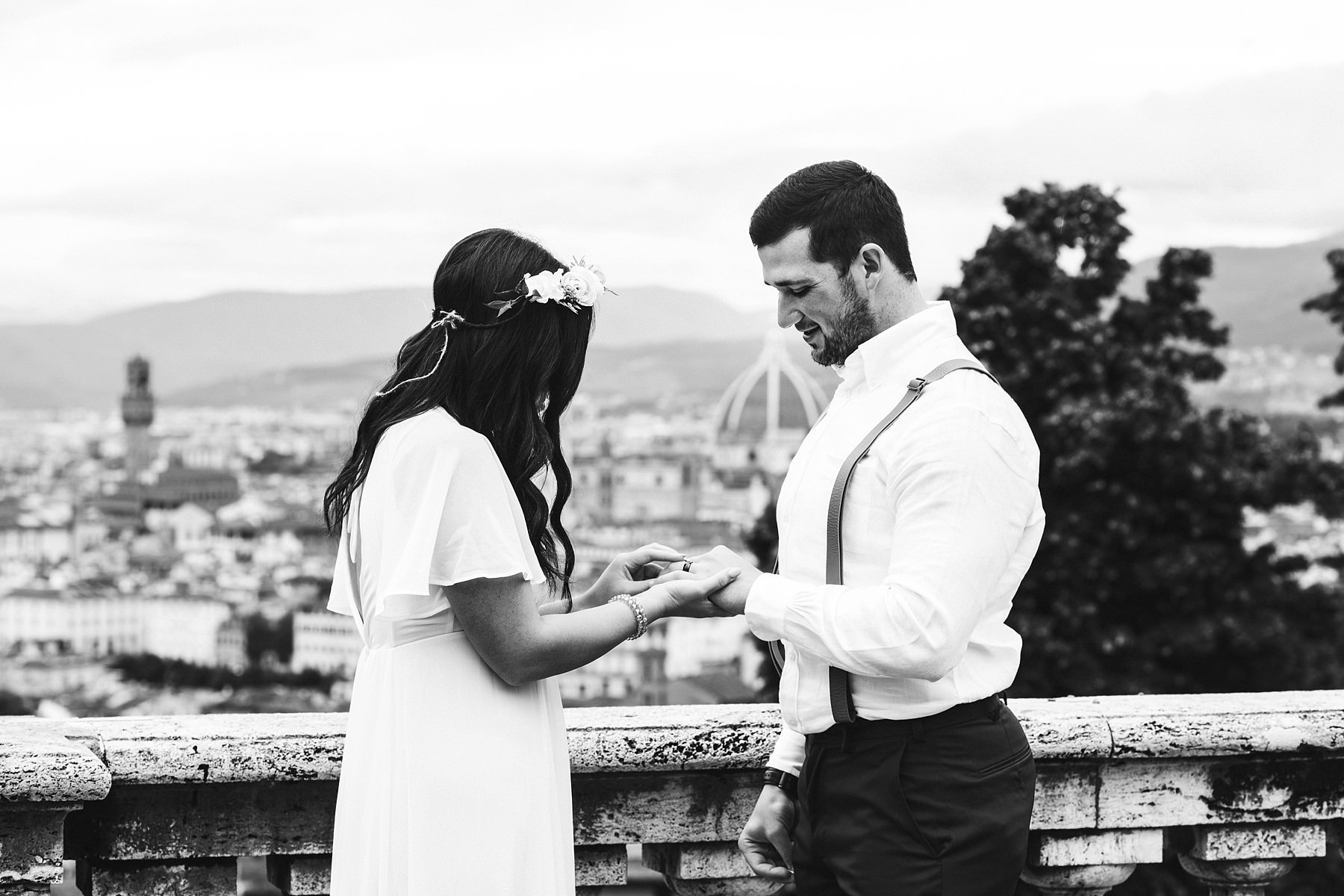 Dream elopement photo shoot in Florence. Exchanging of the ring with Florence Dome as background. Photo by the creative, elegant and modern elopement wedding photographer in Tuscany based Florence Gabriele Fani