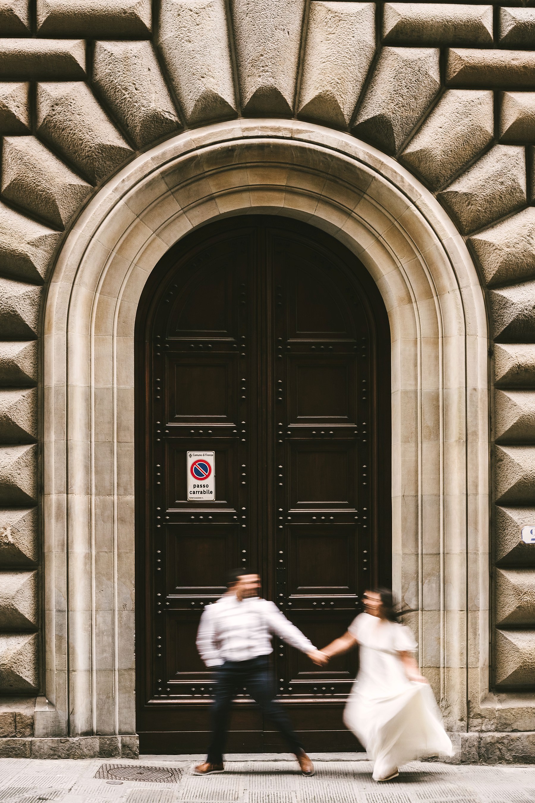 Exciting creative and modern elopement walk tour photo shoot in the historic center of Florence near Palazzo Gondi. Photo by the creative, elegant and modern elopement wedding photographer in Tuscany based Florence Gabriele Fani