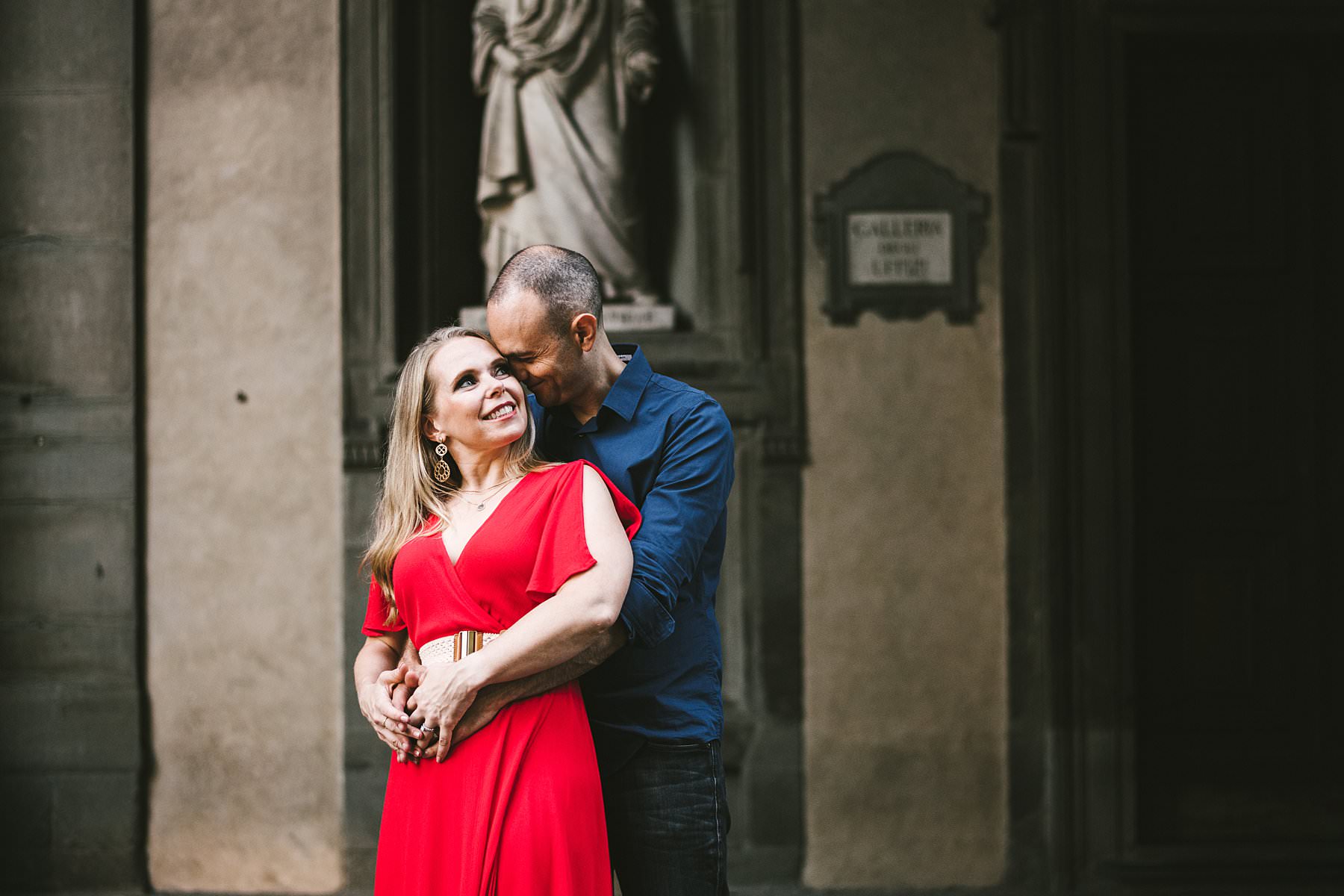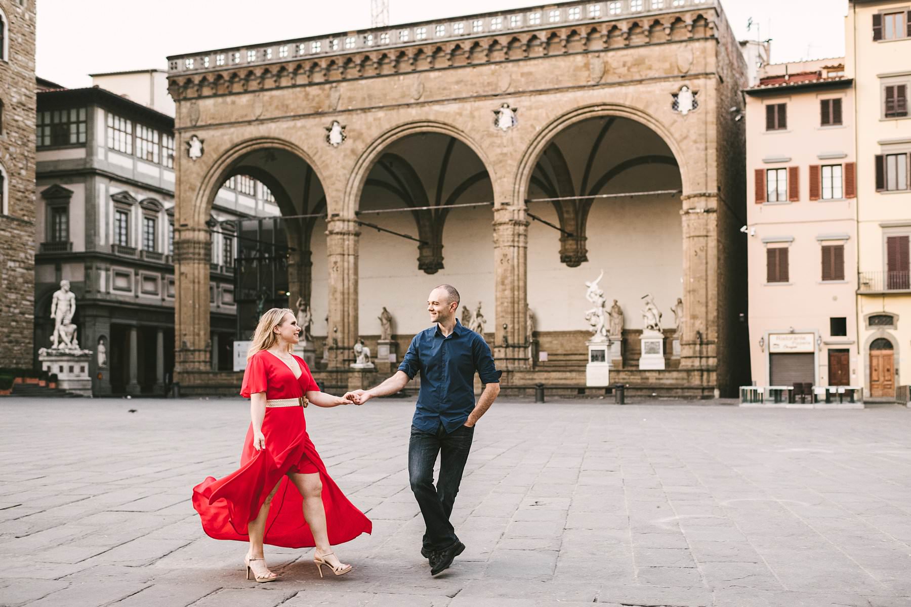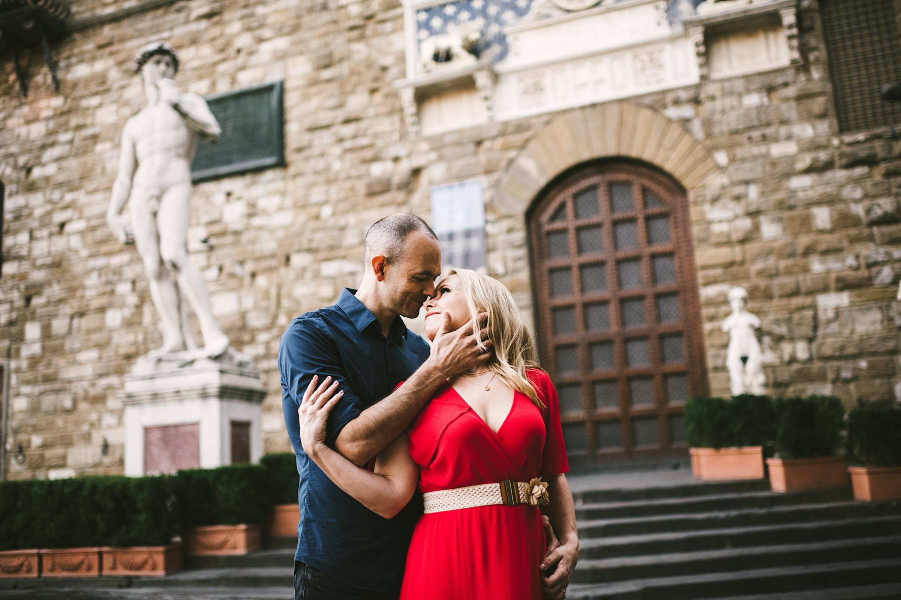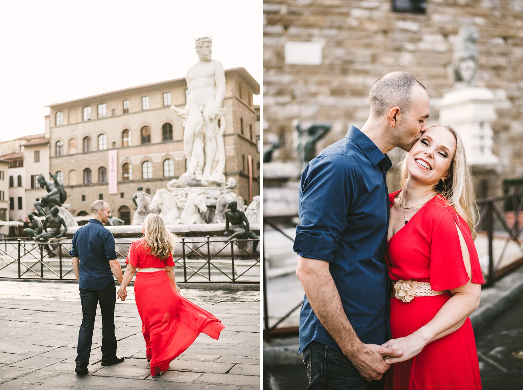 Anniversary photos in Florence: soft as sunrise, red as passion. Lovely couple portrait in the streets of Florence near Palazzo Vecchio and Piazza della Signoria. Anniversary photo by the Italian vacation holiday photographer in Tuscany based Florence Gabriele Fani