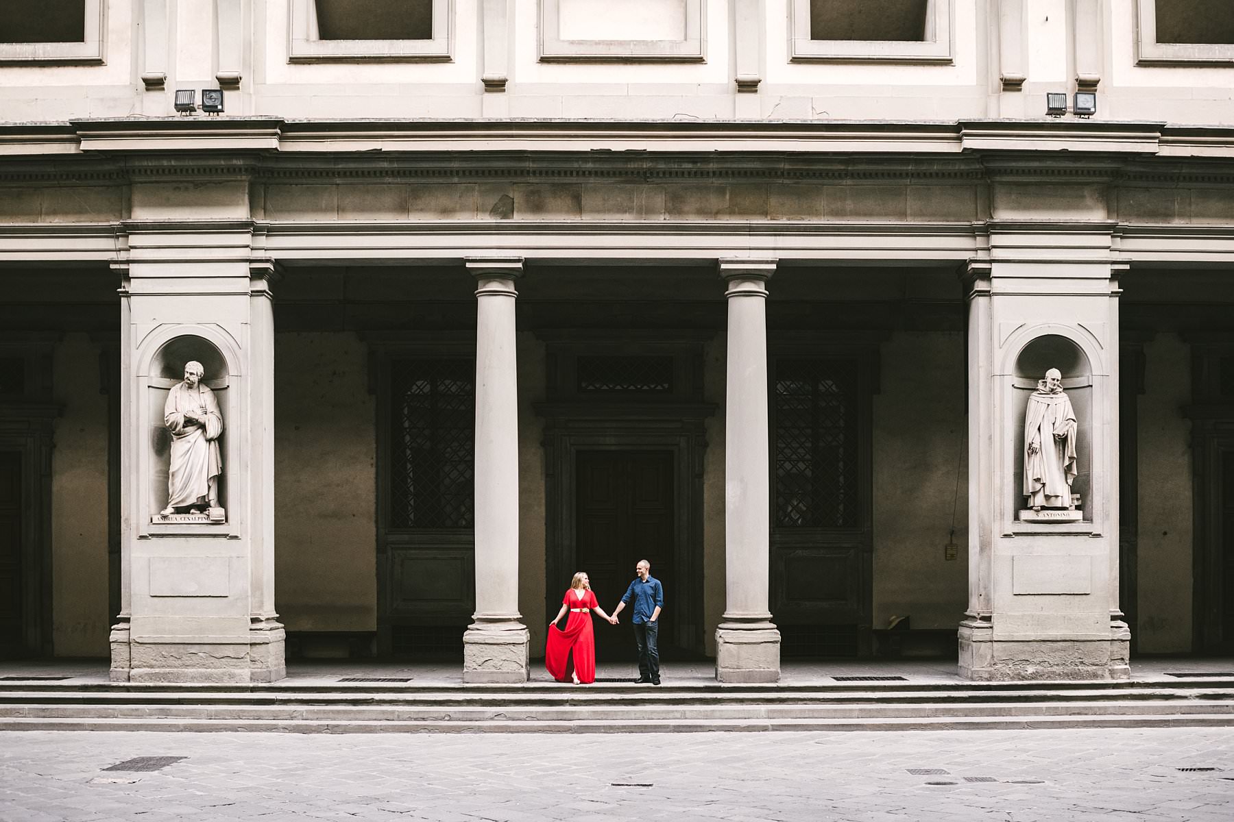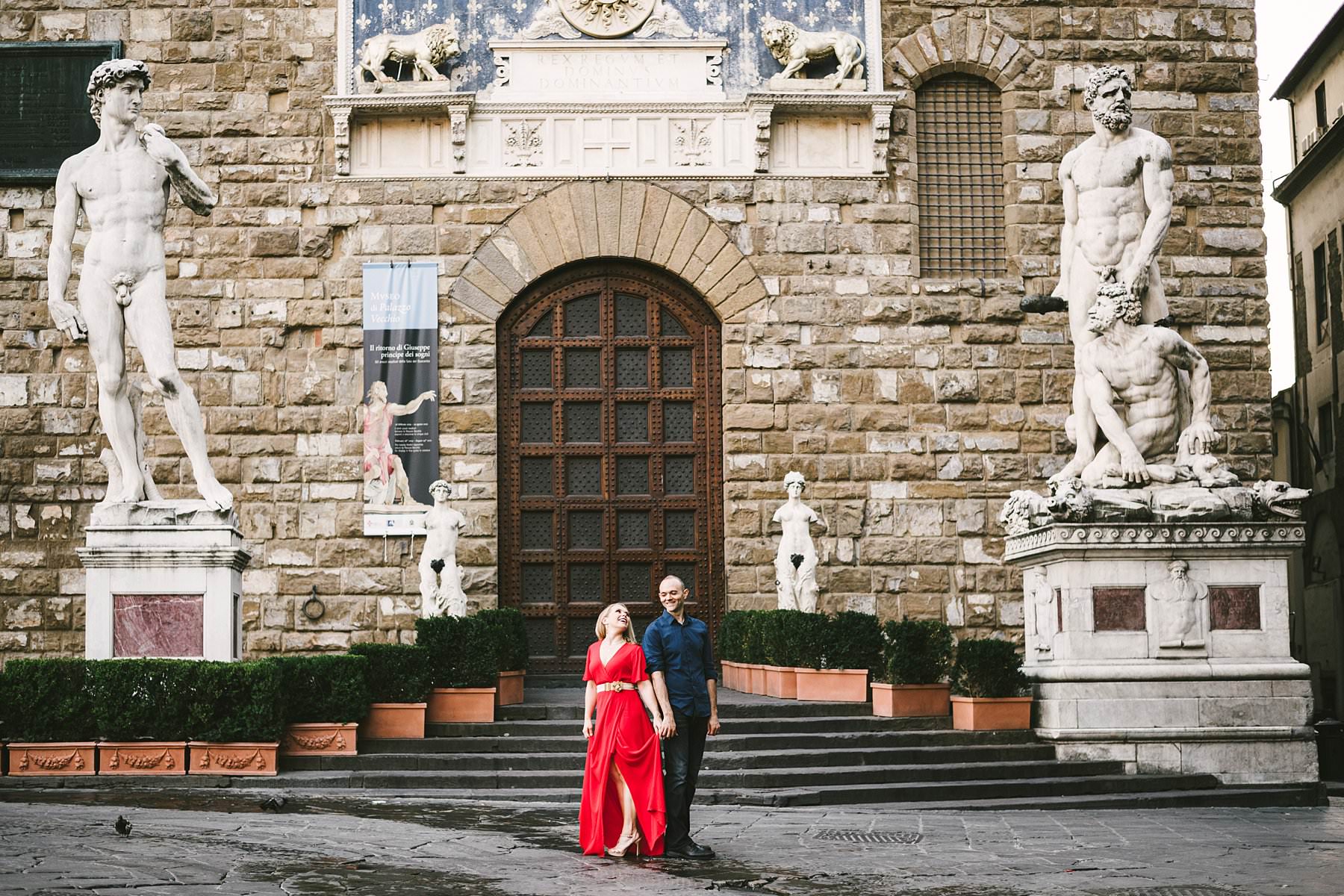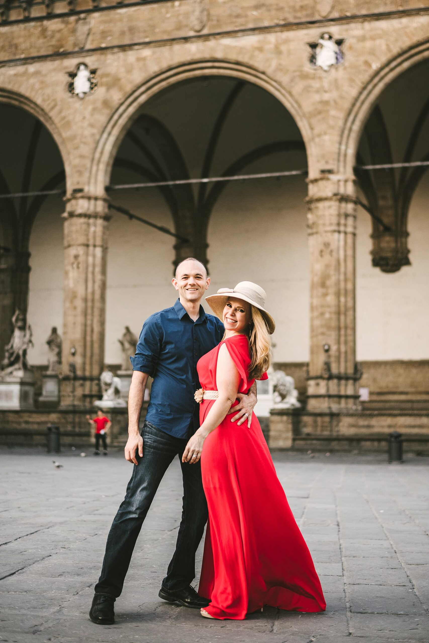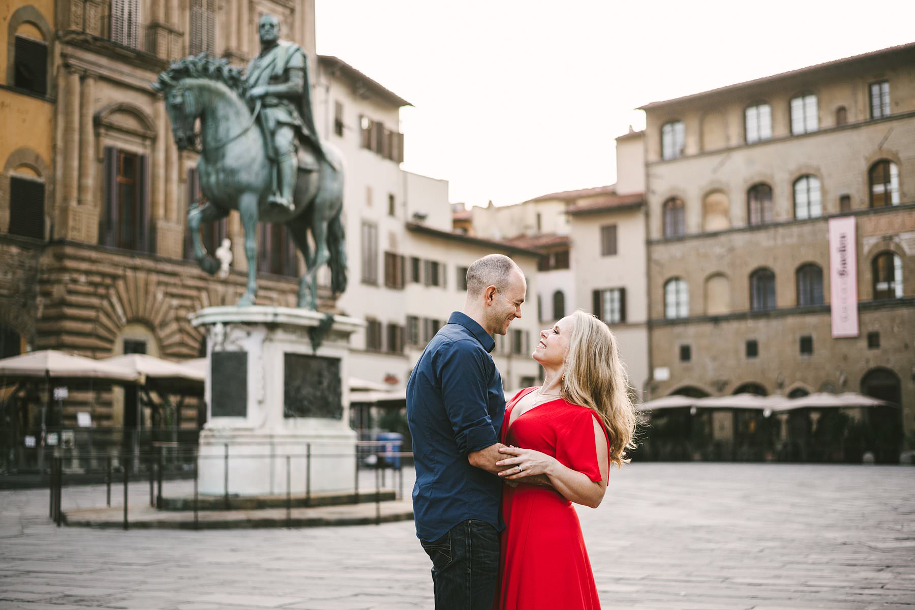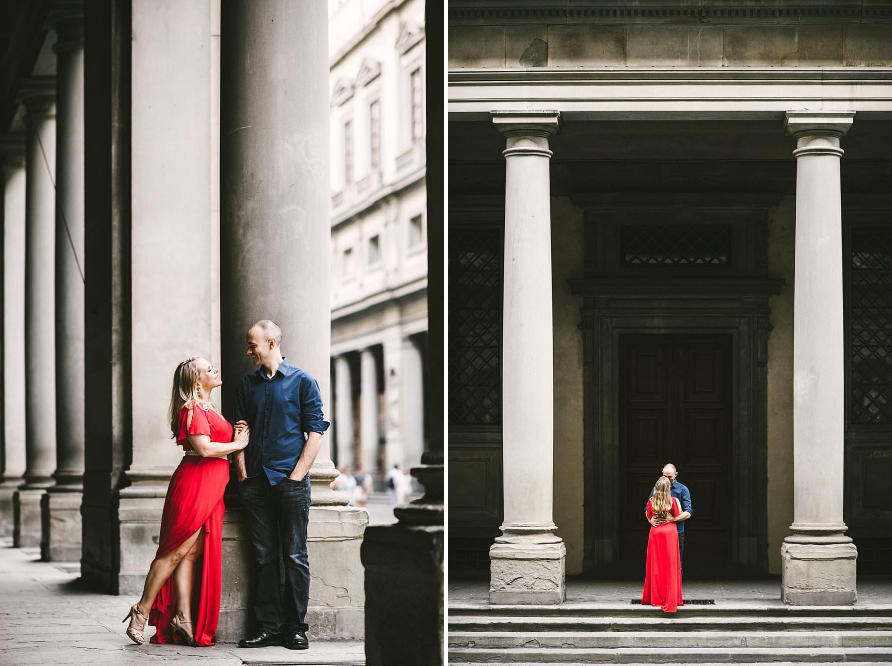 Anniversary photos in Florence: soft as sunrise, red as passion. Lovely couple portrait in the streets of Florence near Palazzo Vecchio and Piazza della Signoria. Anniversary photo by the Italian vacation holiday photographer in Tuscany based Florence Gabriele Fani