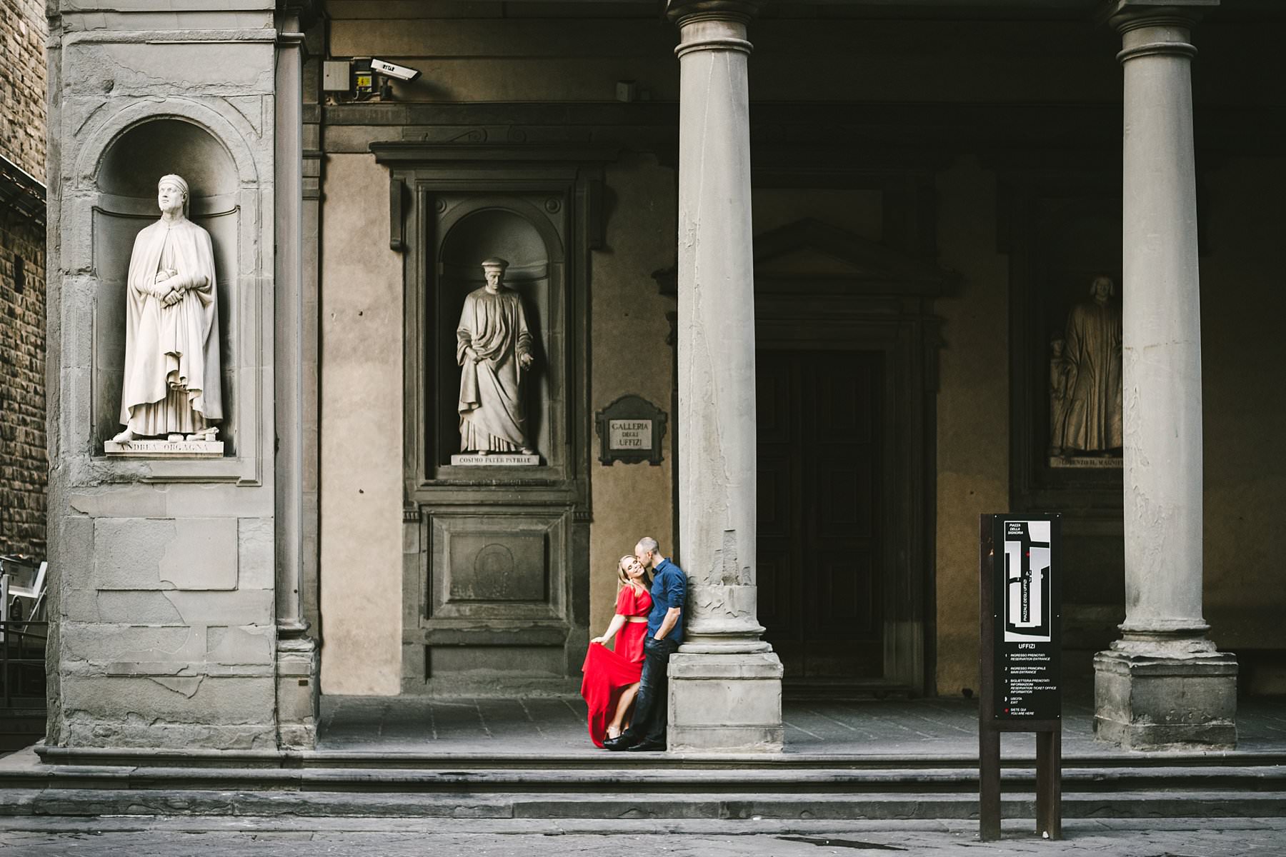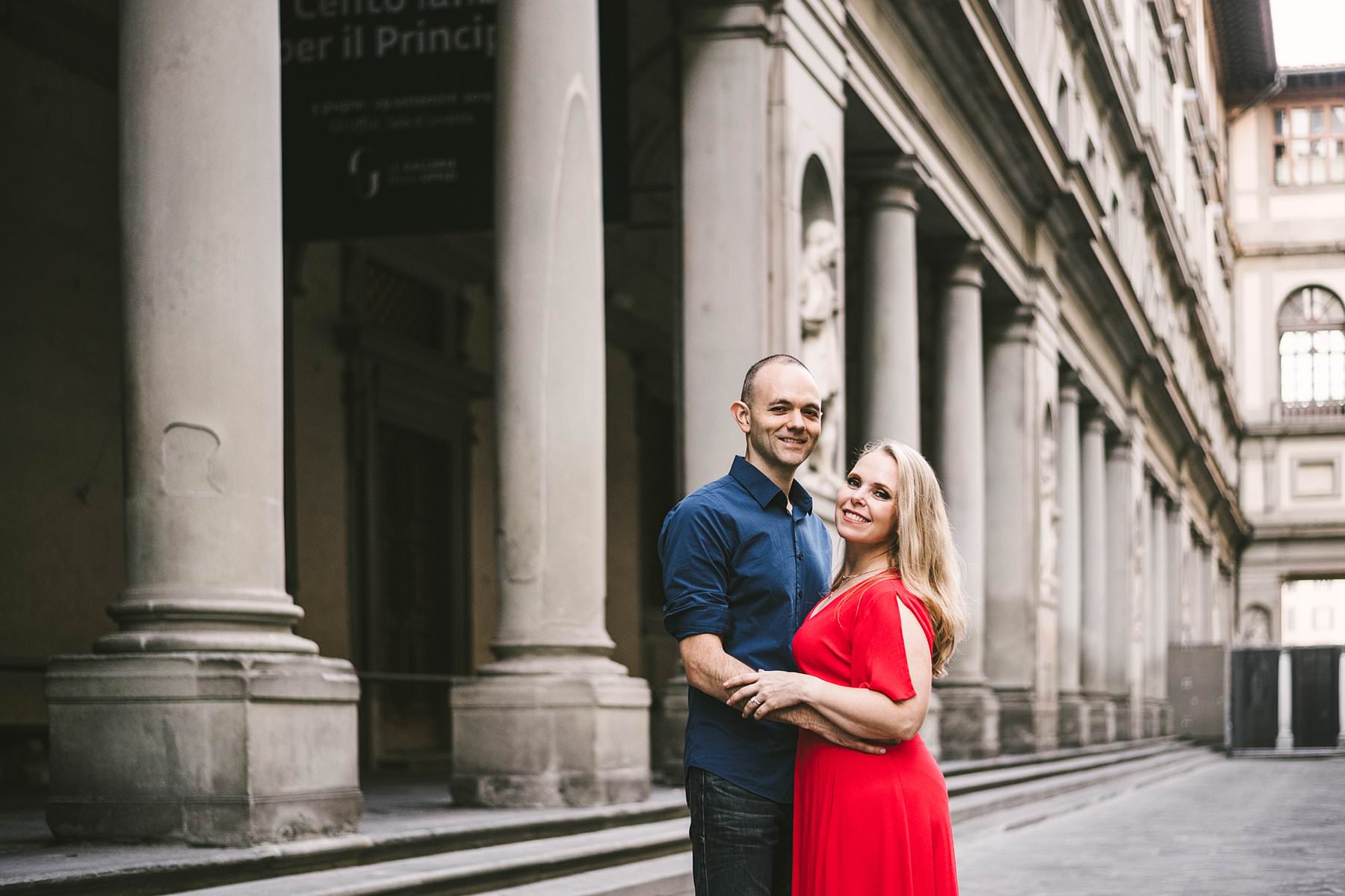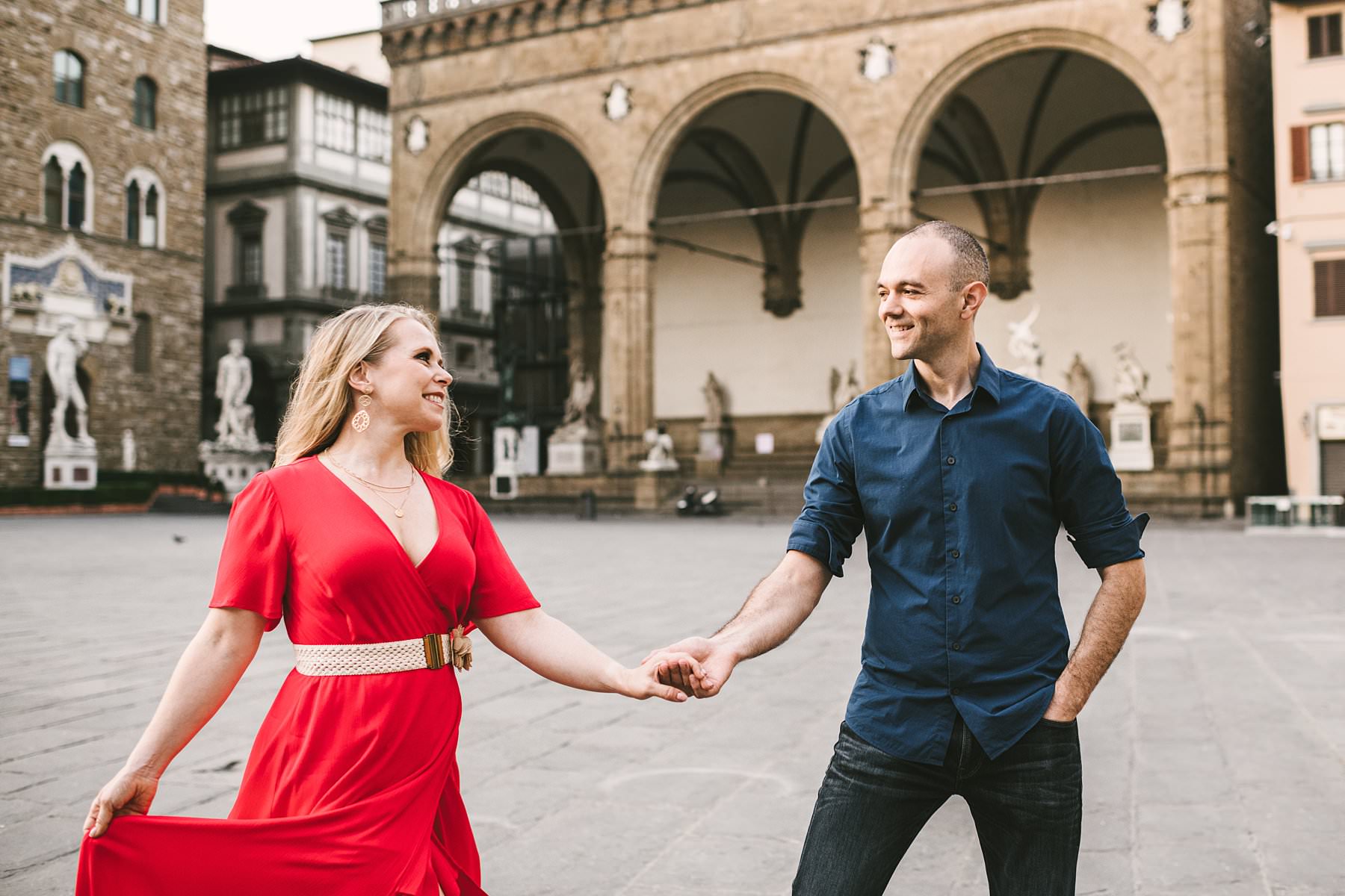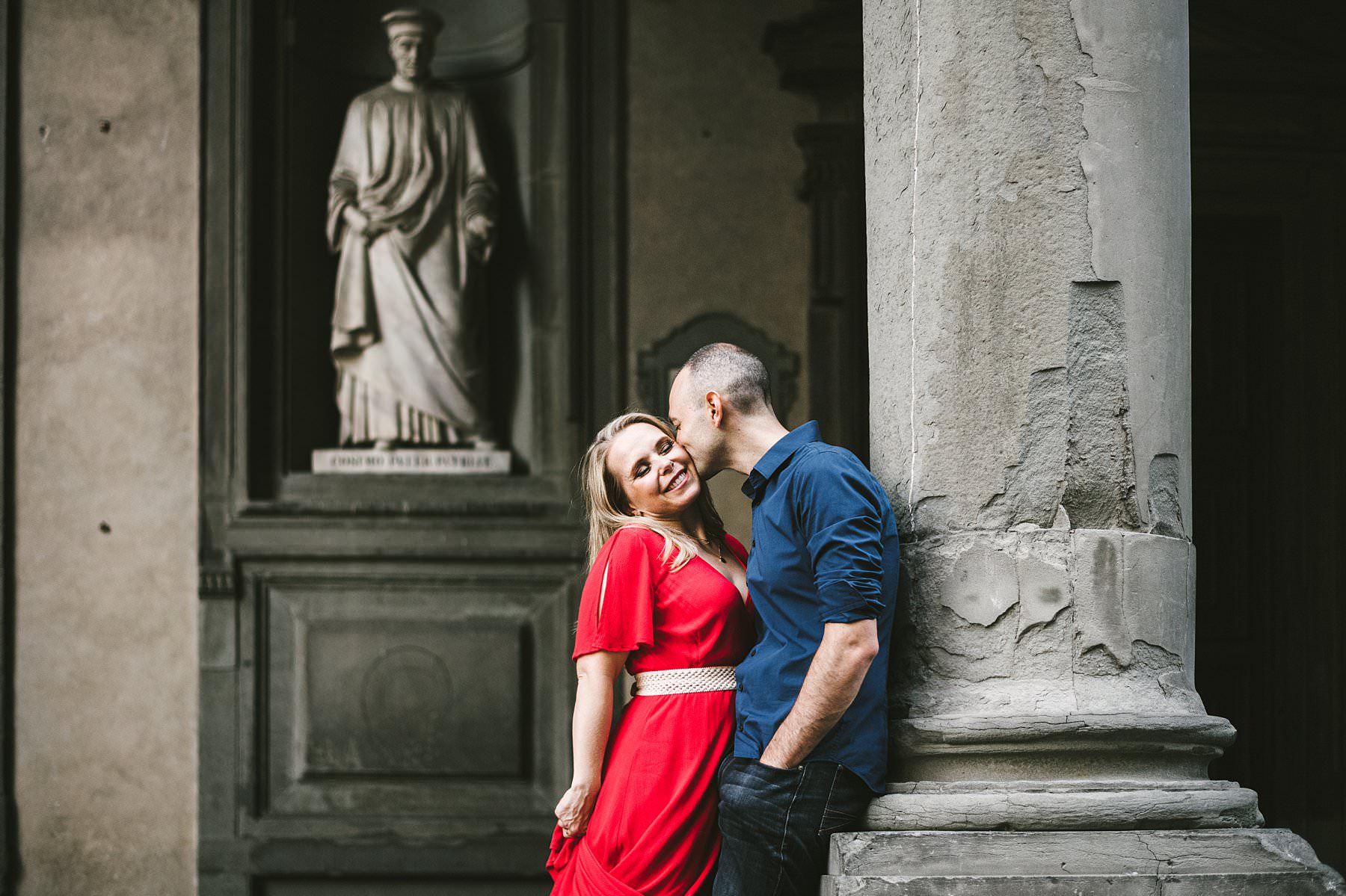Anniversary photos in Florence: soft as sunrise, red as passion. Lovely couple portrait in the streets of Florence near Palazzo Vecchio and Piazza della Signoria. Anniversary photo by the Italian vacation holiday photographer in Tuscany based Florence Gabriele Fani