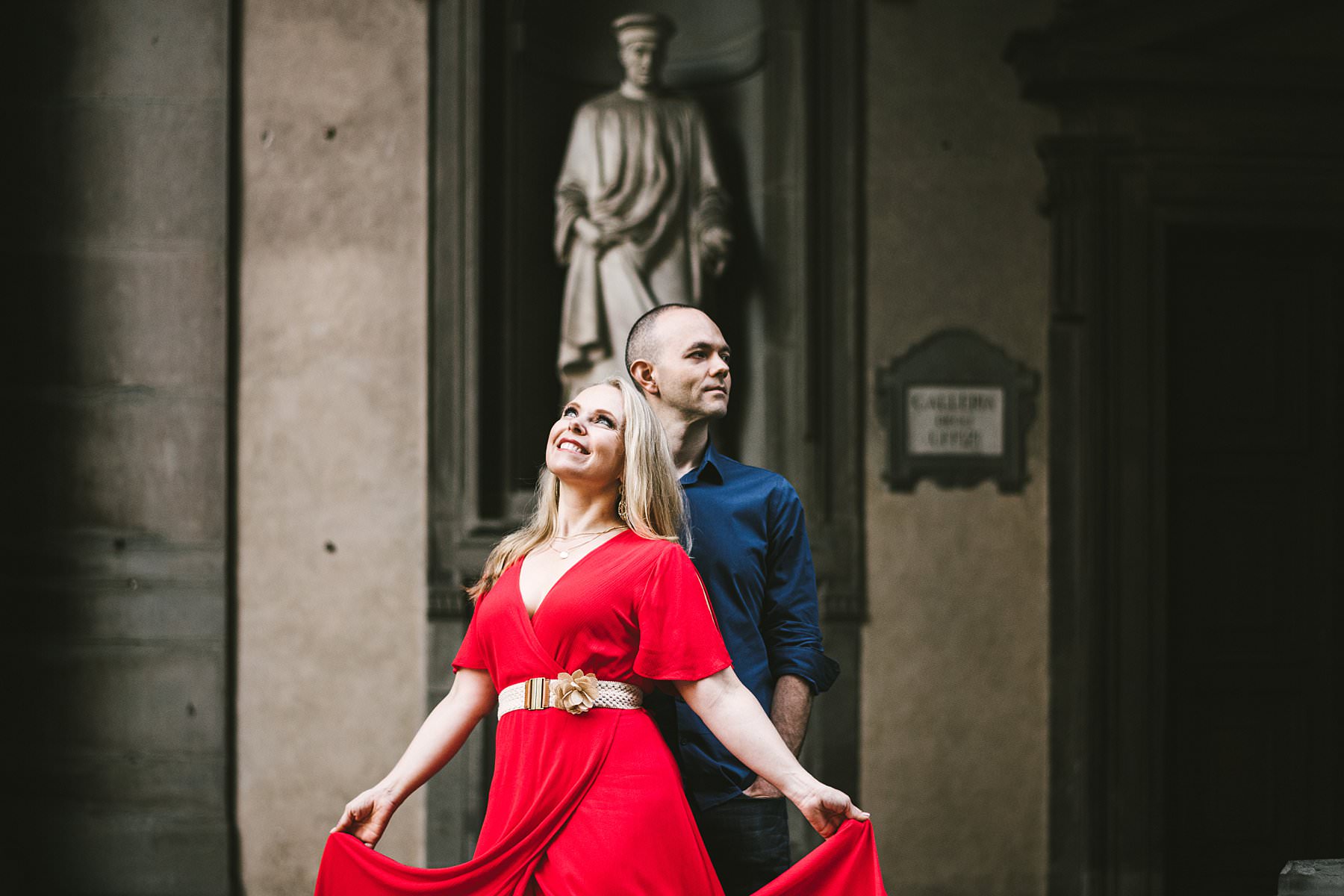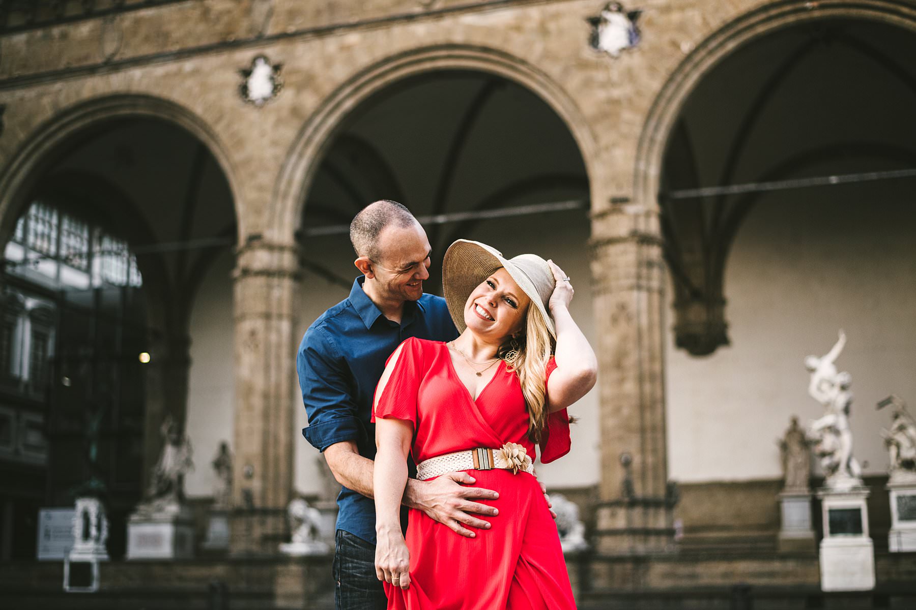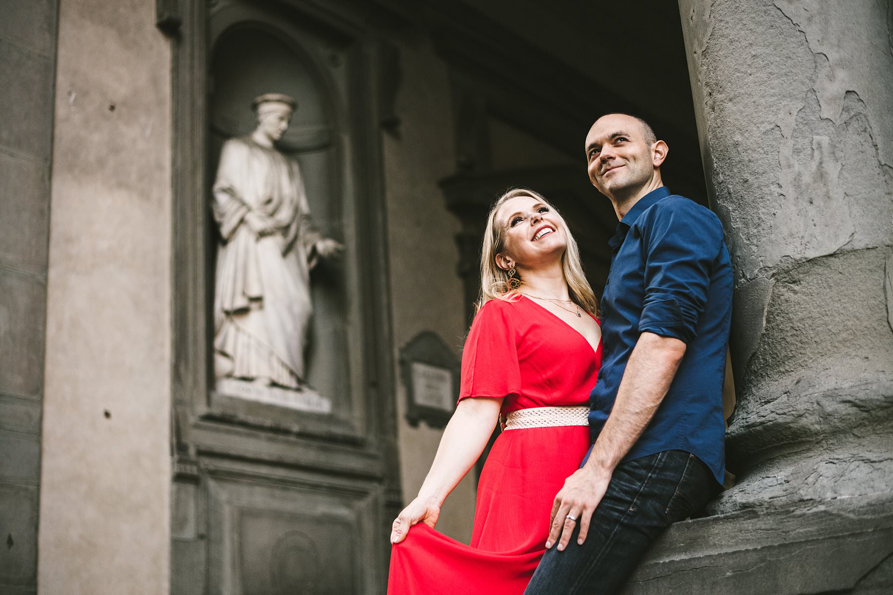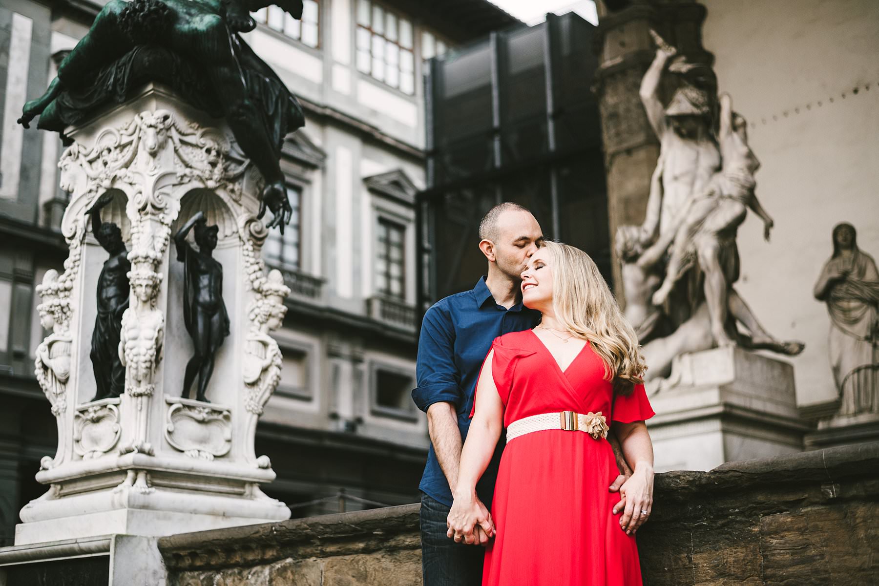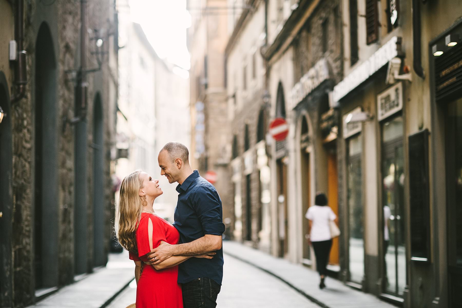 Anniversary photos in Florence: soft as sunrise, red as passion. Lovely couple portrait in the streets of Florence near Palazzo Vecchio and Piazza della Signoria. Anniversary photo by the Italian vacation holiday photographer in Tuscany based Florence Gabriele Fani