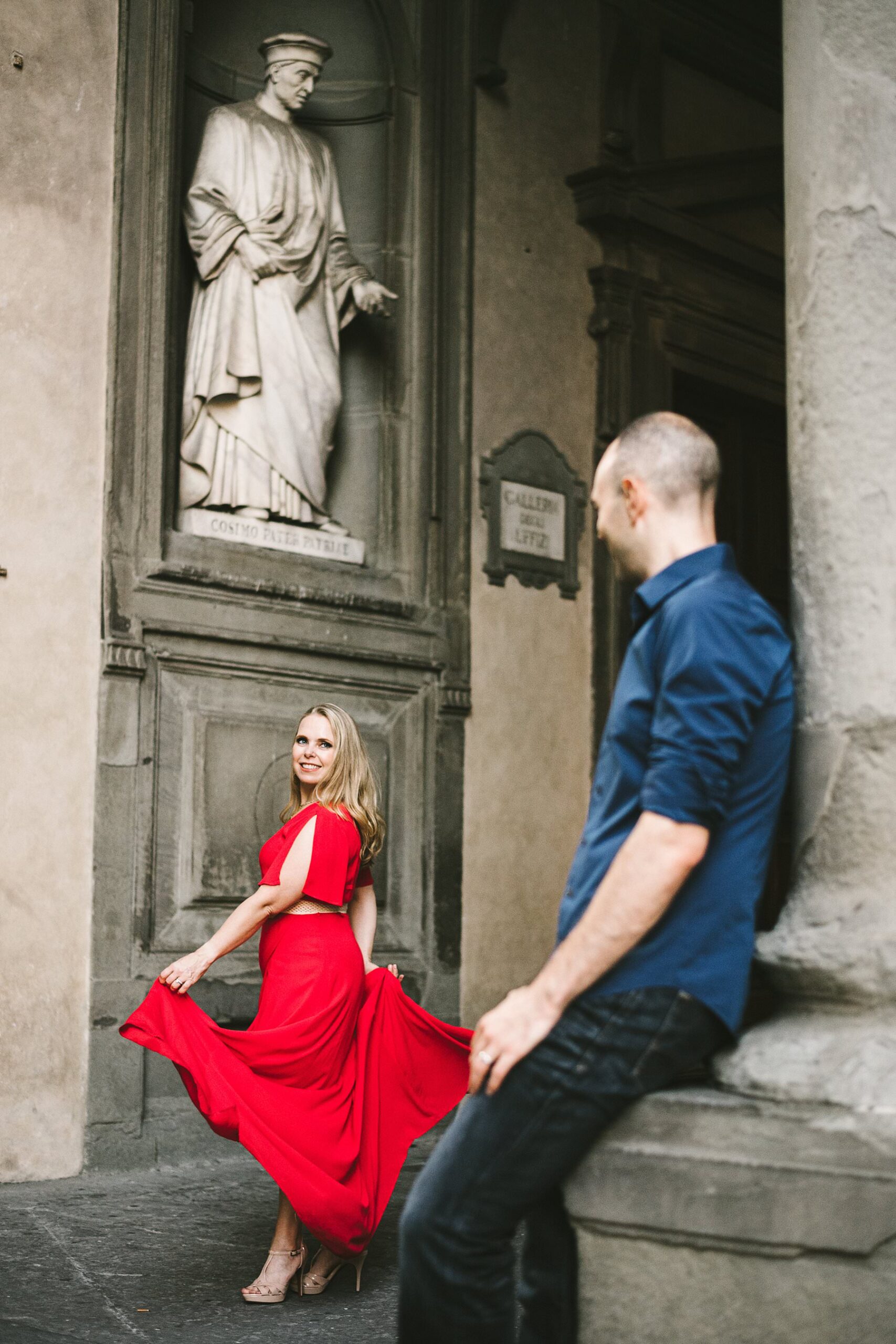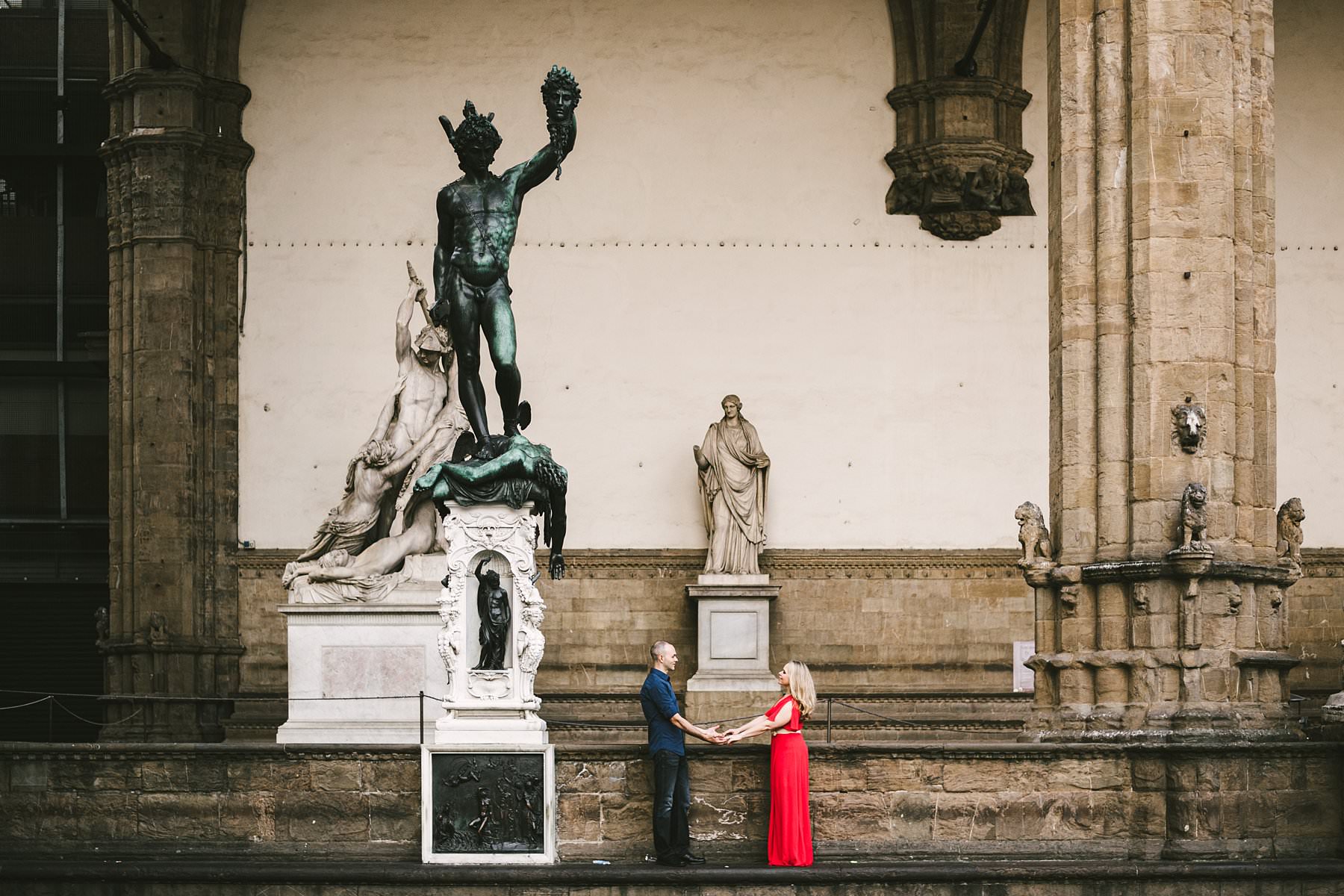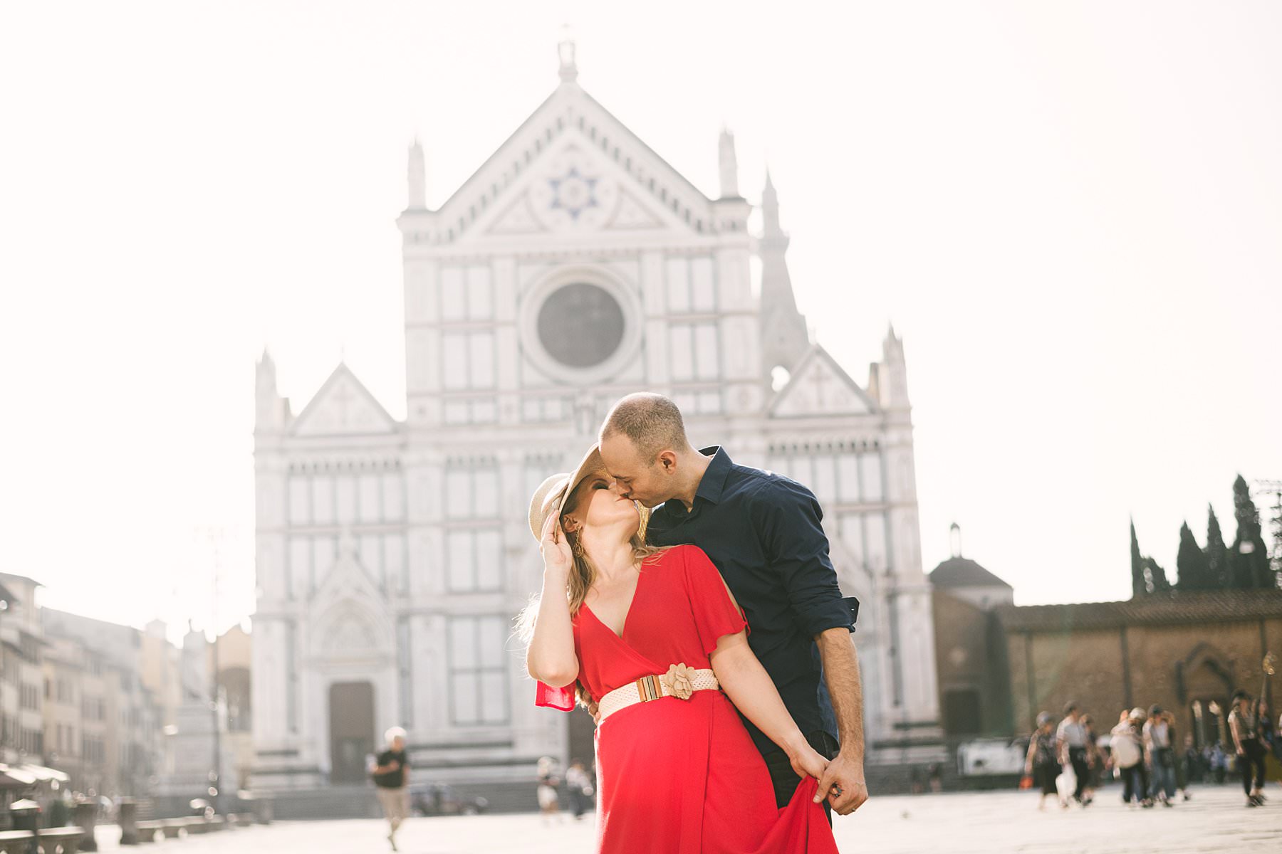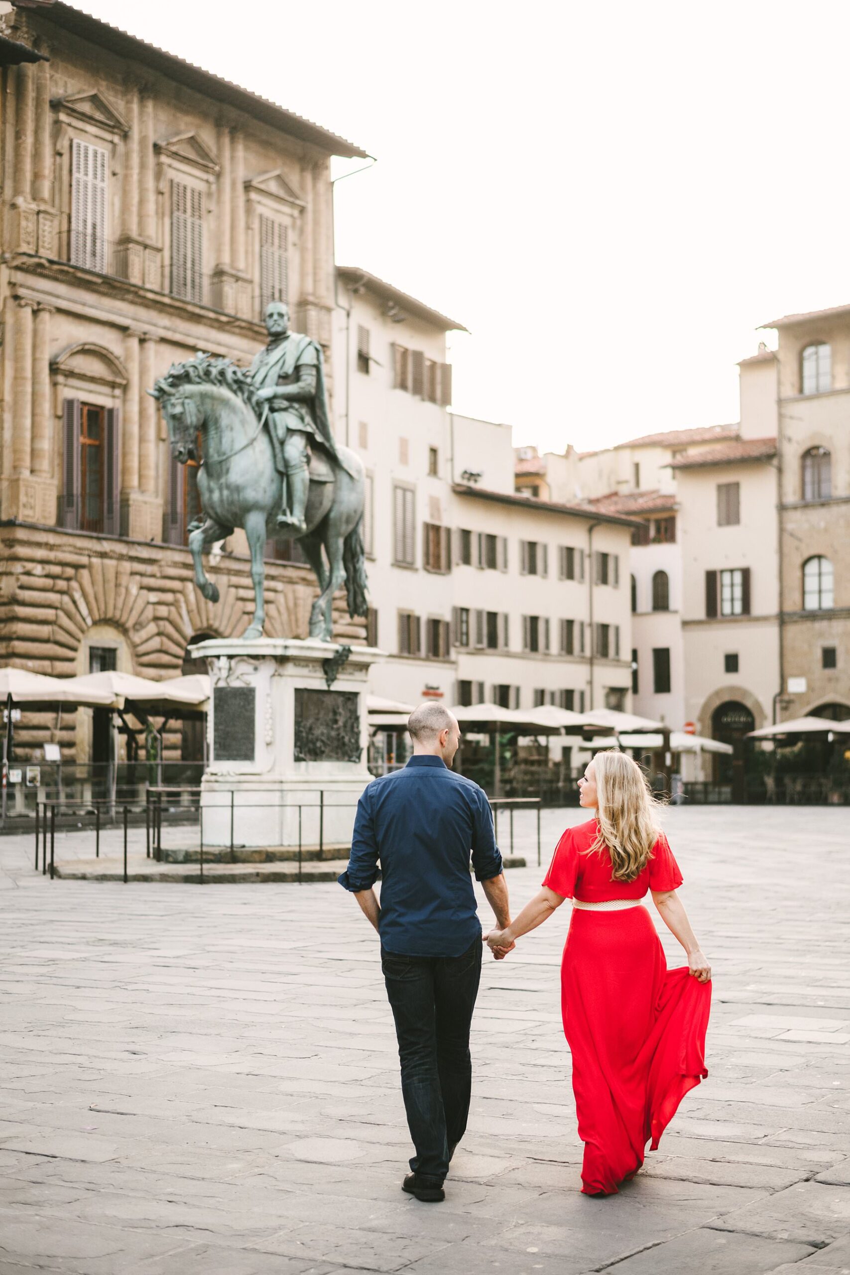 Anniversary photos in Florence: soft as sunrise, red as passion. Lovely couple portrait in the streets of Florence near Palazzo Vecchio and Piazza della Signoria. Anniversary photo by the Italian vacation holiday photographer in Tuscany based Florence Gabriele Fani
