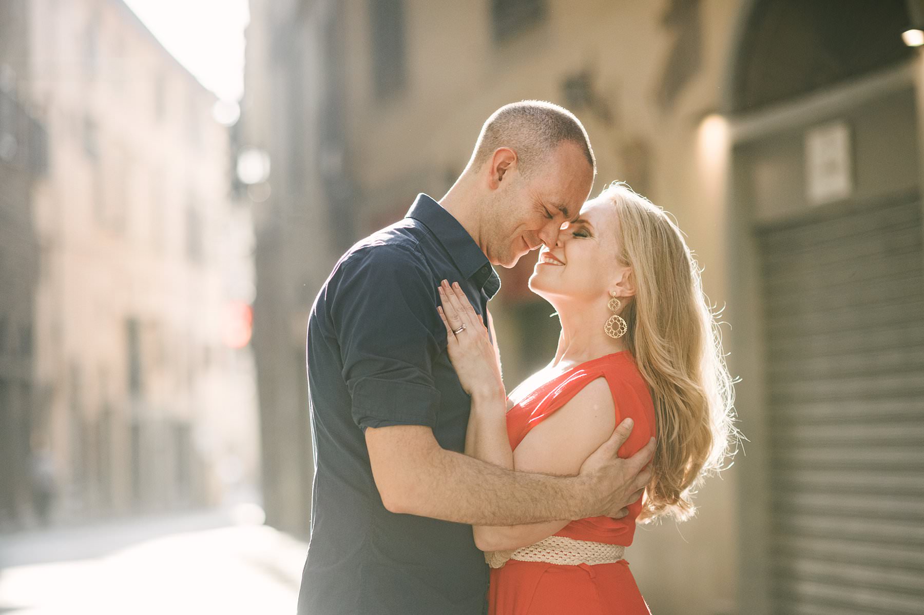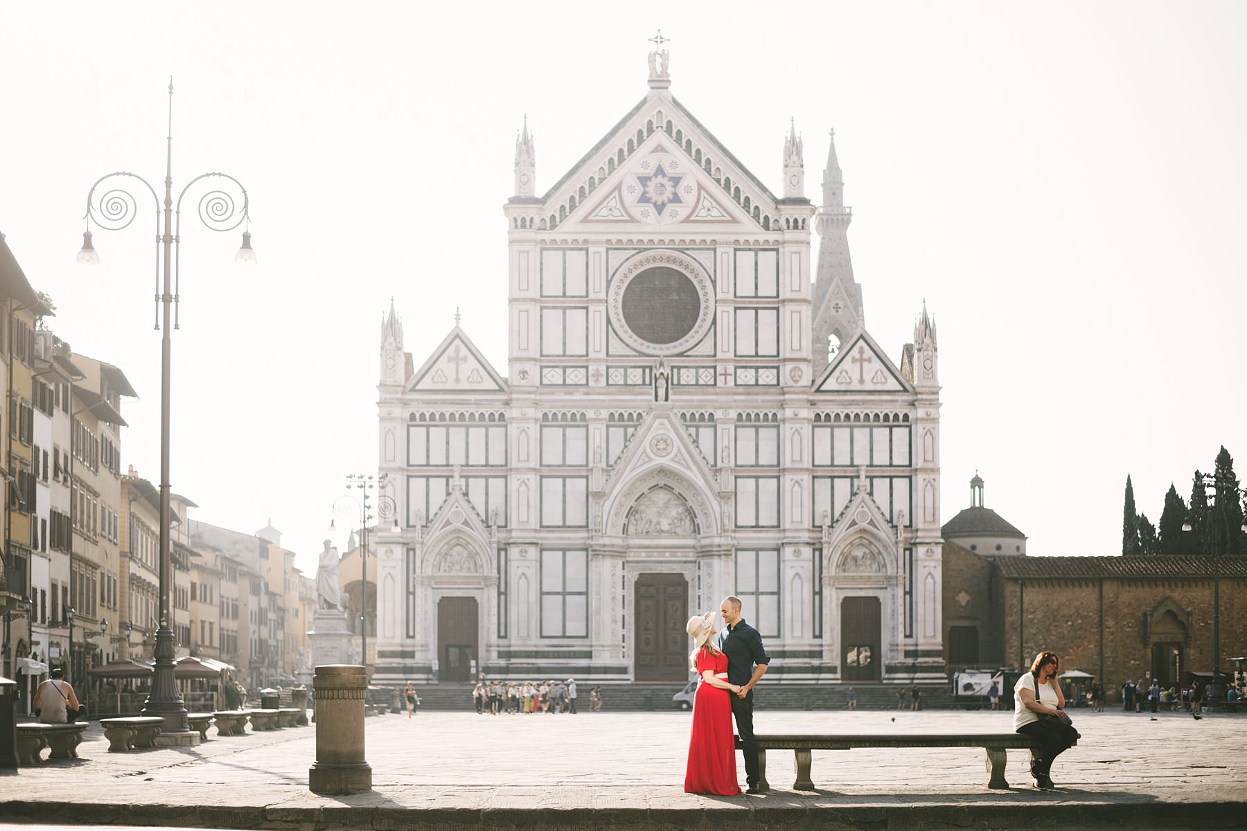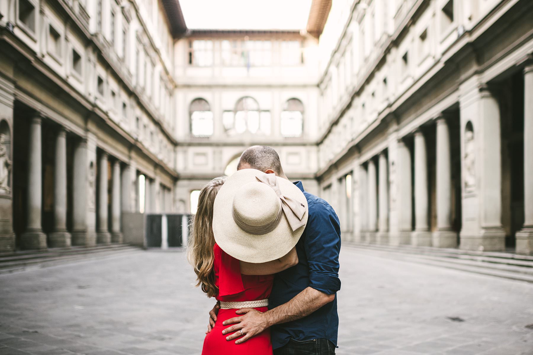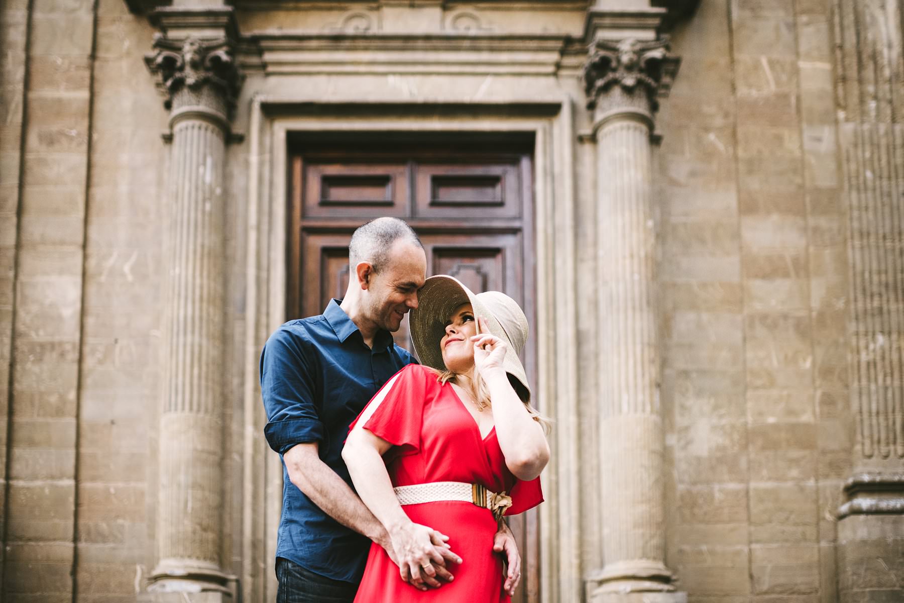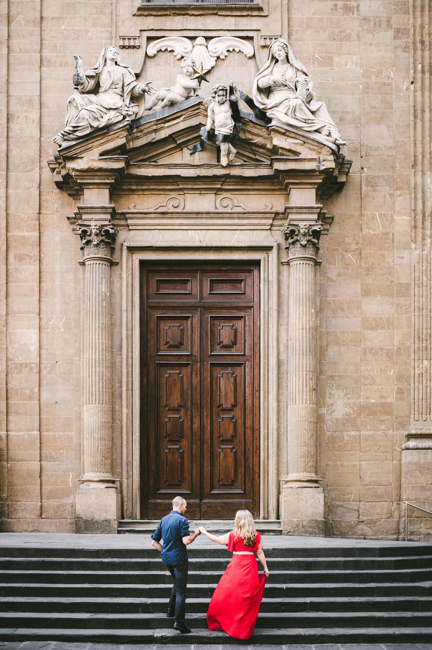 Anniversary photos in Florence: soft as sunrise, red as passion. Lovely couple portrait in the streets of Florence near Palazzo Vecchio and Piazza della Signoria. Anniversary photo by the Italian vacation holiday photographer in Tuscany based Florence Gabriele Fani