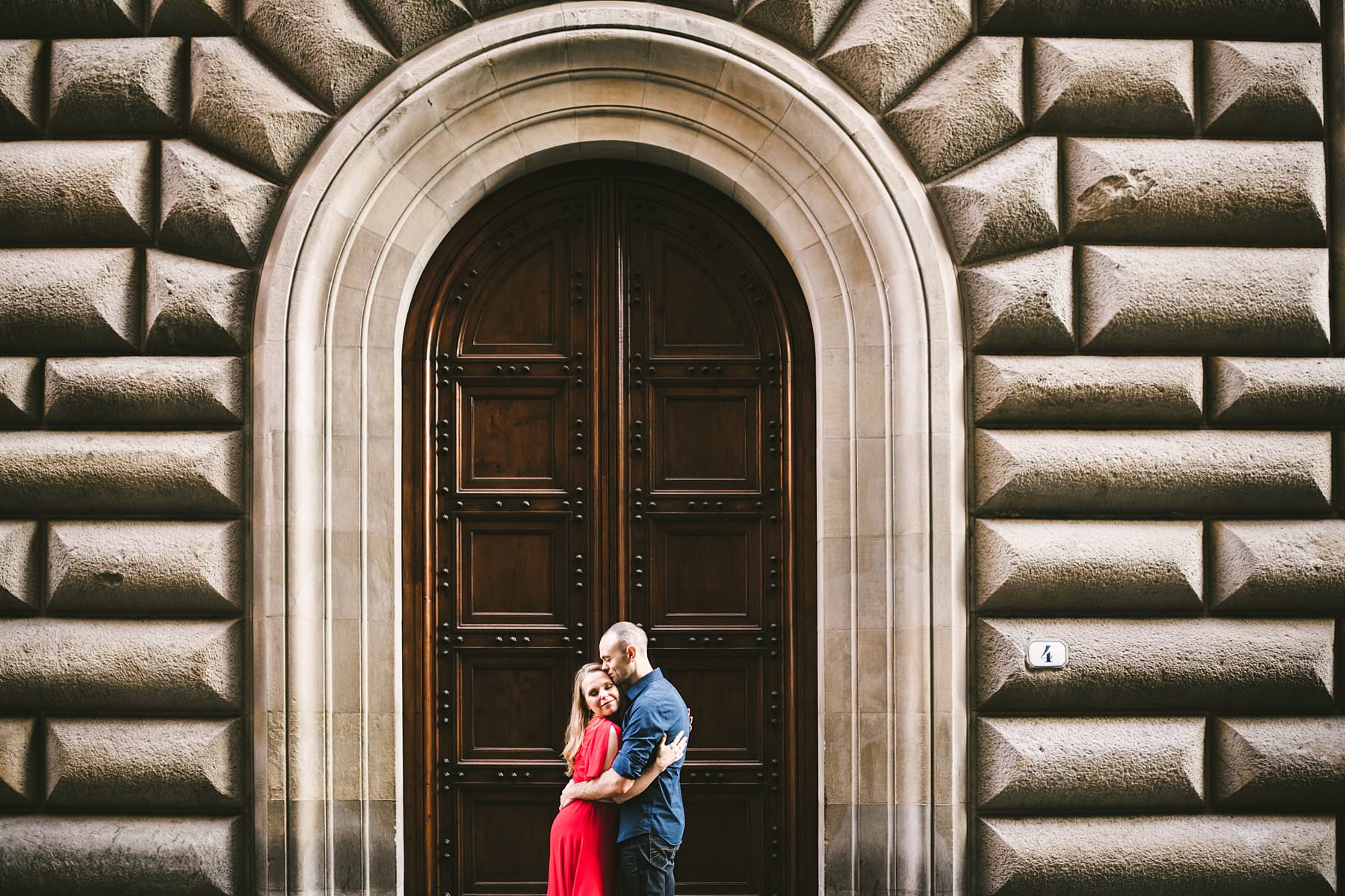 Anniversary photos in Florence: soft as sunrise, red as passion. Creative and modern couple portrait in Florence at Sunrise near Palazzo Vecchio and Palazzo Gondi in the very heart of the city. Anniversary photo by the Italian vacation holiday photographer in Tuscany based Florence Gabriele Fani