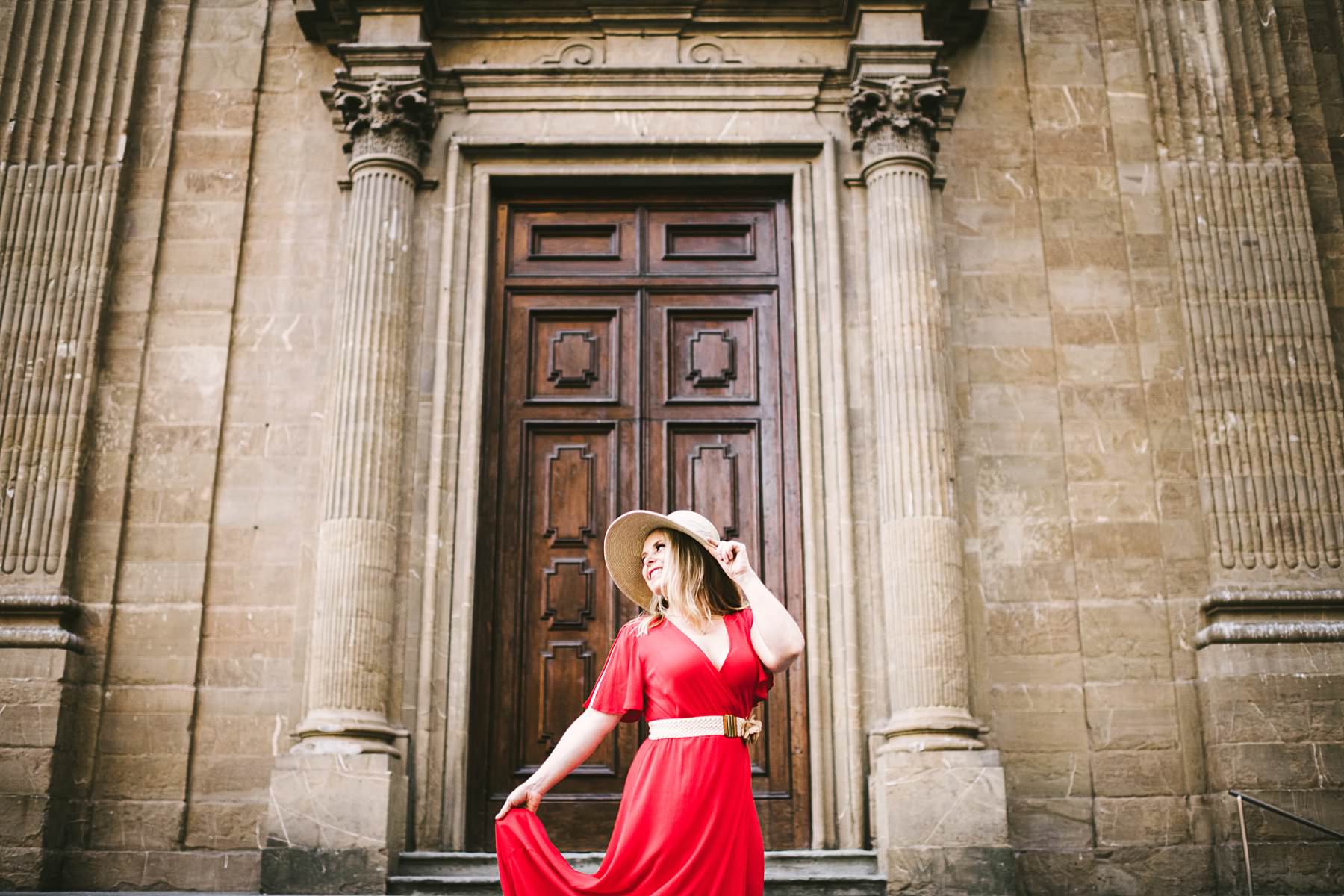 Anniversary photos in Florence, soft as sunrise, red as passion. A beautiful frame, a delicate light, a bright red dress, a milestone to celebrate: these were the ingredients of Anisa and Kevin’s anniversary photos, taken in Florence at sunrise. We strolled the streets of the city, during a session that lasted almost three hours and touched all of the most iconic spots: from Piazza della Signoria to the Uffizi Gallery, from Palazzo Gondi to Piazza S. Firenze, from Ponte Vecchio to Piazzale Michelangelo. The latter is a truly enchanted place from which you can enjoy a breathtaking view of the city: the most wonderful photo setting anyone could ask for. Anniversary photo by the Italian vacation holiday photographer in Tuscany based Florence Gabriele Fani