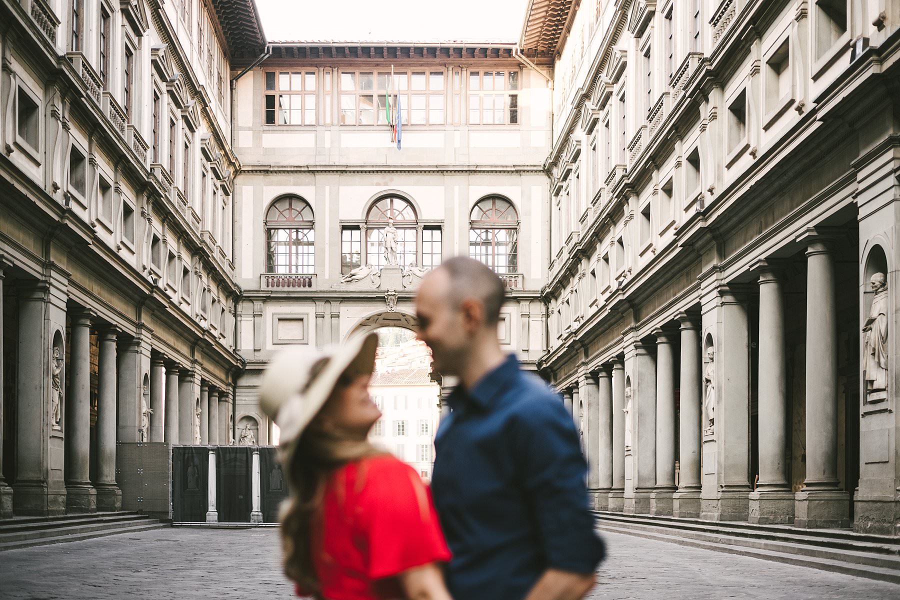 Anisa and Kevin’s delightful anniversary photo at Uffizi Art Gallery in Florence. Anisa and Kevin are in love with one another but also with the architecture of the city, so their wish was for it to be part of the photographs. Since it is such a popular touristic destination, though, there was only one way to do that properly: a sunrise photoshoot. Anniversary photo by the Italian vacation holiday photographer in Tuscany based Florence Gabriele Fani