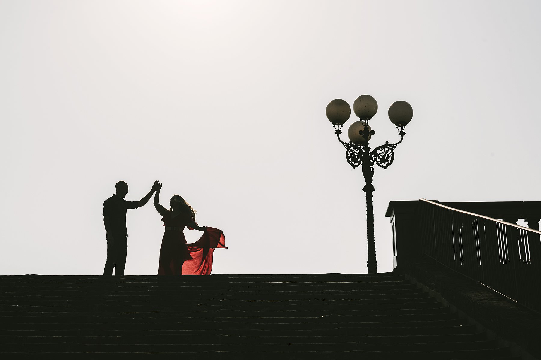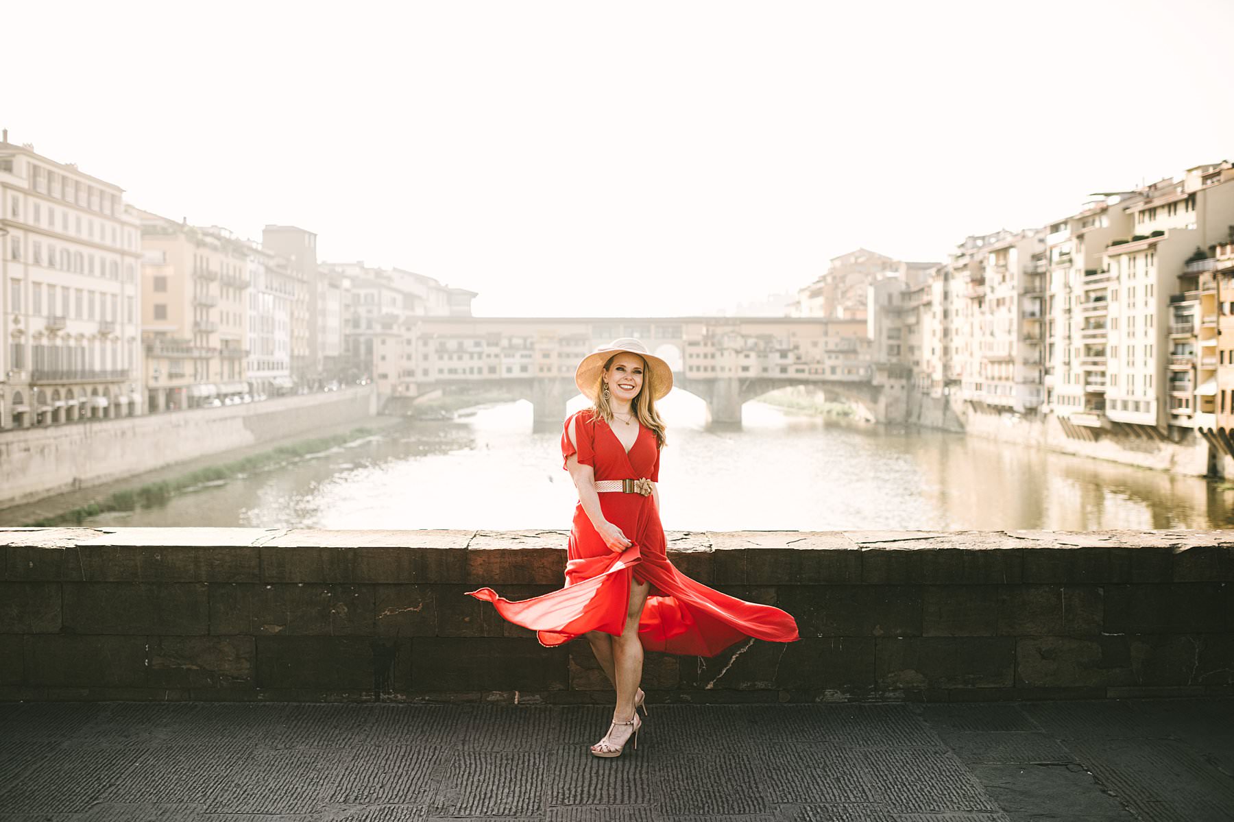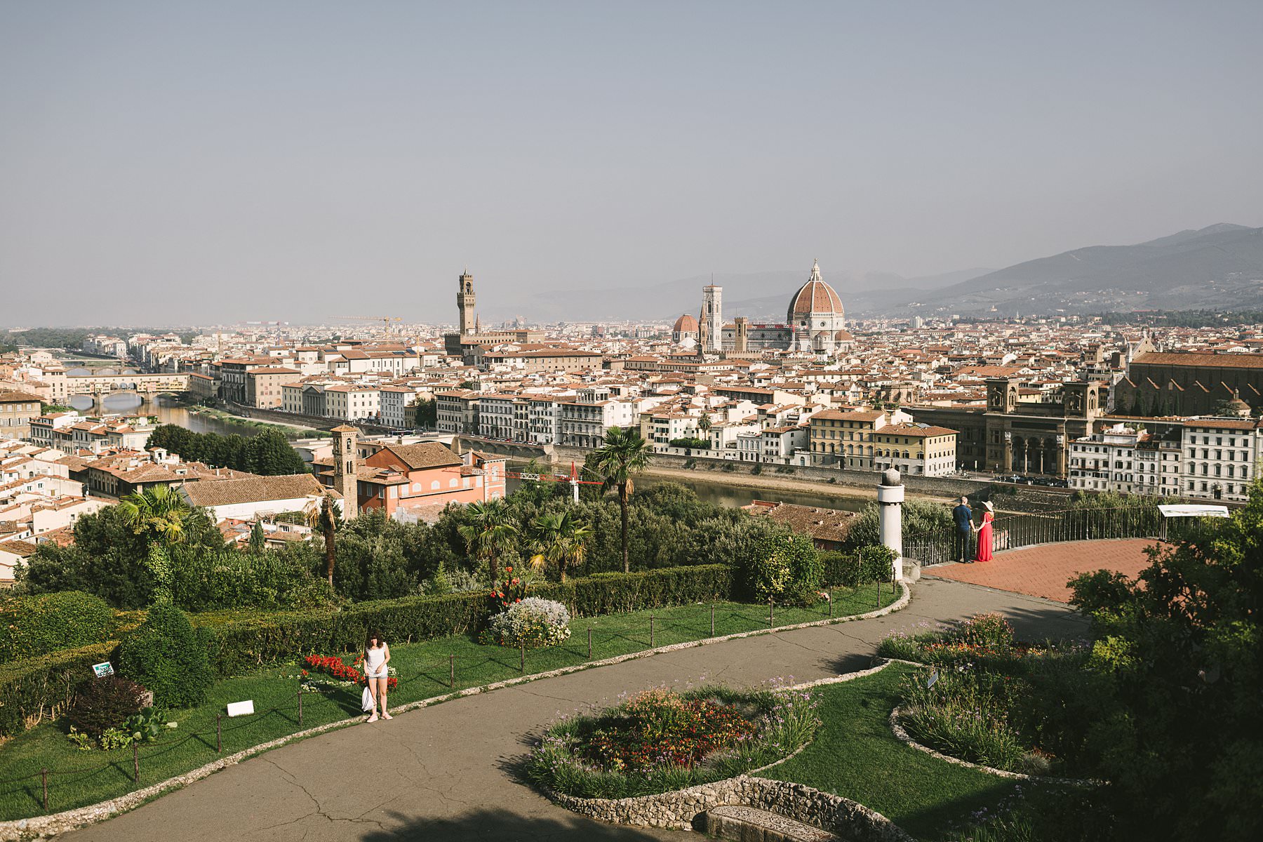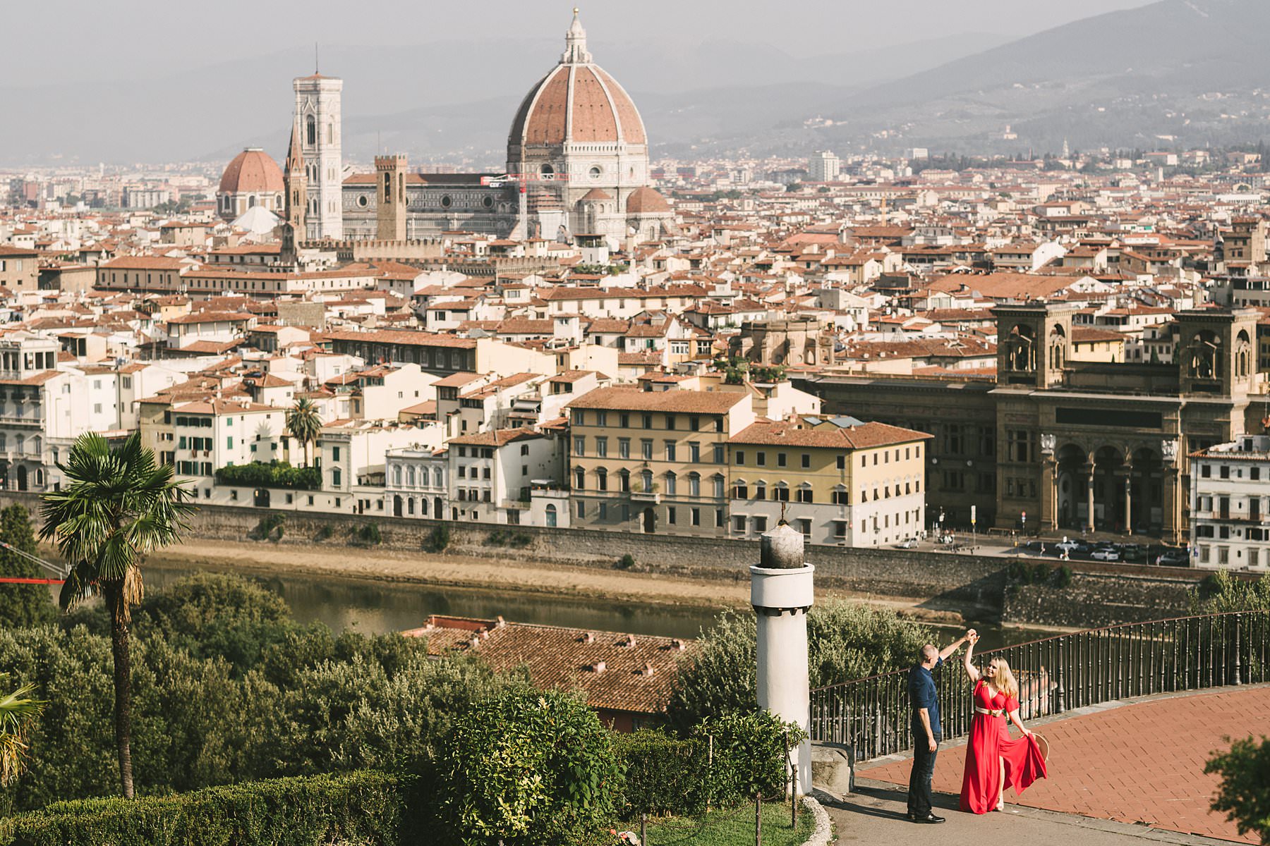Anniversary photos in Florence: soft as sunrise, red as passion. A beautiful frame, a delicate light, a bright red dress, a milestone to celebrate: these were the ingredients of Anisa and Kevin’s anniversary photos, taken in Florence at sunrise. Just like in a dream, they had the whole city to themselves and they could enjoy every little moment of the experience. Anniversary photo by the Italian vacation holiday photographer in Tuscany based Florence Gabriele Fani