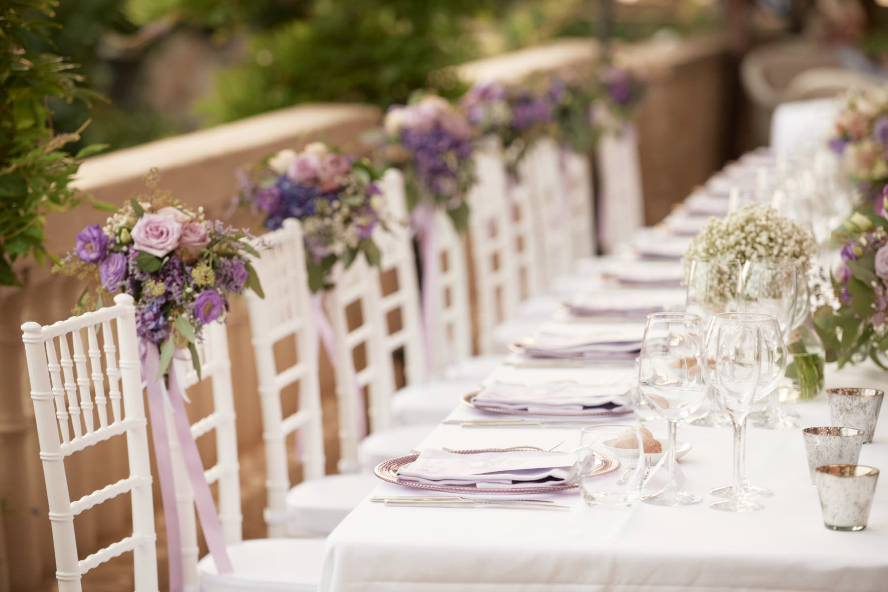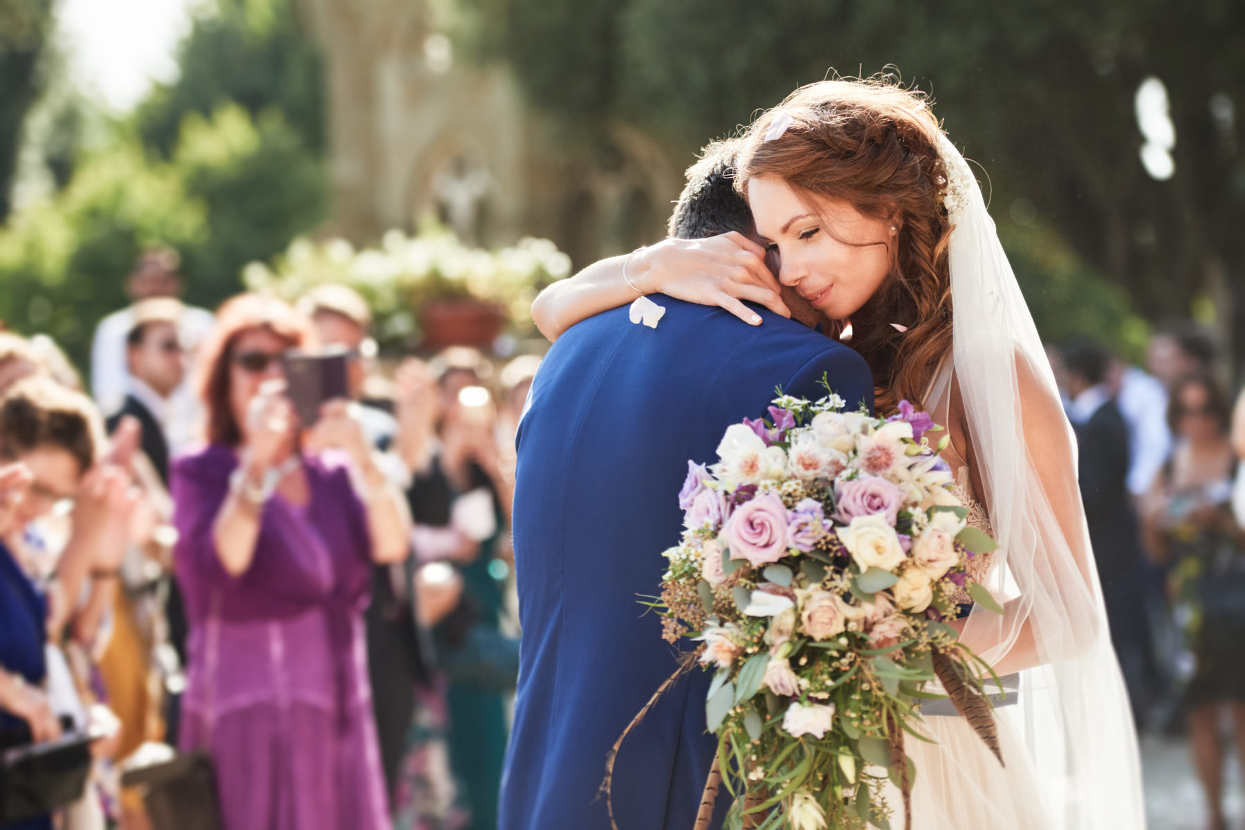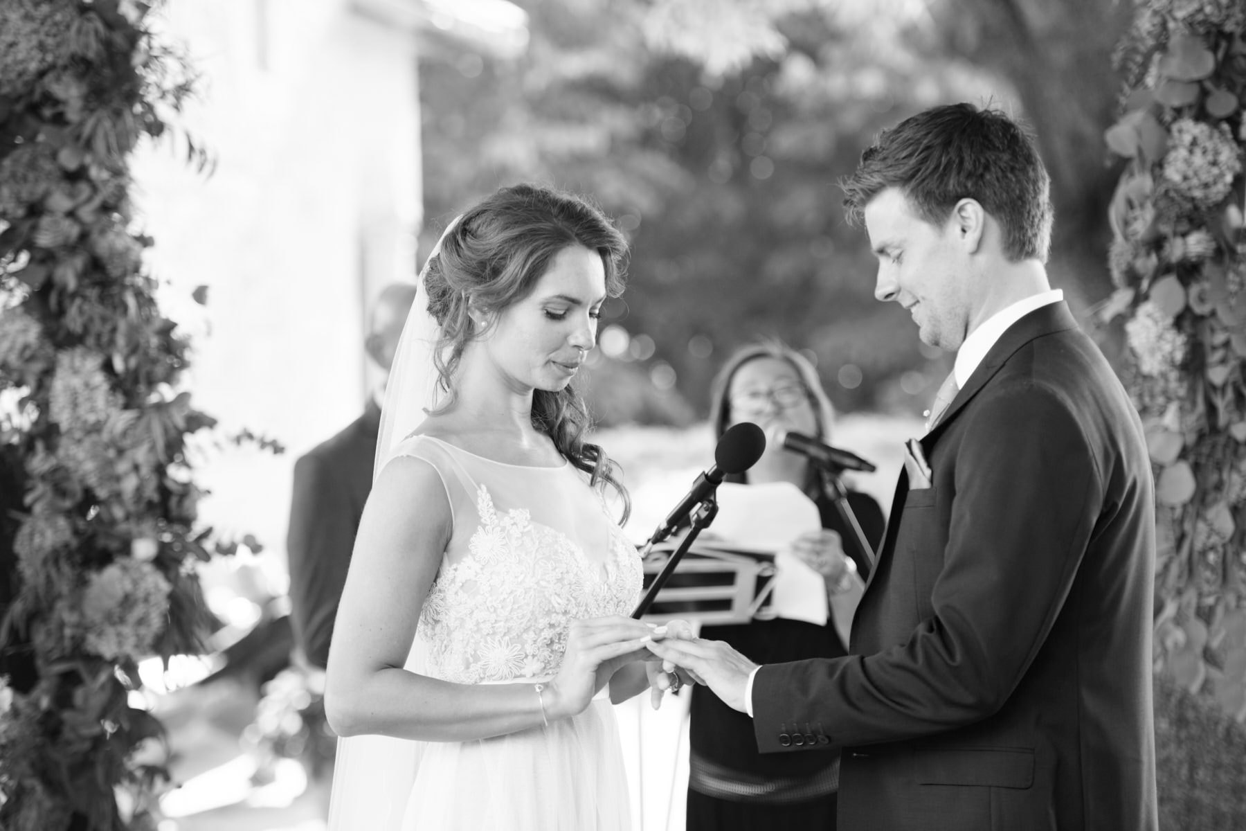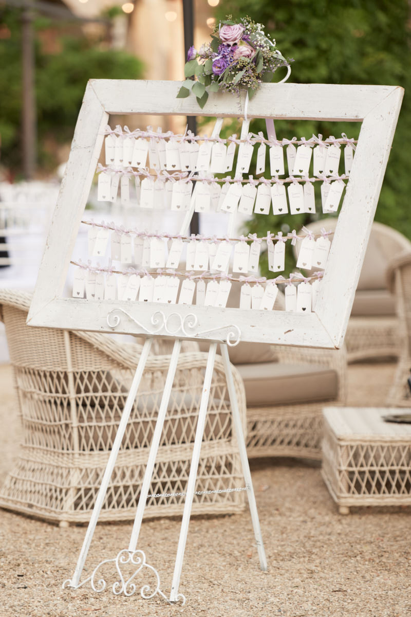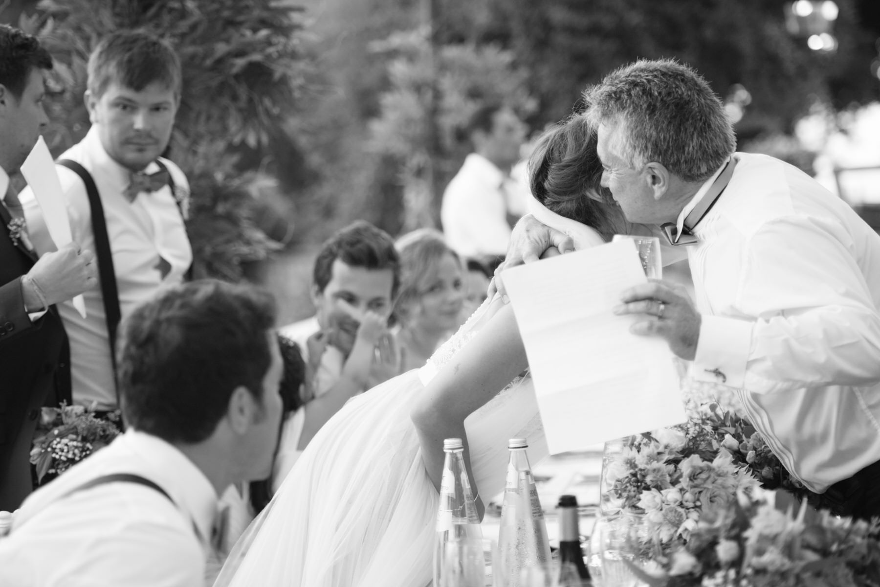 La cerimonia simbolica è stata allestita all’aperto nei pressi della cappellina ma comunque al riparo dal sole grazie agli alberi secolari presenti in location. Seppur breve, come sempre, la celebrazione è stata molto partecipata da tutti i presenti con gli sposi che hanno regalato altri momenti toccanti come l’abbraccio dopo lo scambio delle promesse e degli anelli.