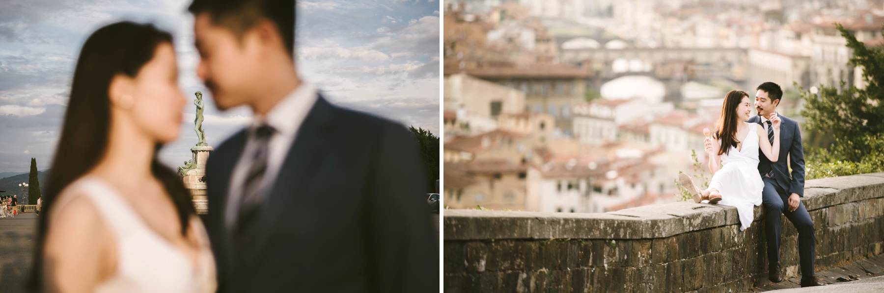 Se hai sempre amato i panorami e le viste uniche, questo è il servizio fotografico perfetto per te prima del matrimonio. Piazzale Michelangelo, nel quartiere Oltrarno della città, è senza dubbio il luogo più romantico di Firenze, soprattutto quando il cielo si tinge di rosso al tramonto, una delle cose più magiche che vedrete mai. Gli amanti potranno giurarsi amore eterno l’un l’altro con la città ai loro piedi. Questo momento sarà stampato per sempre su foto indimenticabili con l’intera veduta della bellissima Firenze, dal Forte Belvedere a Santa Croce, attraversando il fiume Arno fino a Ponte Vecchio, da Palazzo Vecchio al Bargello, e alla maestosa Cupola del Brunelleschi, l’iconico monumento, il simbolo di Firenze nel mondo. Progettata dal noto architetto Giuseppe Poggi, la piazza fu costruita nel 1869, quando la città era capitale d’Italia ed era dedicata allo scultore rinascimentale Michelangelo.