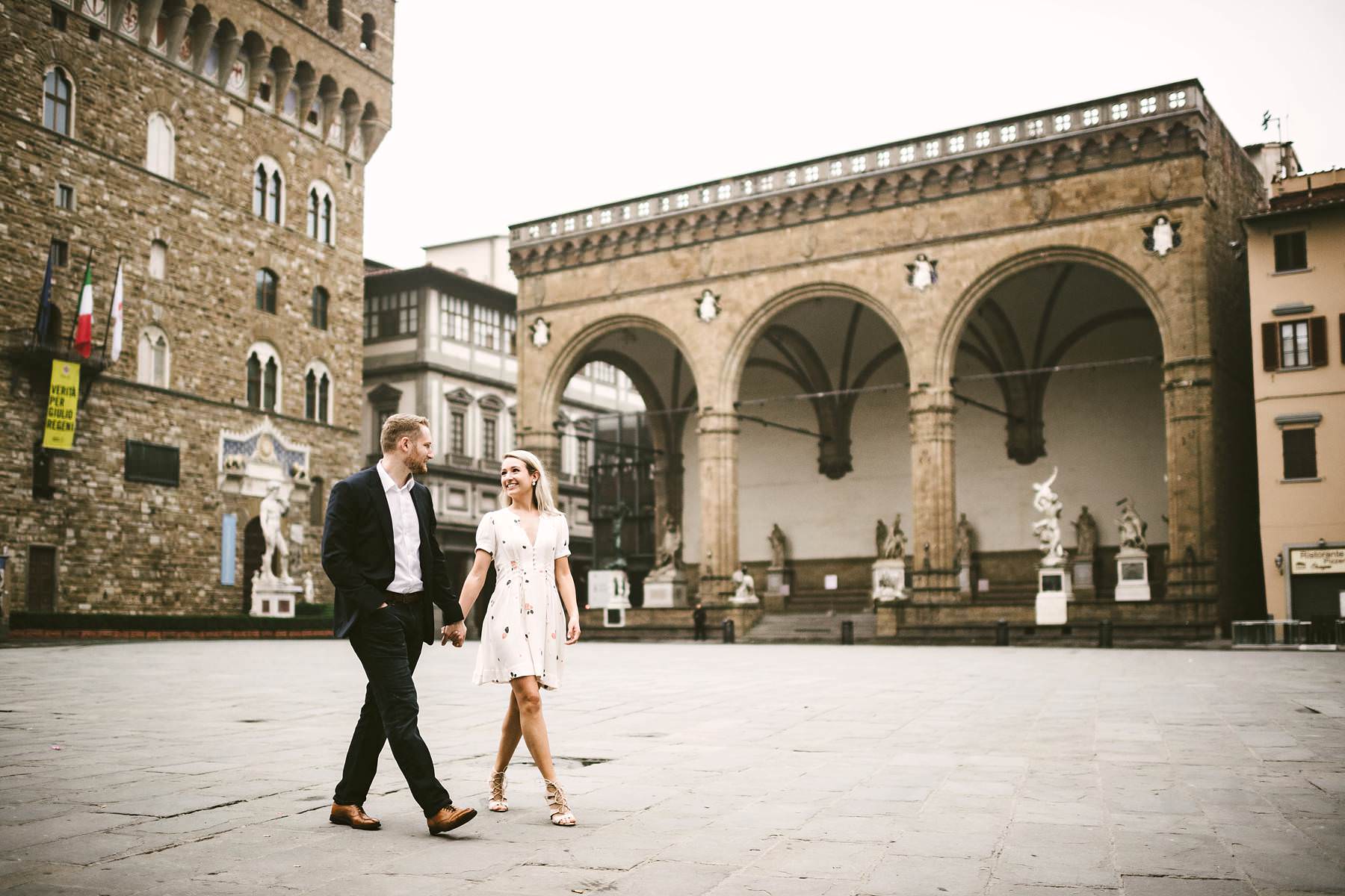 Il tour inizia in Piazza della Signoria, un tempo centro della vita politica fiorentina, il cui edificio principale, Palazzo Vecchio, è ancora oggi uno dei palazzi più importanti della città. Questa piazza è uno dei migliori sfondi per i tuoi servizi di fidanzamento e pre matrimonio, con l’iconica copia del David di Michelangelo famoso in tutto il mondo – l’originale è conservato nella Galleria dell’Accademia – e la suggestiva Loggia dei Lanzi, una vera galleria d’arte a cielo aperto.