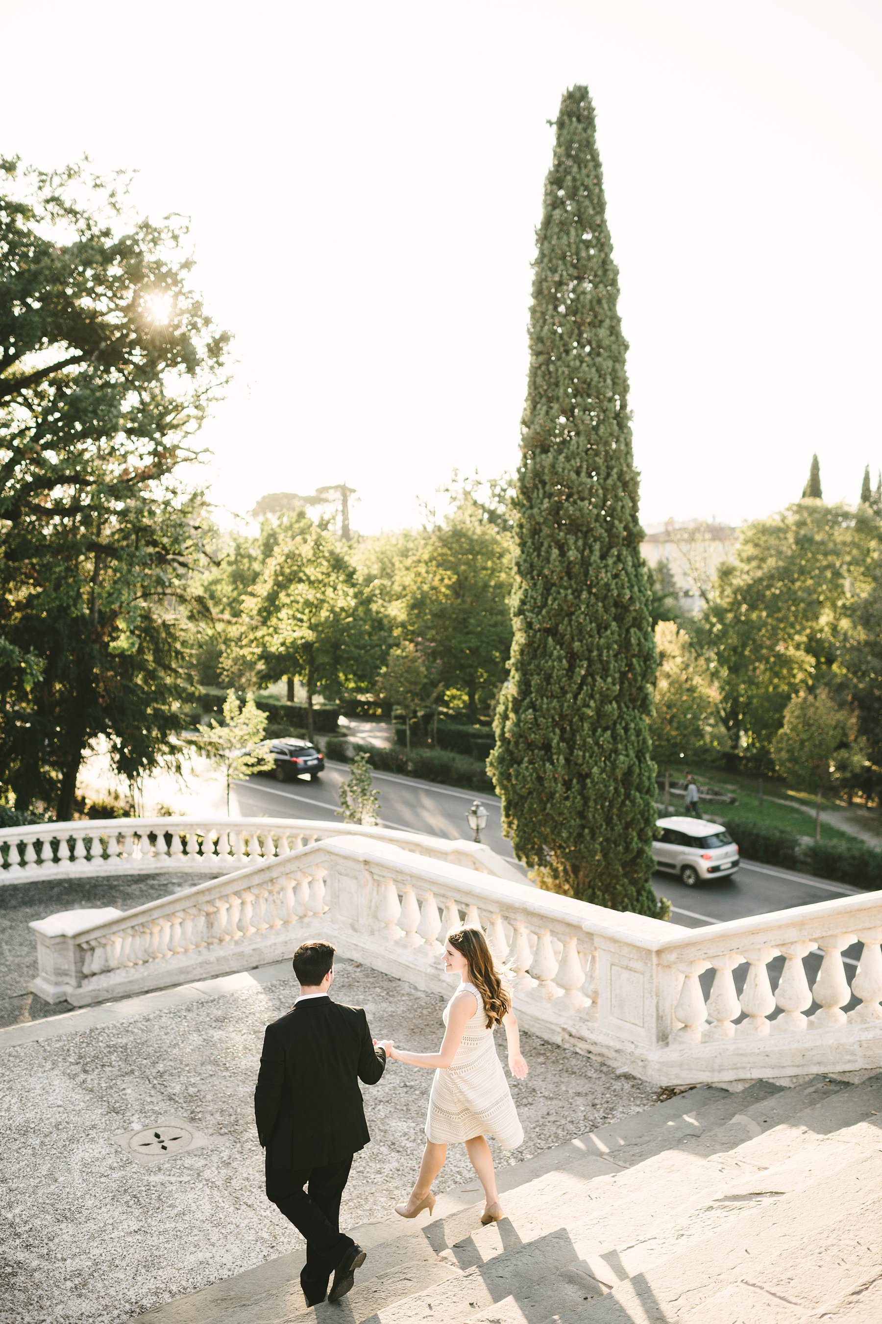 Foto di fidanzamento a Firenze: così romantiche! Kaitlyn e Marshall hanno scelto Firenze per le loro foto di fidanzamento – e le vacanze! – e sono venuti dal Missouri per sperimentare personalmente il fascino della città. Coppia cammina giù per le scale di San Miniato per una splendida e adorabile foto di fidanzamento durante il tramonto. Foto del fotografo creativo per coppie in vacanza in Toscana, con base a Firenze Gabriele Fani