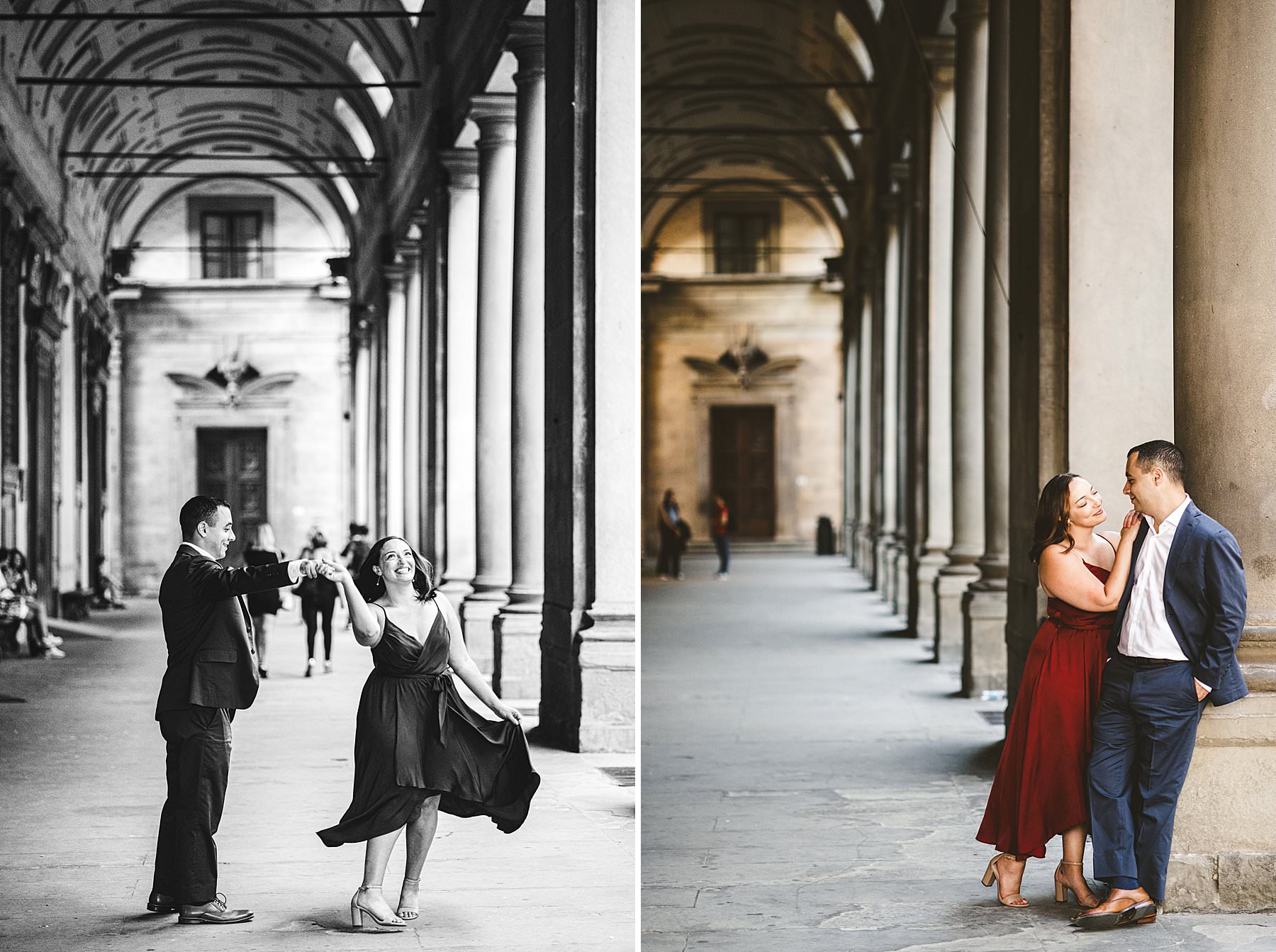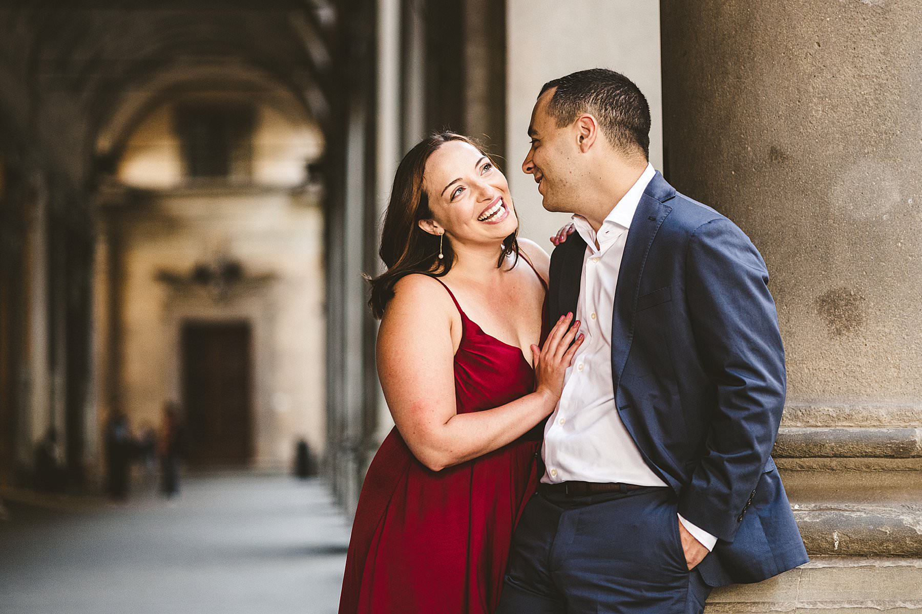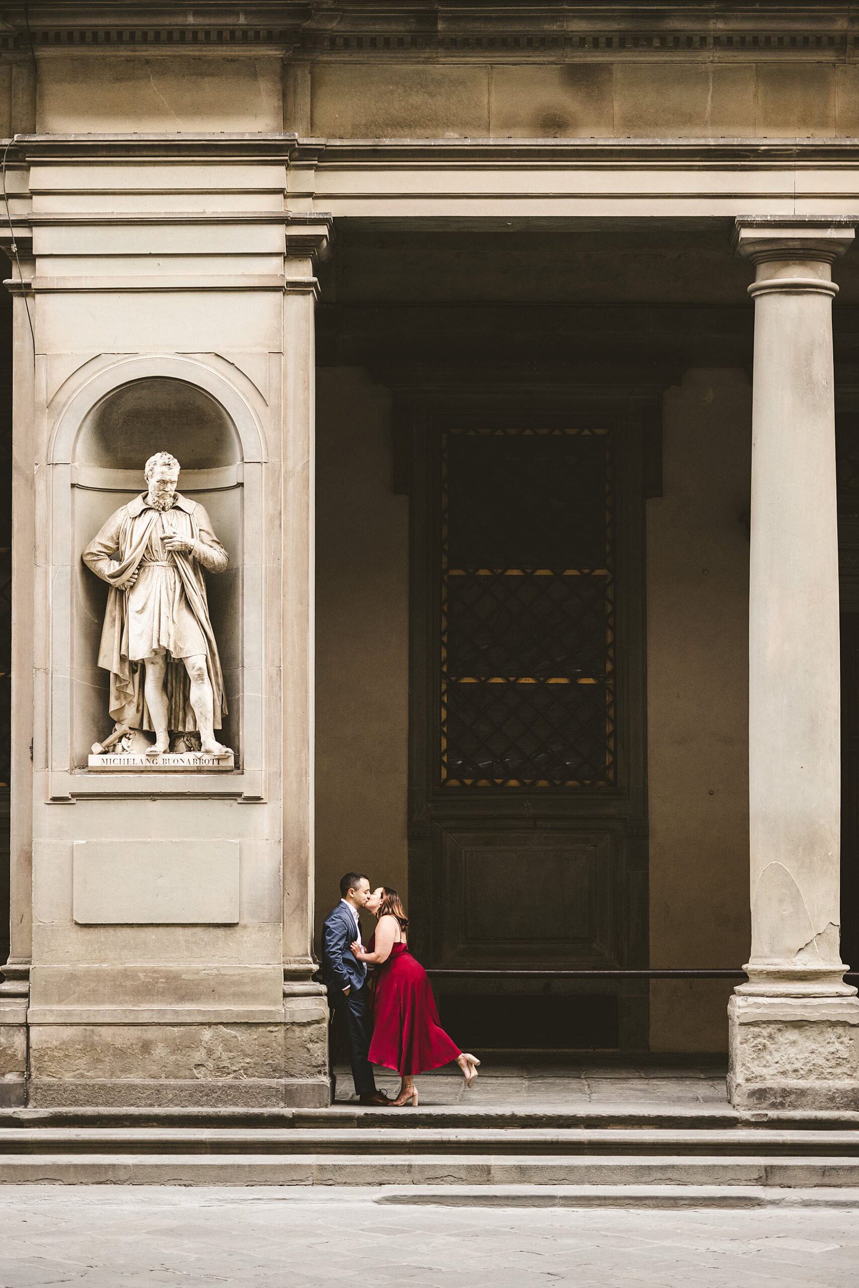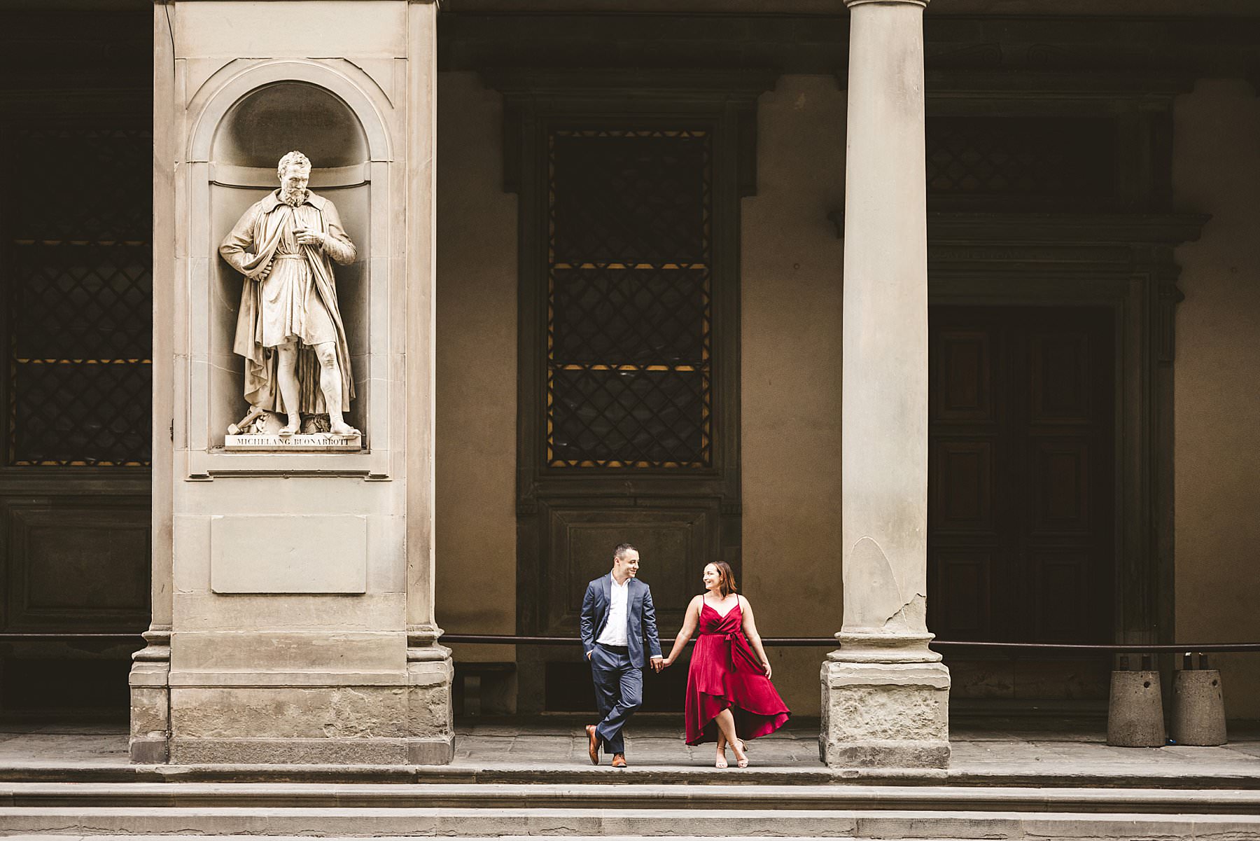Exciting couple portrait pre-wedding photo shoot in the Uffizi Art Gallery located in the heart of Florence, Tuscany. Photo by the Italian engagement photographer in Tuscany based Florence Gabriele Fani