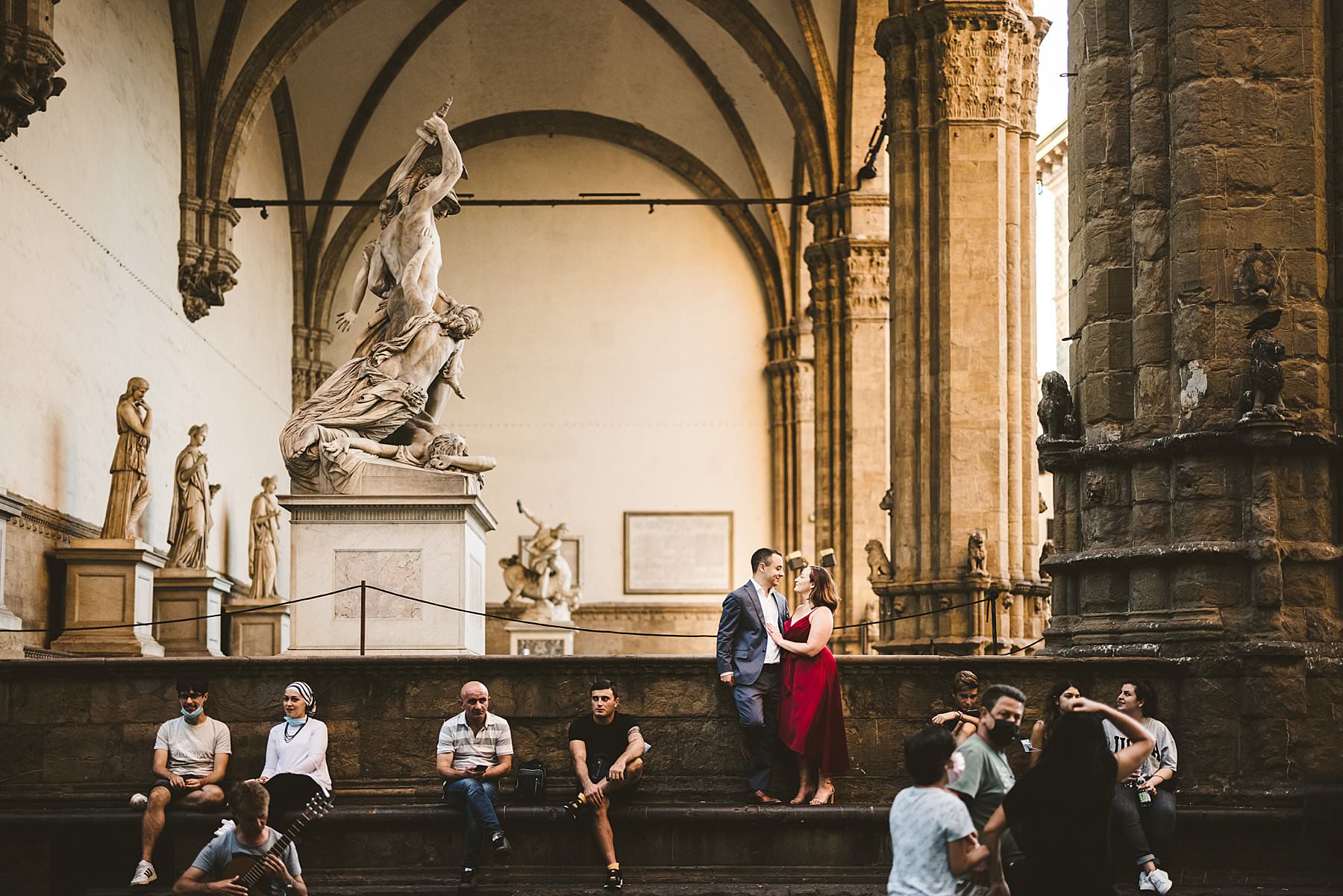 Romantic and lovely couple portrait photo session in Florence near Palazzo Vecchio and Loggia Lanzi. Photo by the Italian engagement photographer in Tuscany based Florence Gabriele Fani