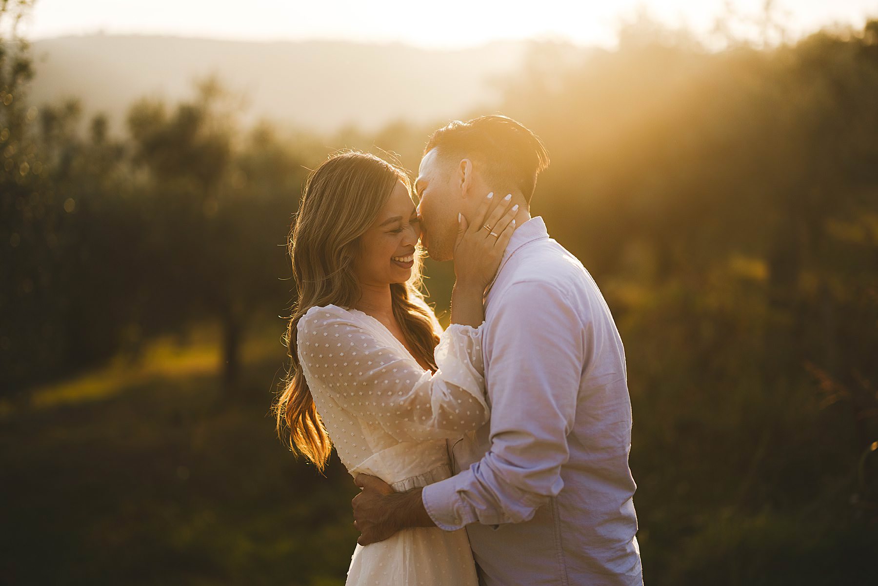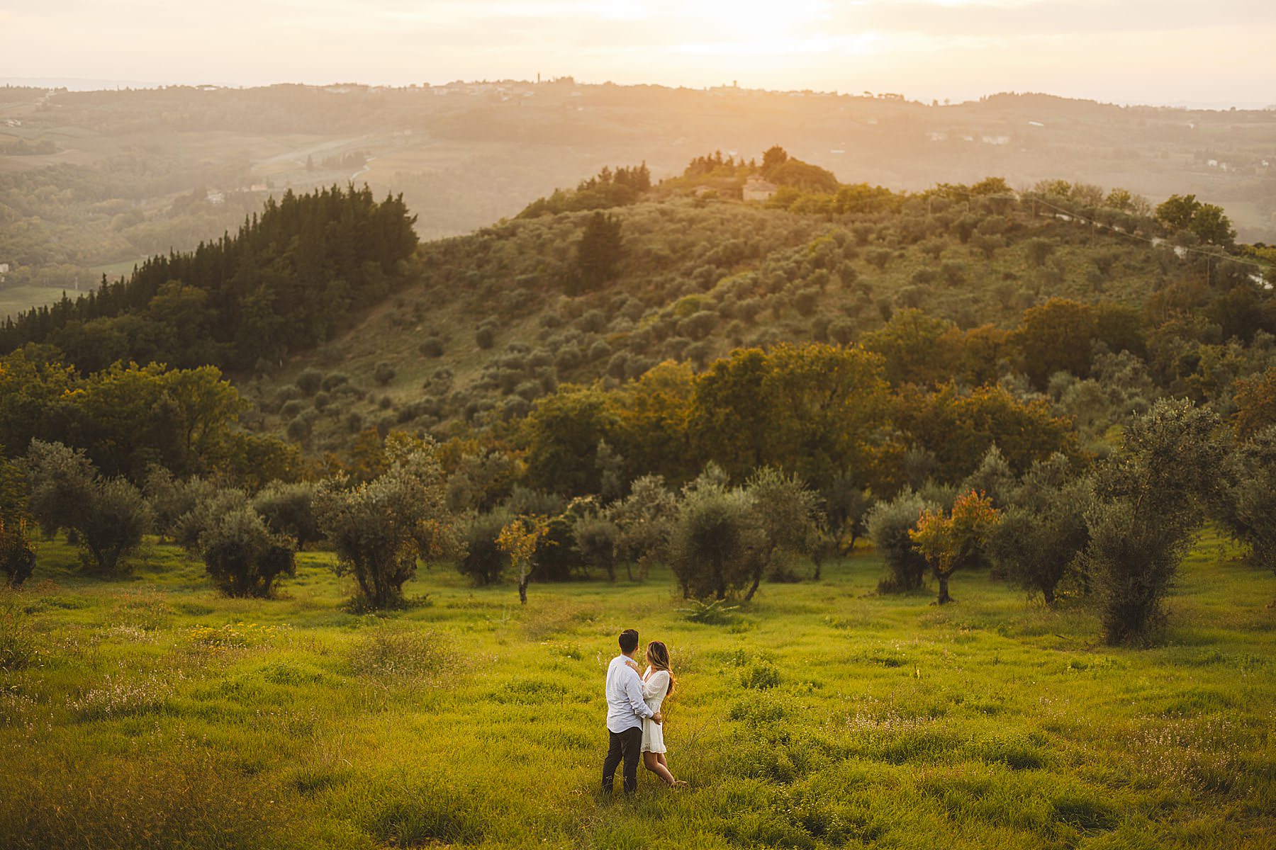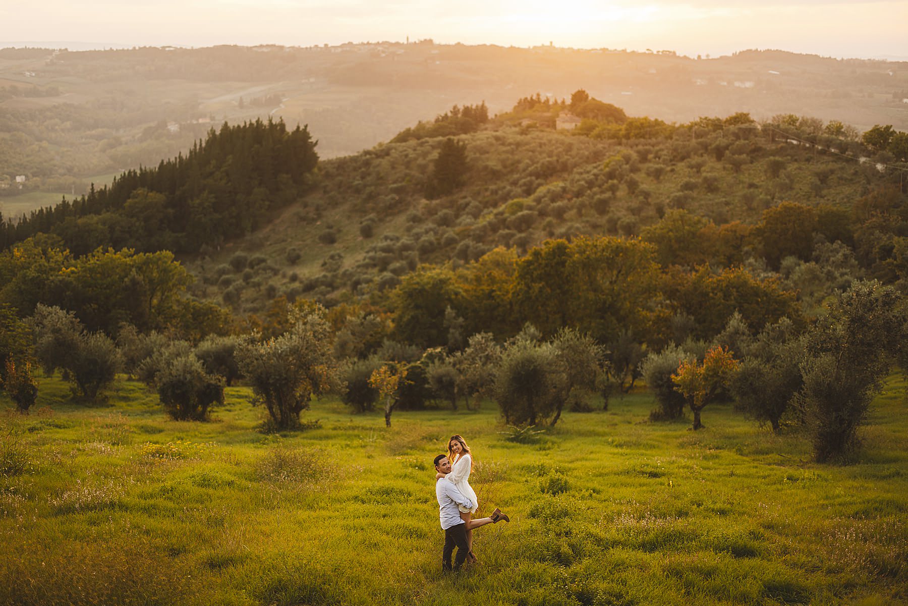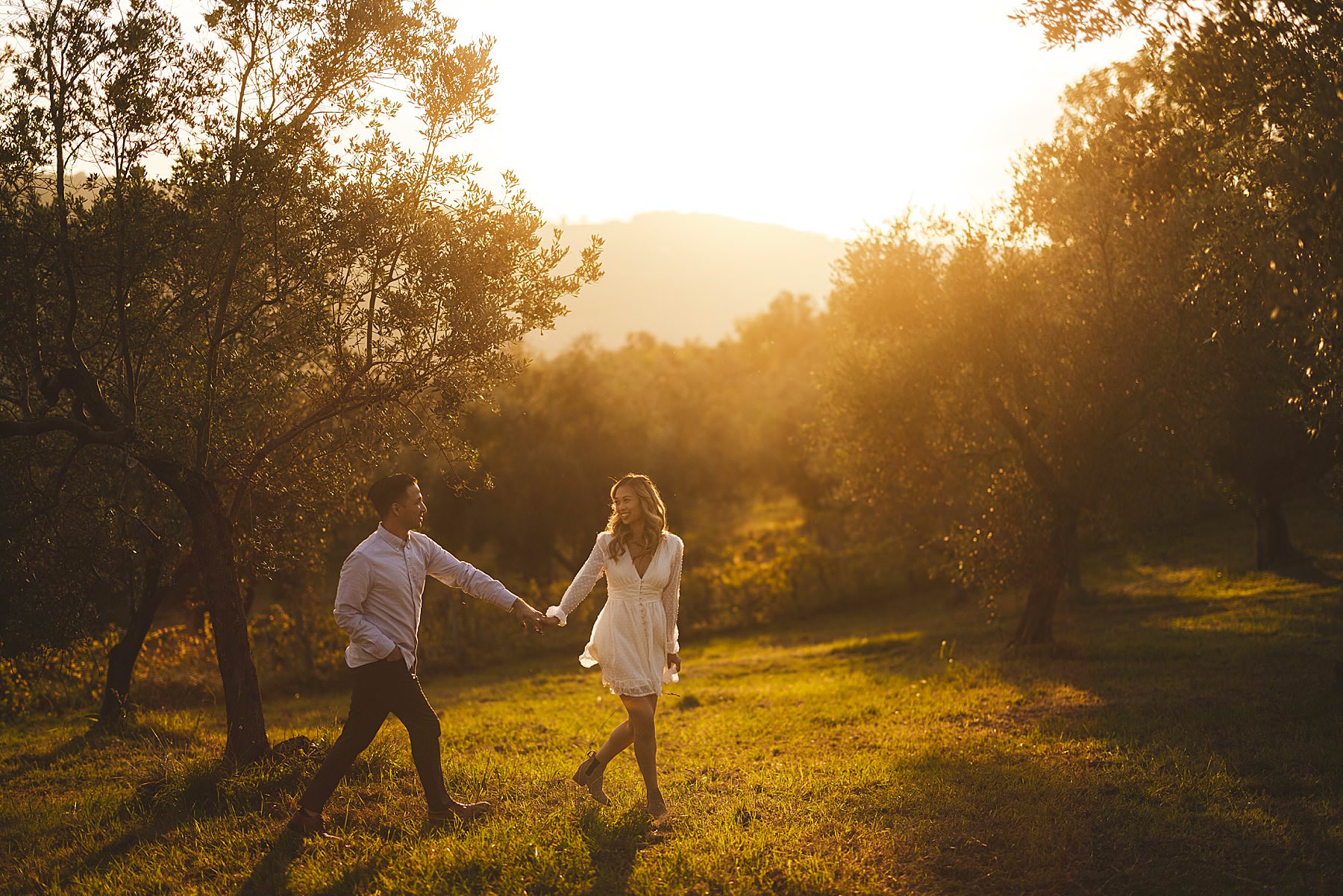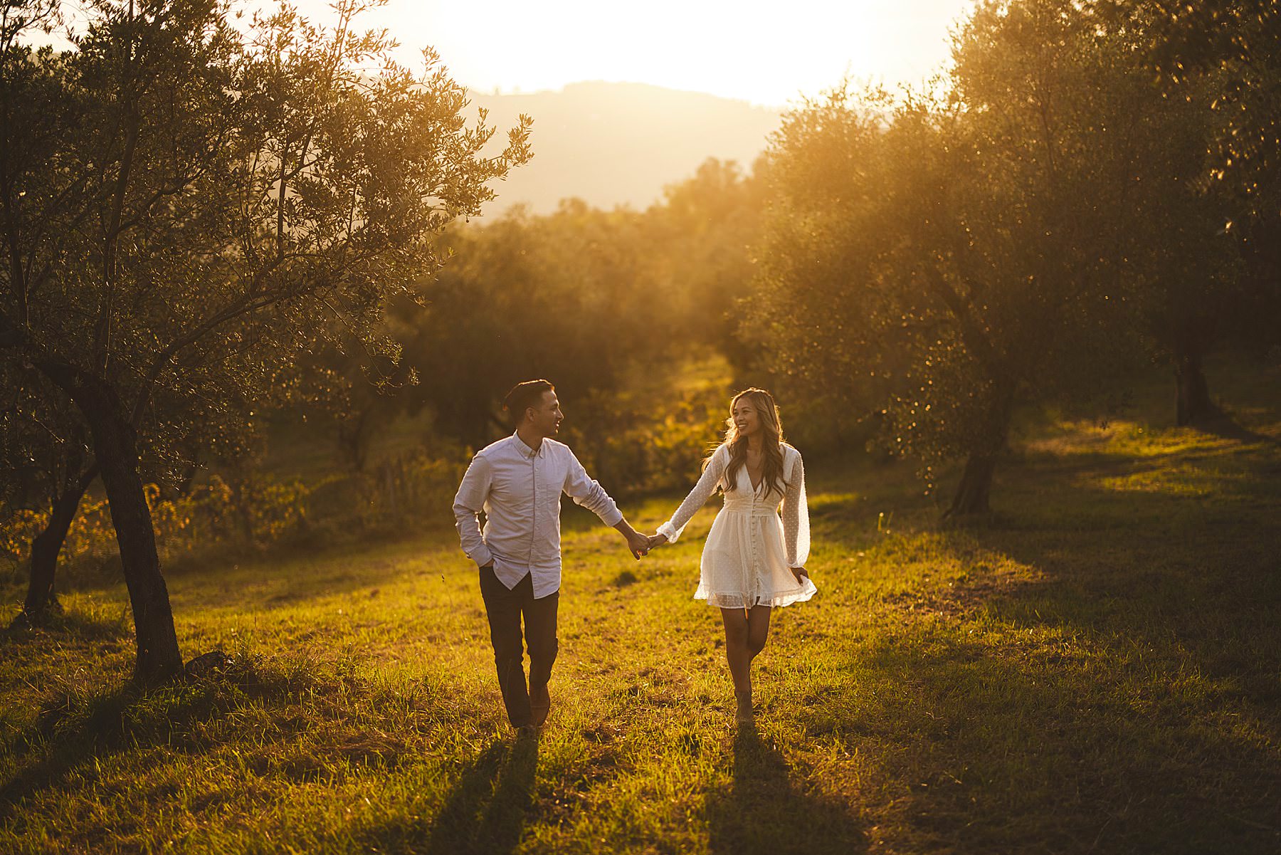 From the very first moment of the session, an air of harmony and authenticity enveloped the couple, as they radiated a genuine and carefree spirit. The Tuscan sun illuminated the golden hour perfectly, gilding the olive fields with a warm, dreamlike glow, and providing the ideal backdrop for this mesmerizing prewedding photograph experience.