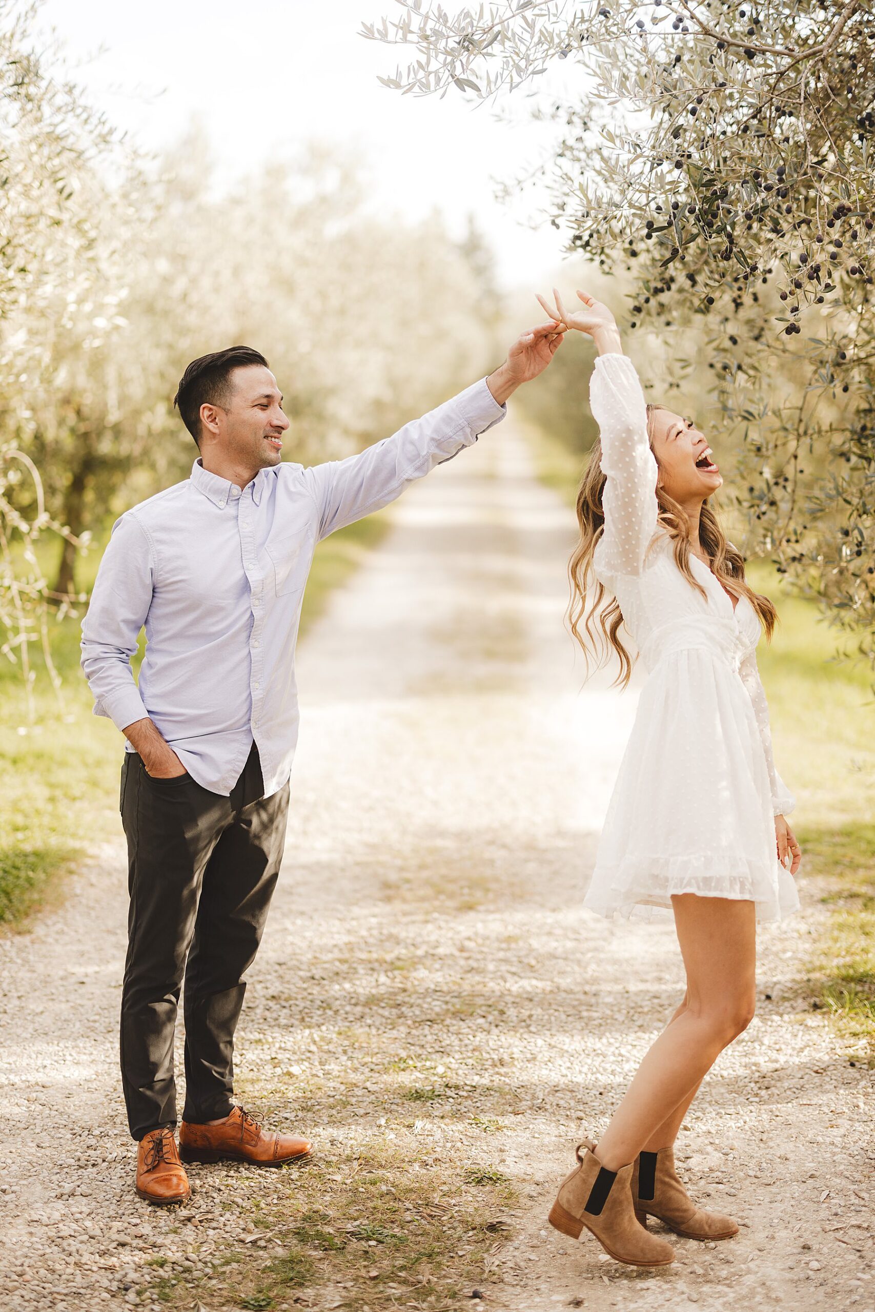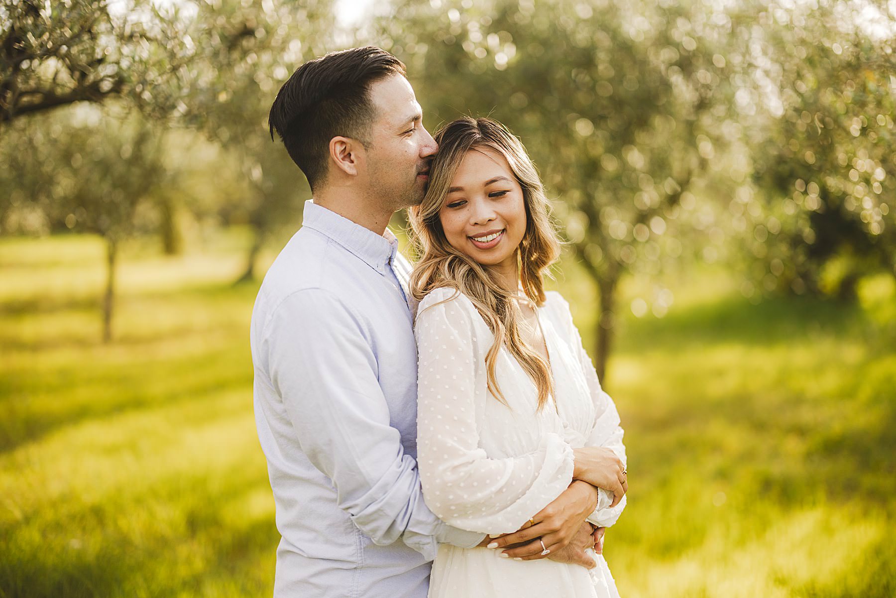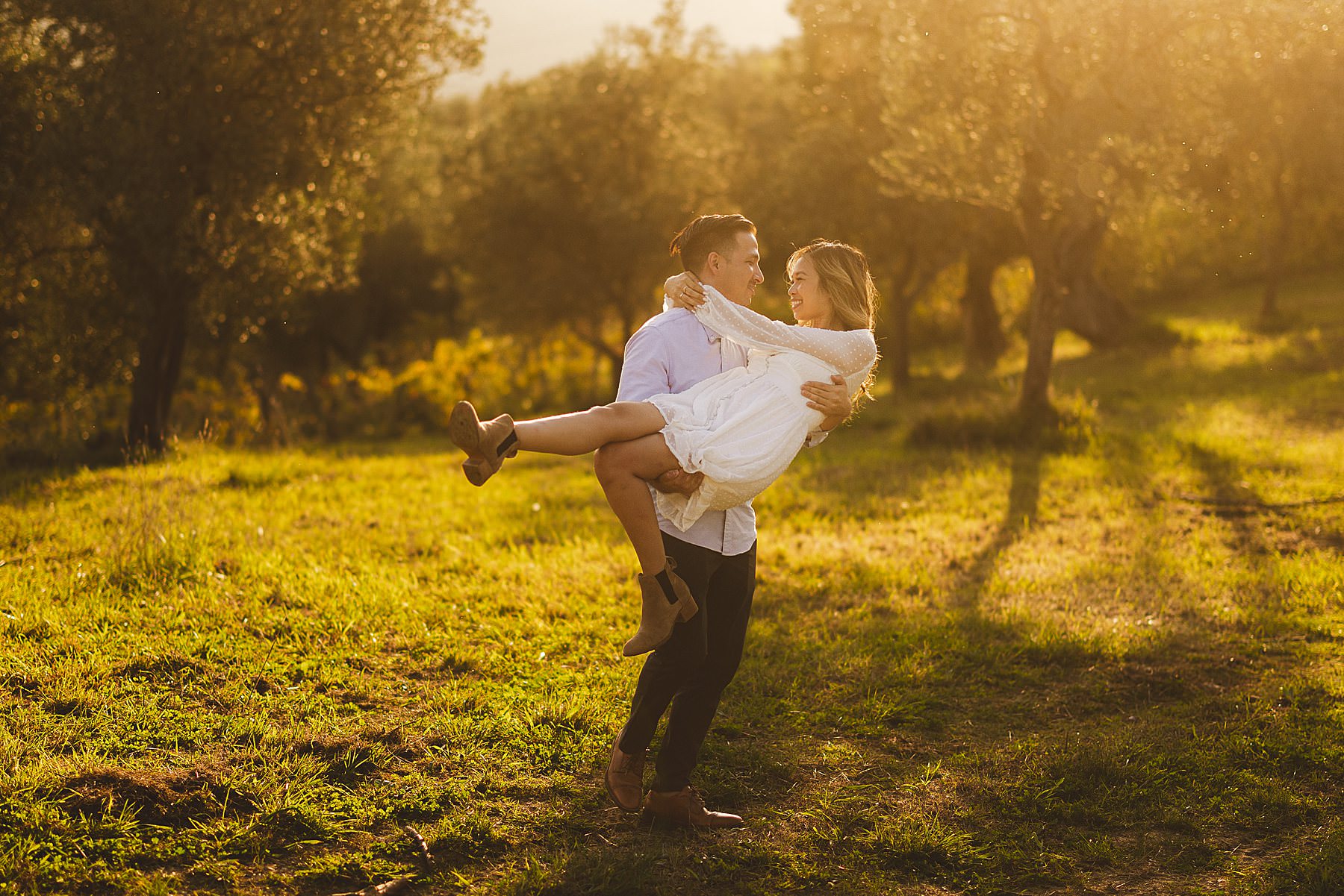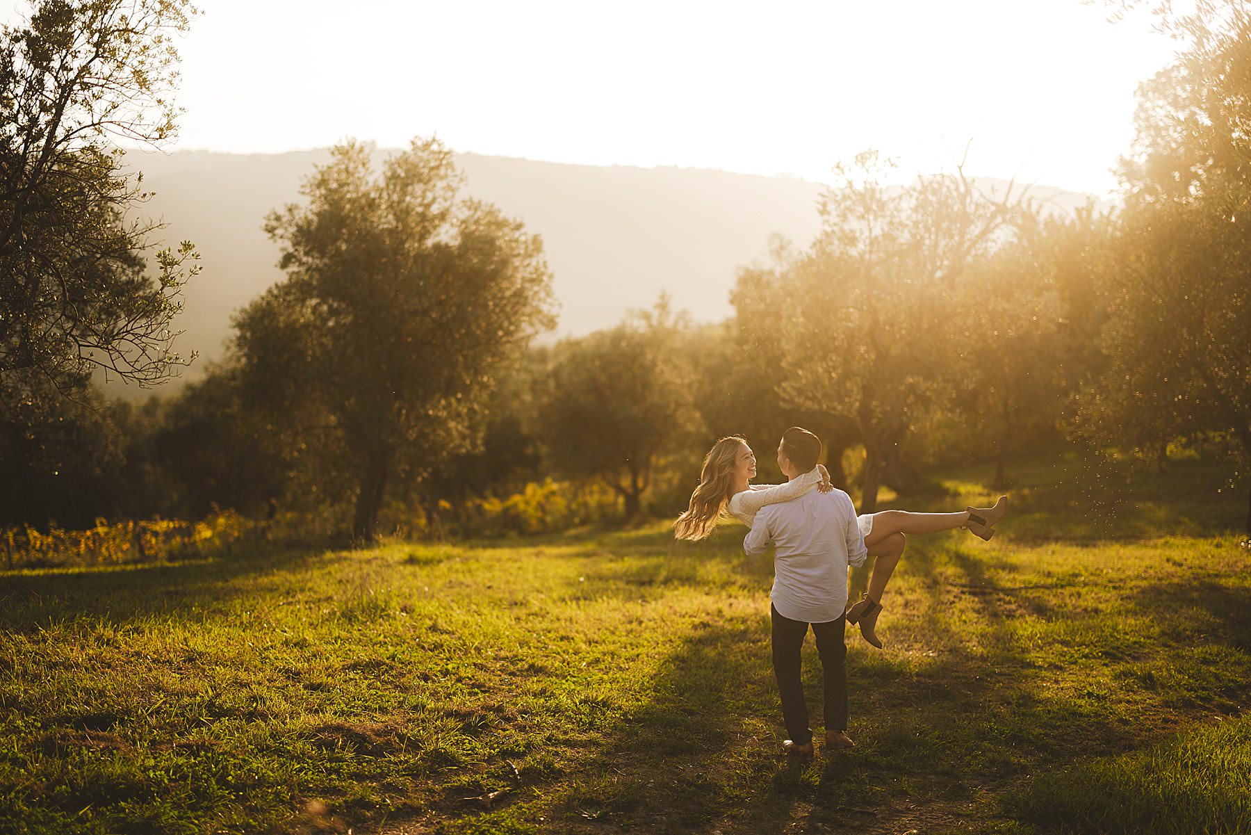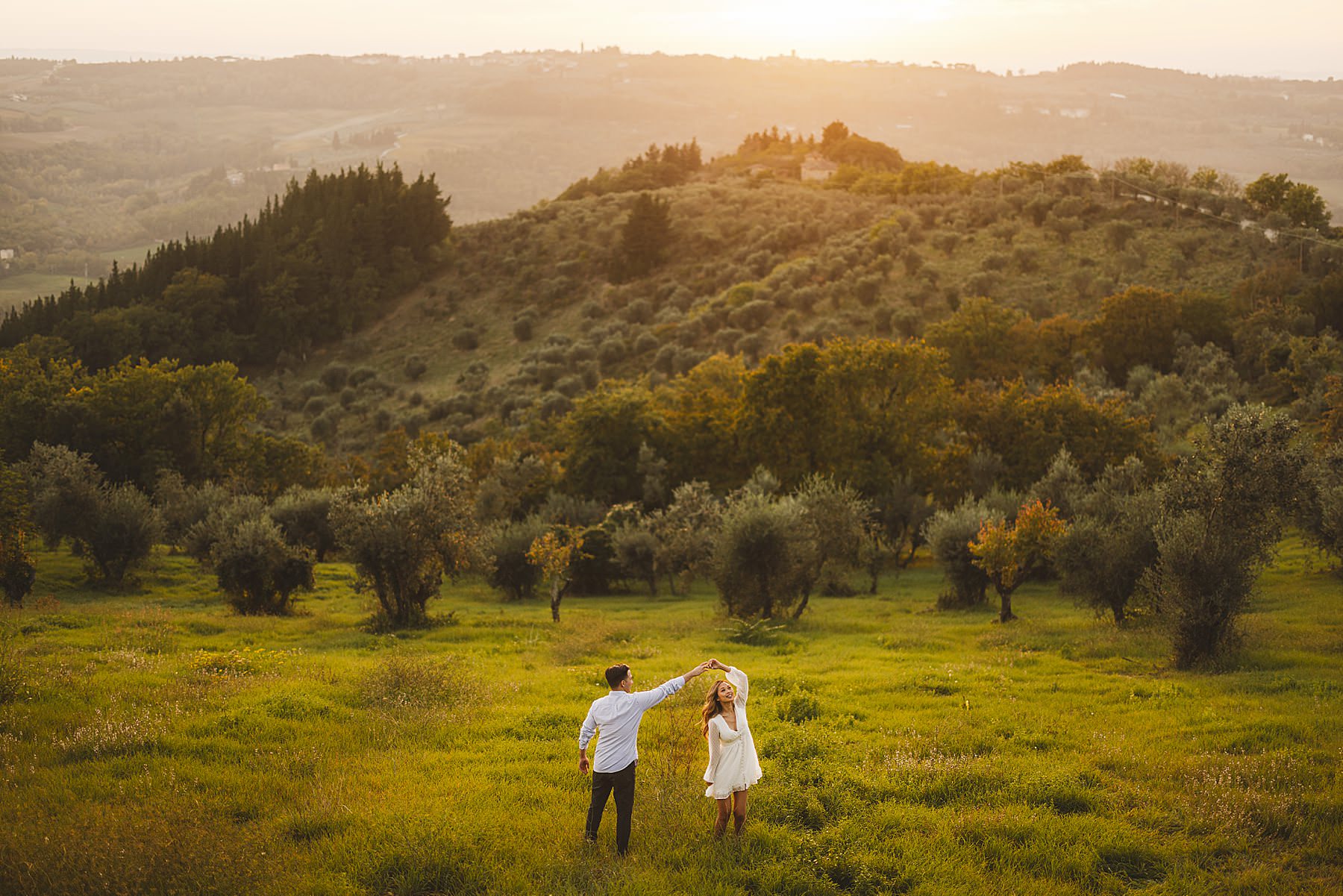 From the very first moment of the session, an air of harmony and authenticity enveloped the couple, as they radiated a genuine and carefree spirit. The Tuscan sun illuminated the golden hour perfectly, gilding the olive fields with a warm, dreamlike glow, and providing the ideal backdrop for this mesmerizing prewedding photograph experience.