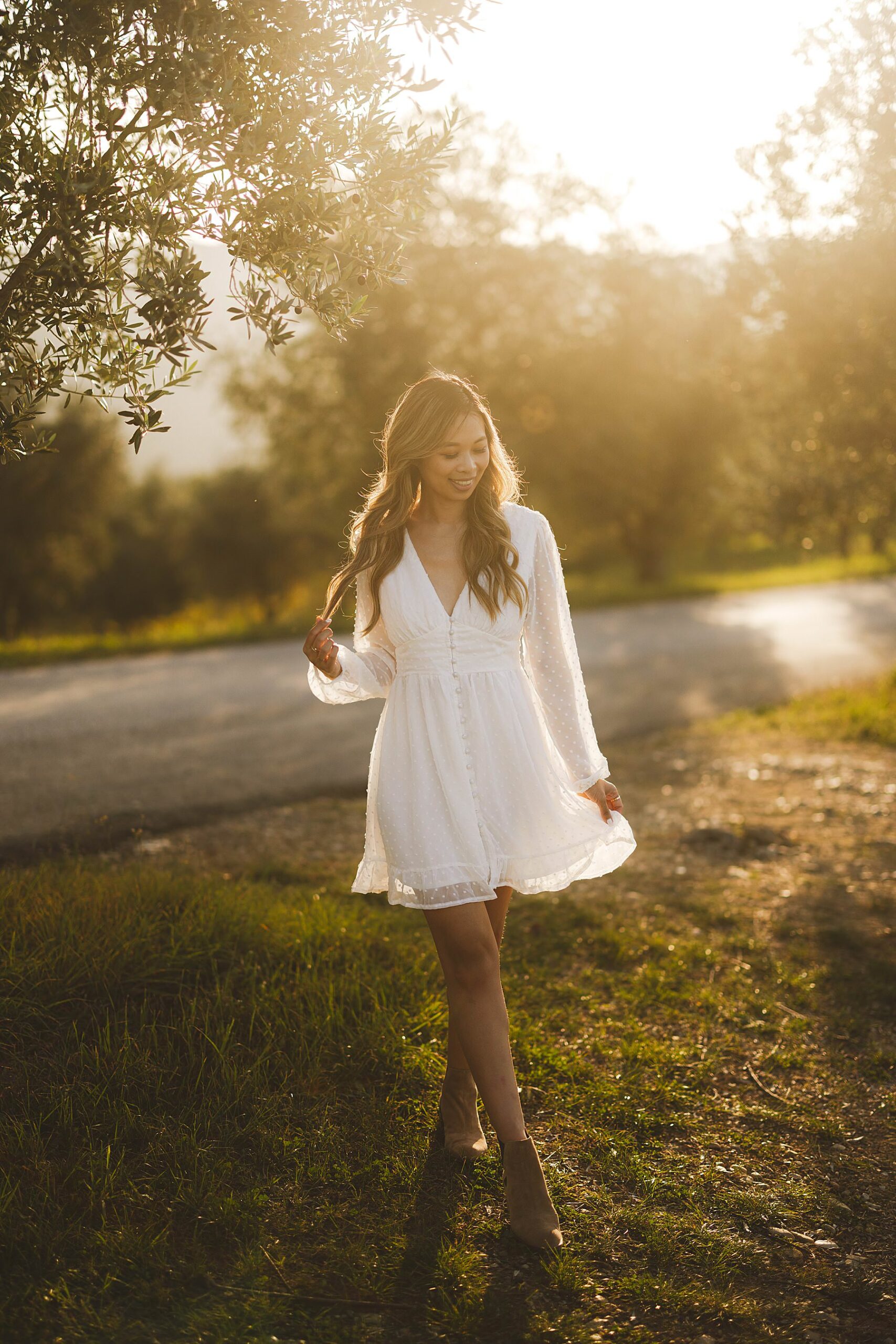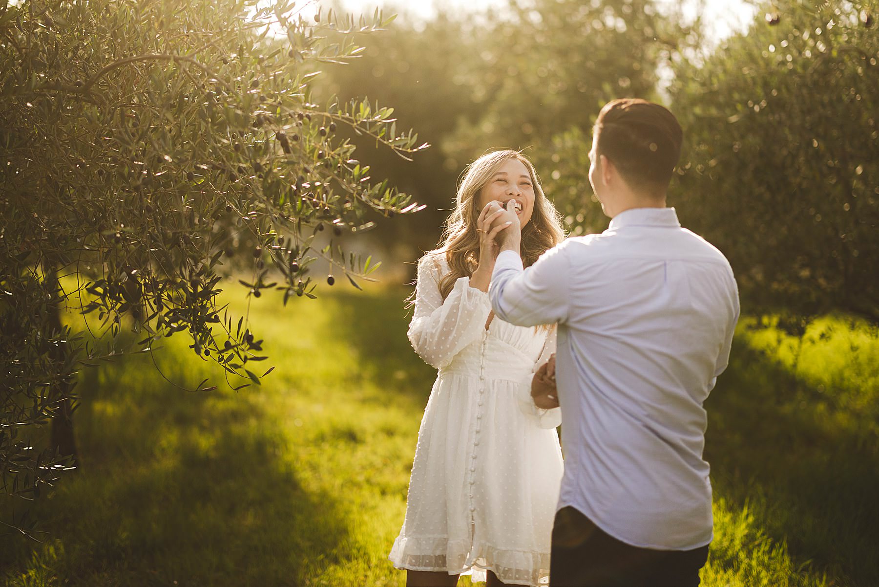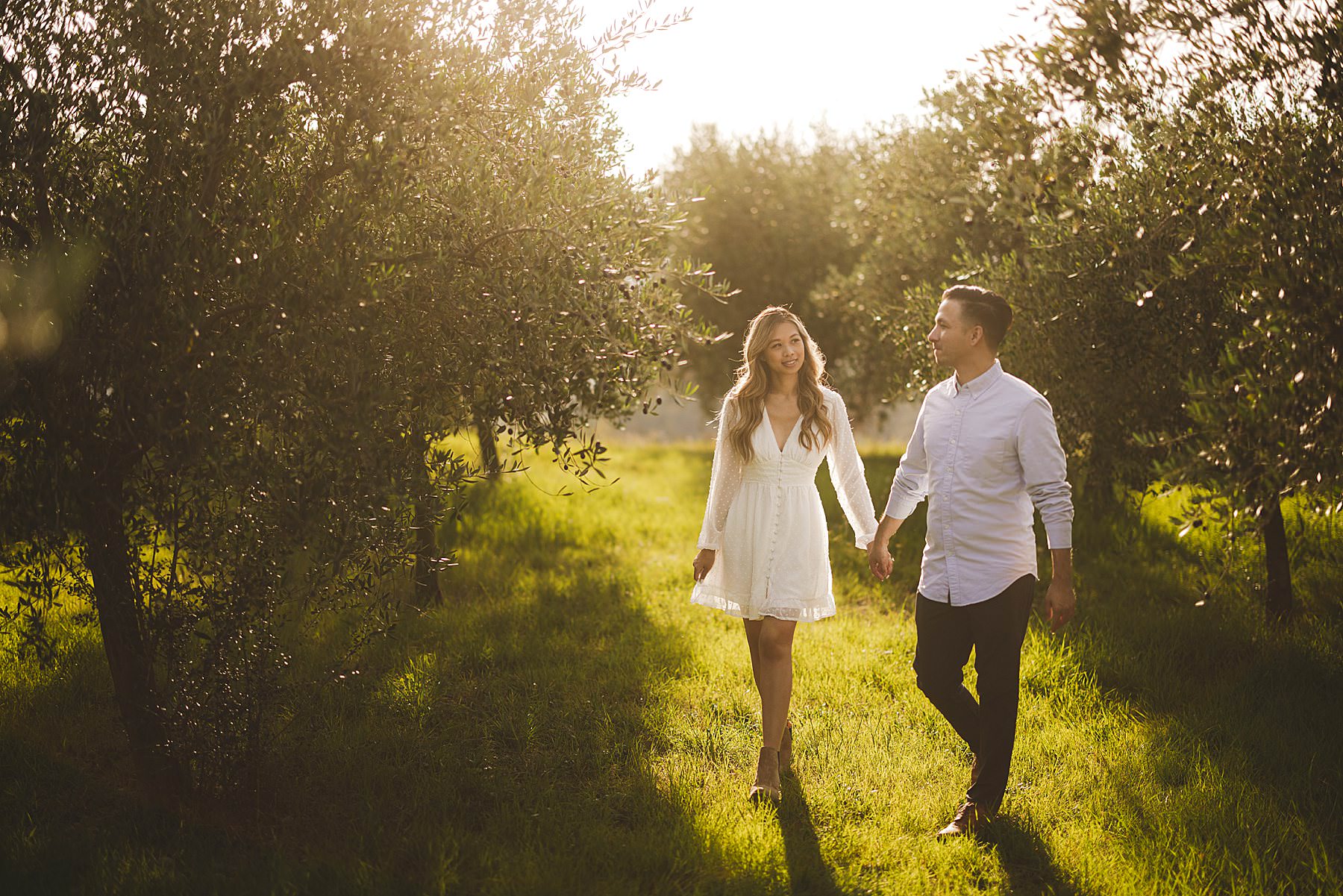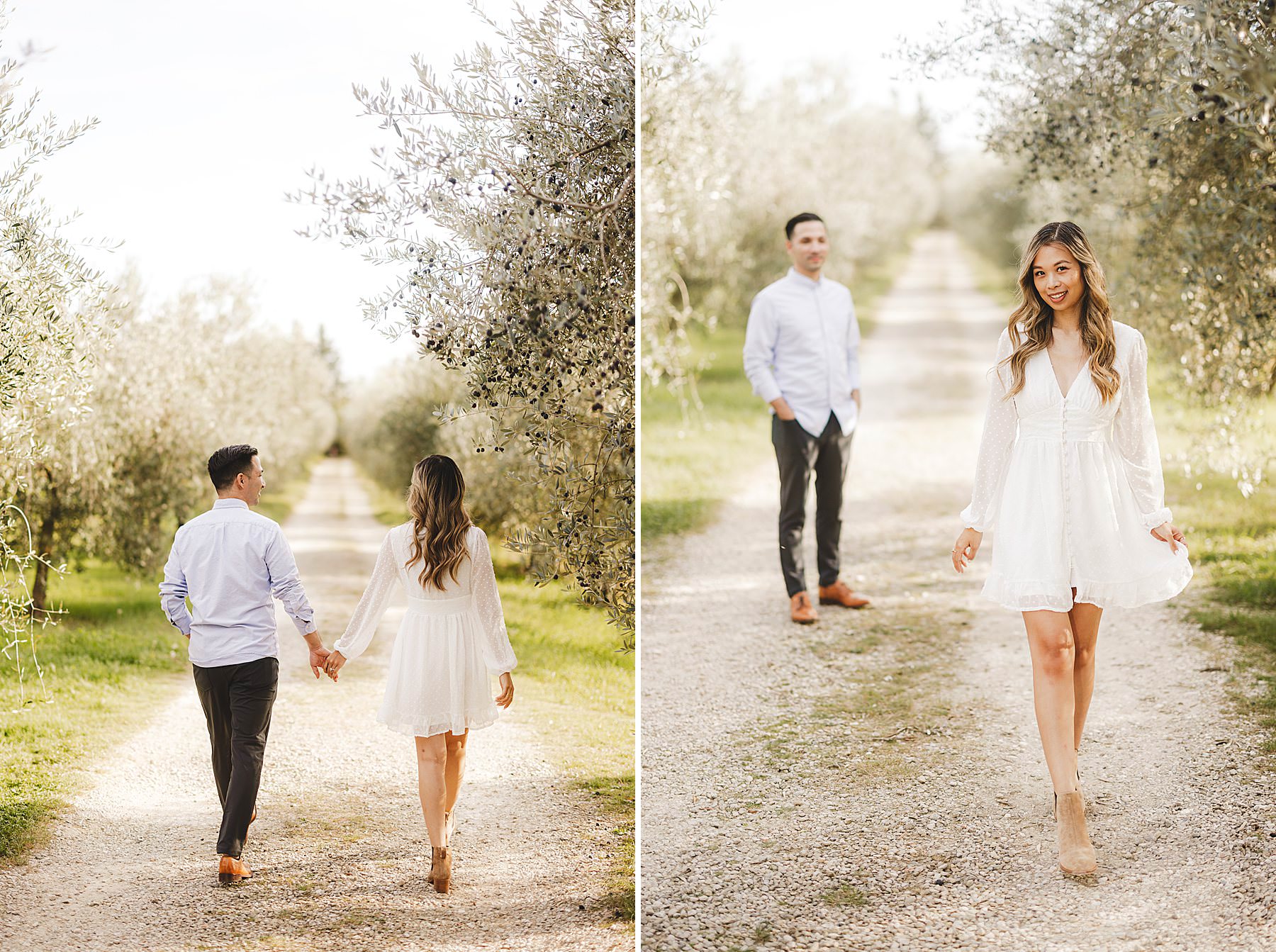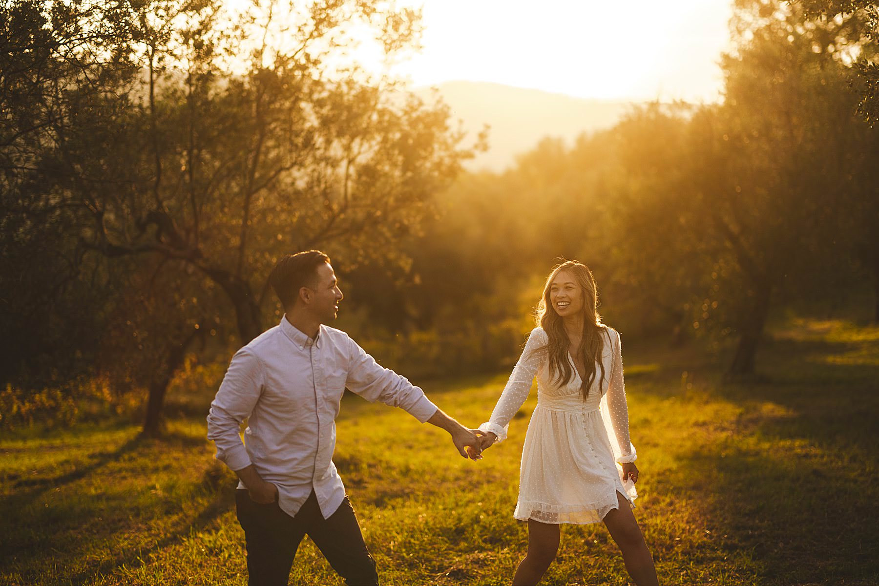 From the very first moment of the session, an air of harmony and authenticity enveloped the couple, as they radiated a genuine and carefree spirit. The Tuscan sun illuminated the golden hour perfectly, gilding the olive fields with a warm, dreamlike glow, and providing the ideal backdrop for this mesmerizing prewedding photograph experience.