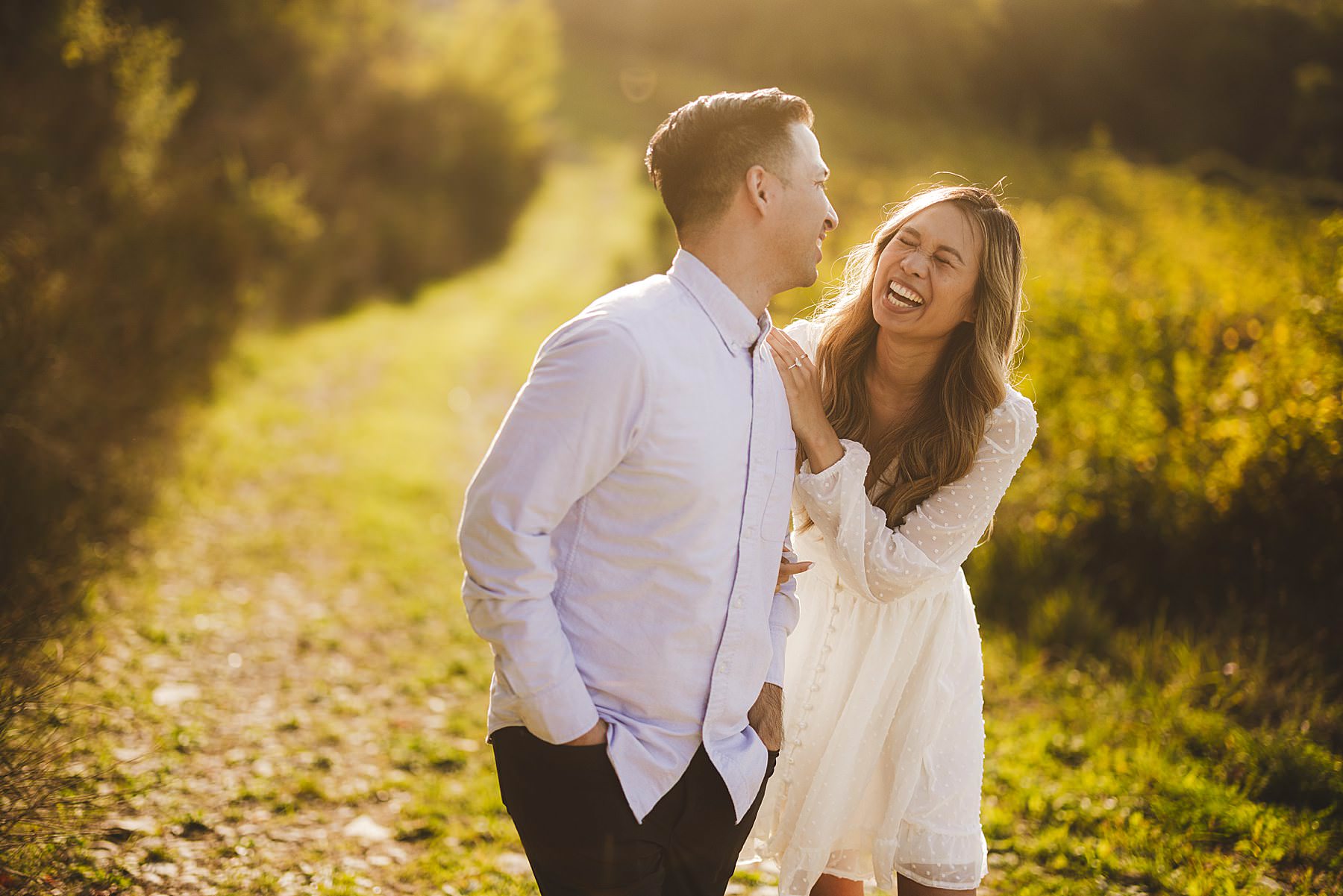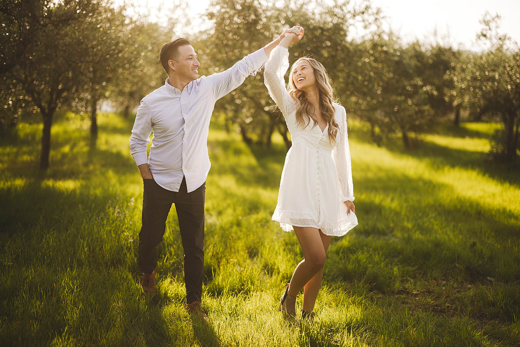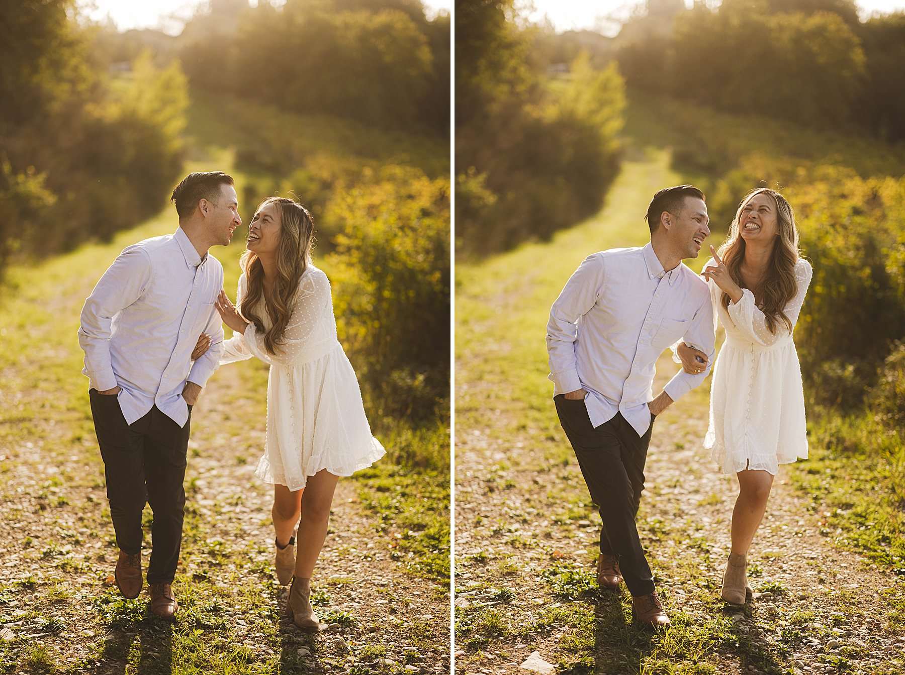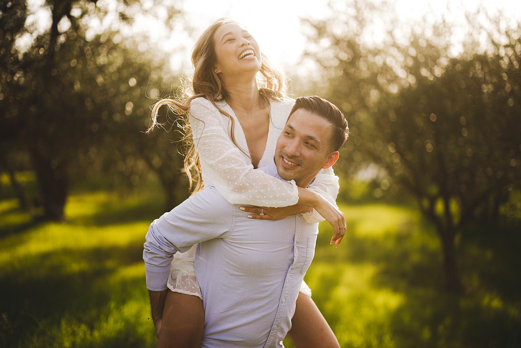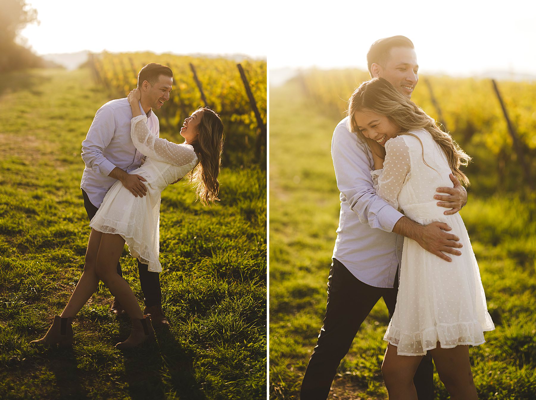Fun loving and spontaneous couple during engagement photo session in the Chianti countryside during golden hour. Photo by the Italian elegant engagement photographer in Tuscany based Florence Gabriele Fani